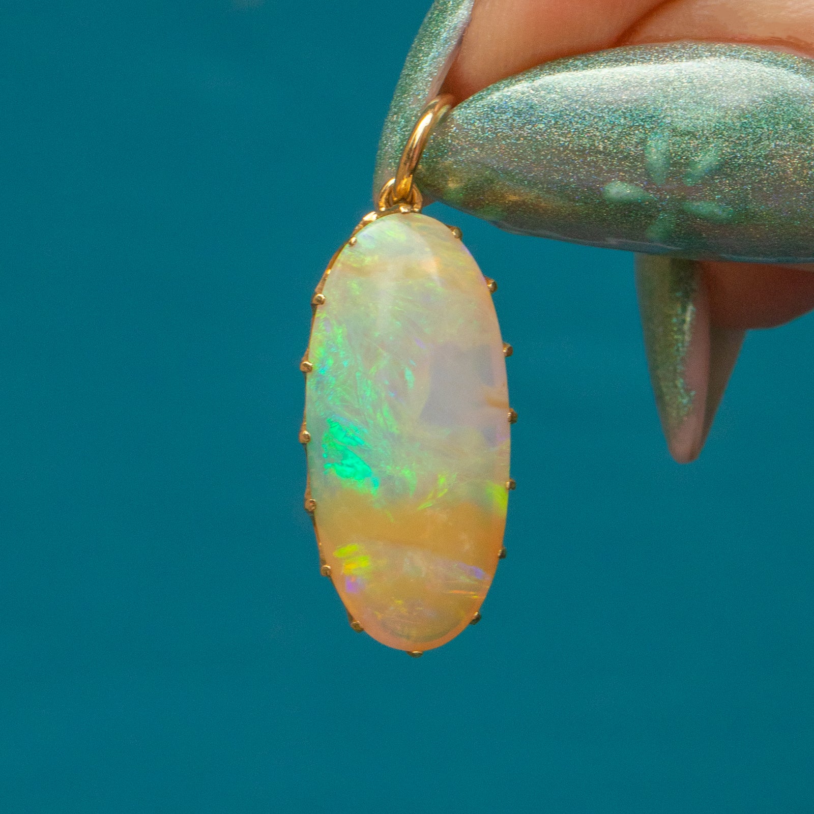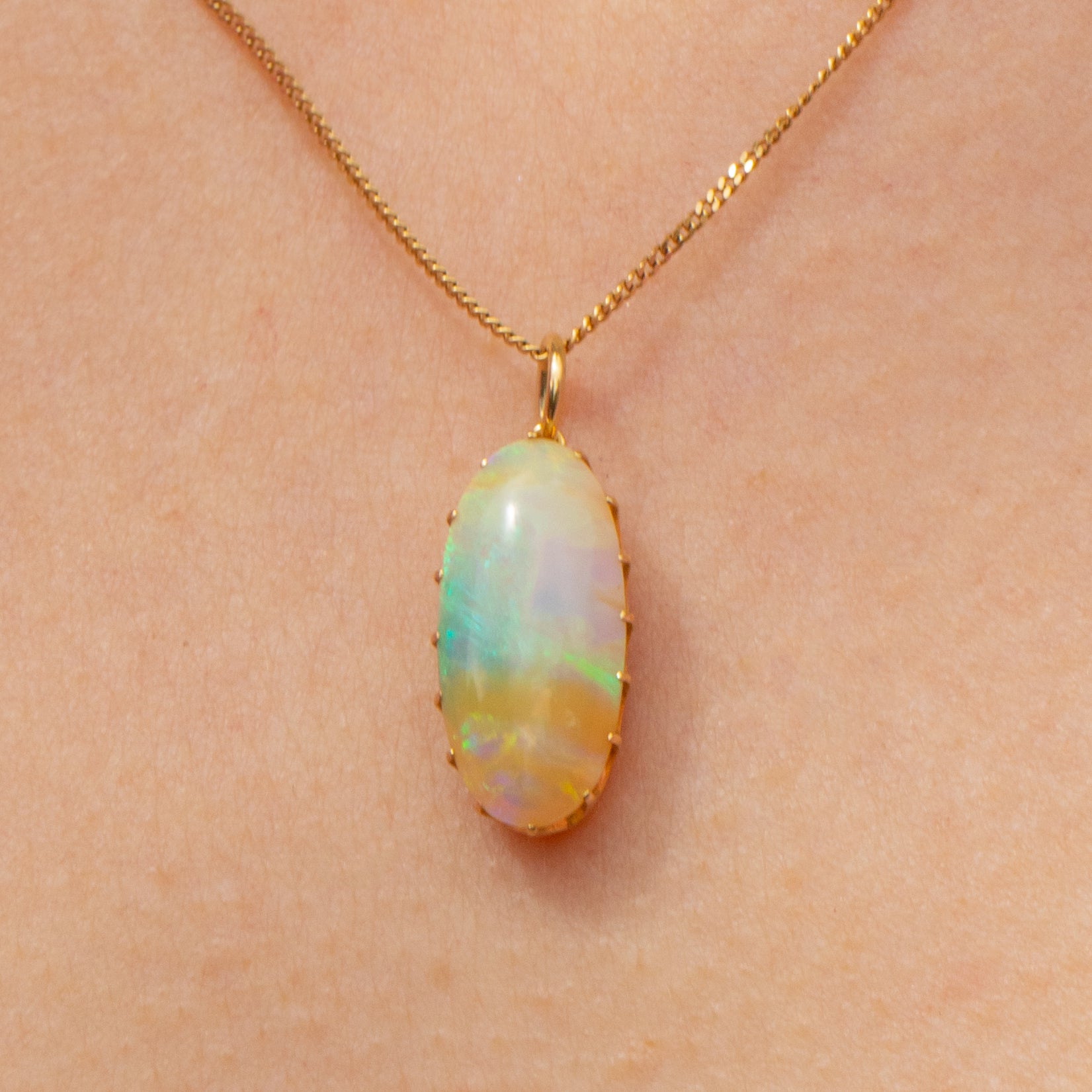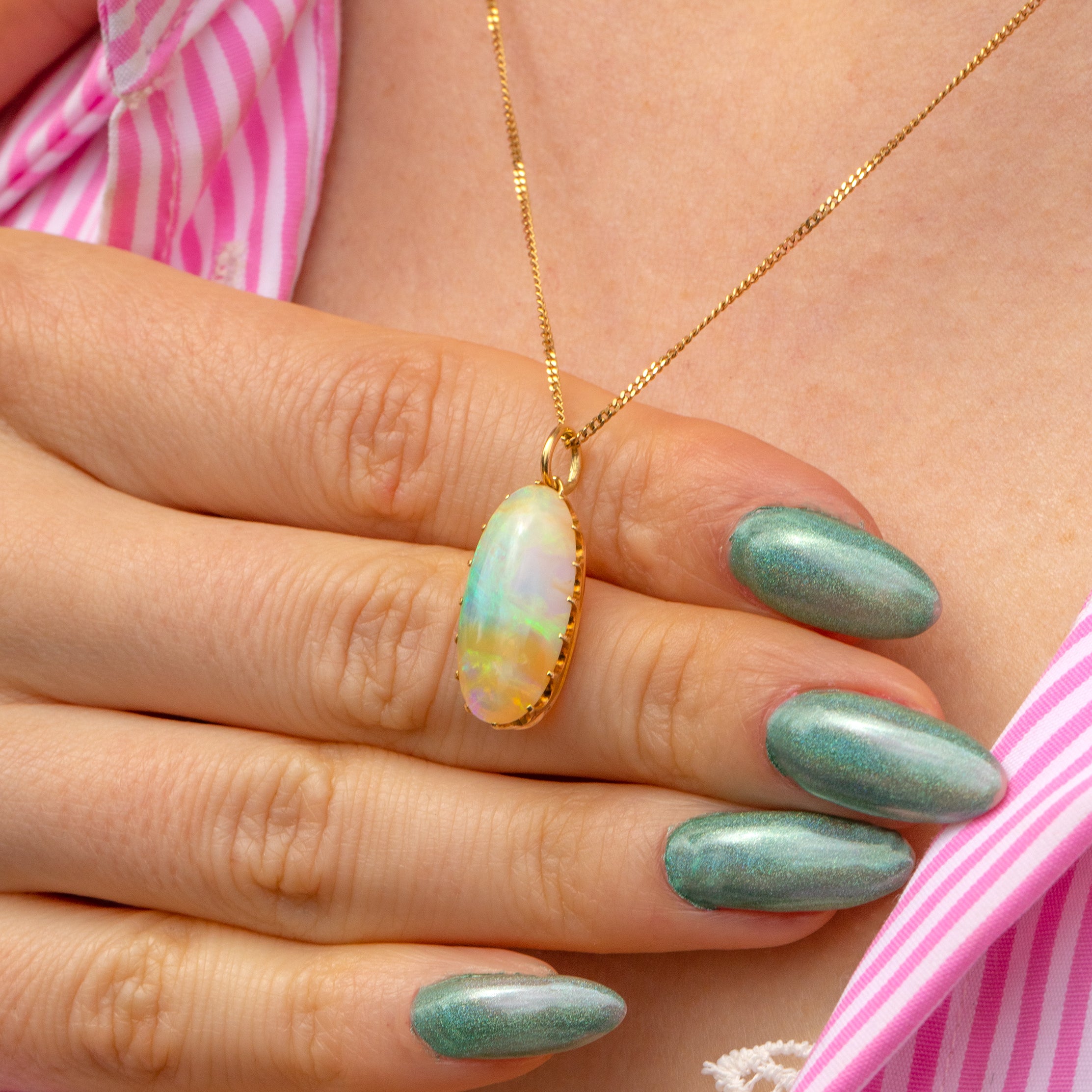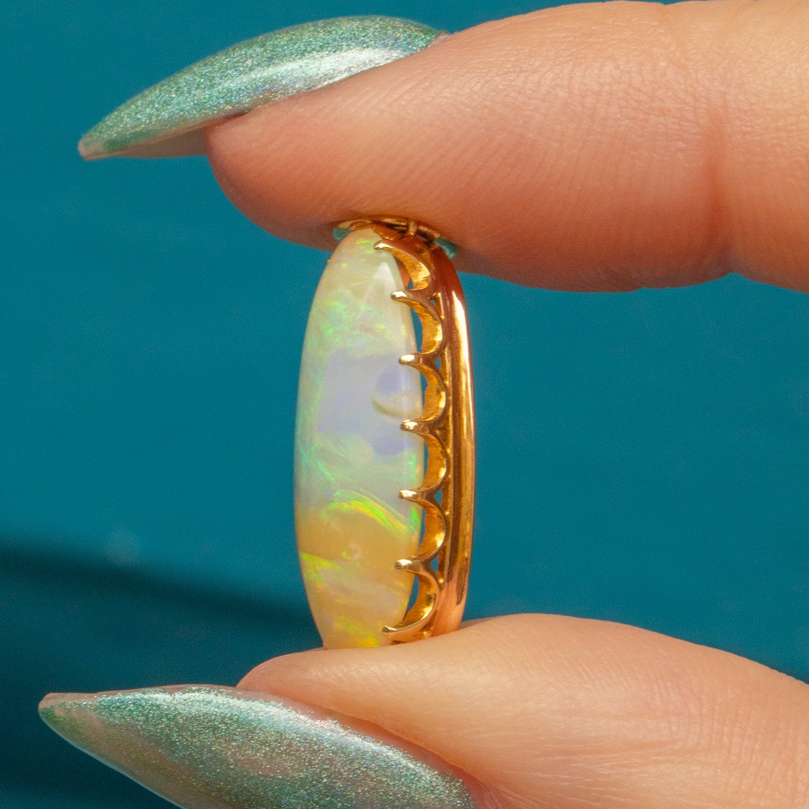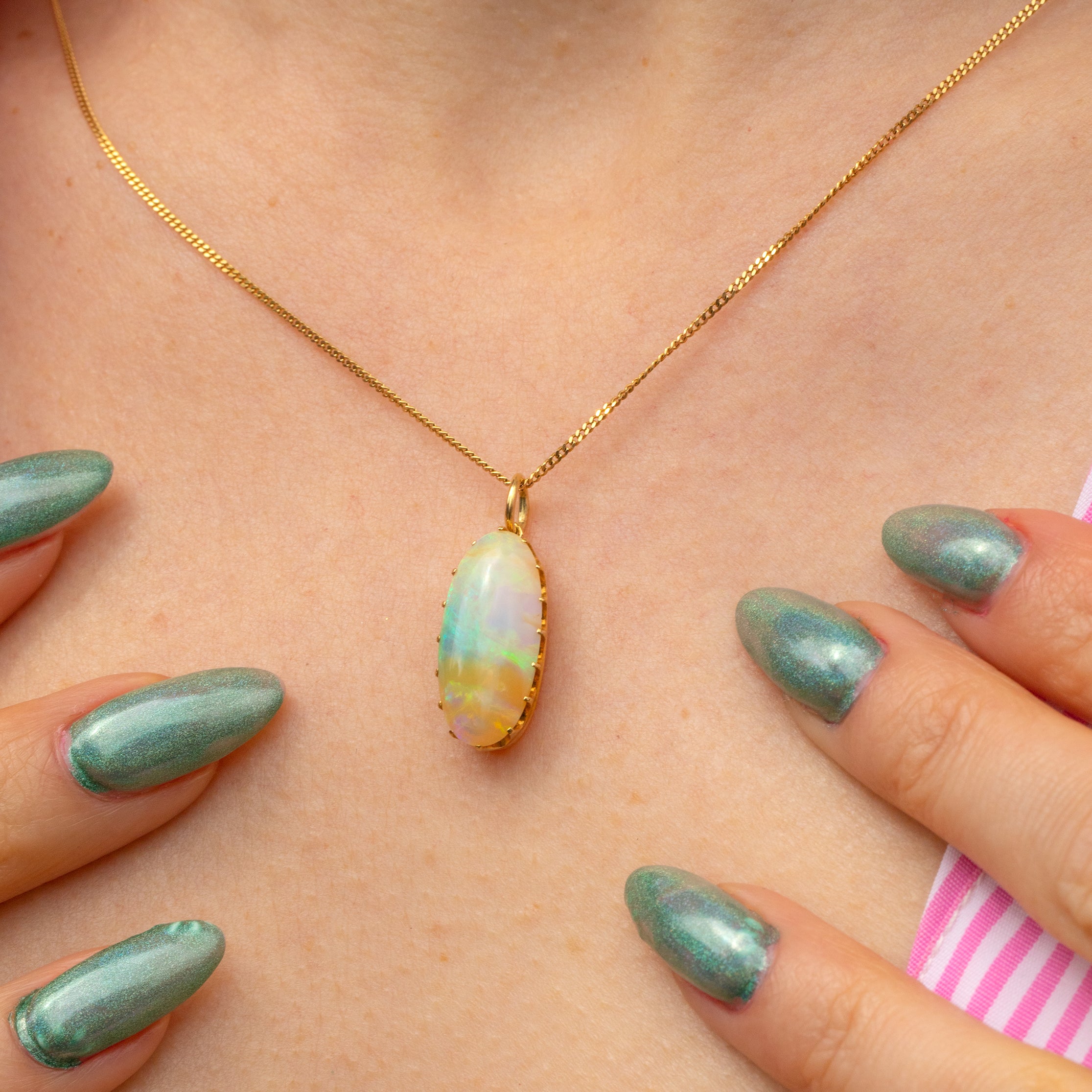 This antique 18ct Gold Opal pendant is 5.25ct of completely natural beauty! This Opal treasure takes a smooth cabochon-cut form, infused with an incredible play of colour. Within the Opal are sandy yellows and cerulean blue hues, akin to the tropical shore of a deserted island!