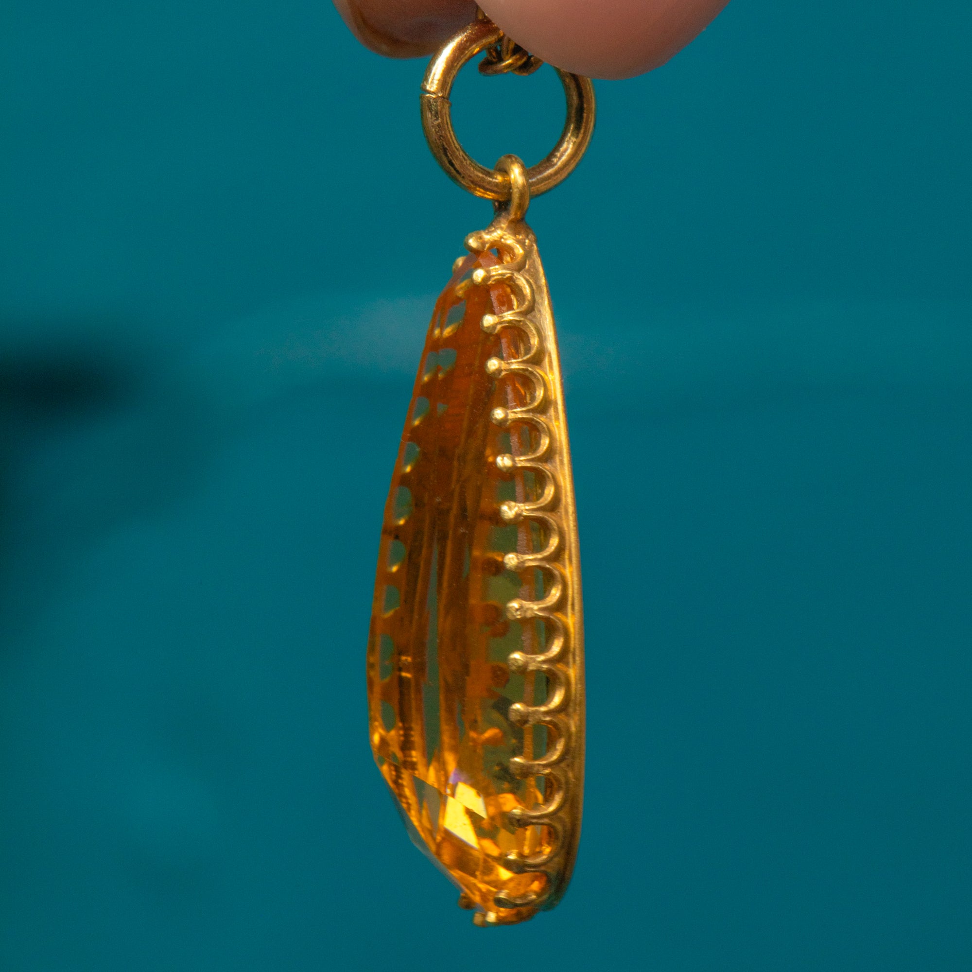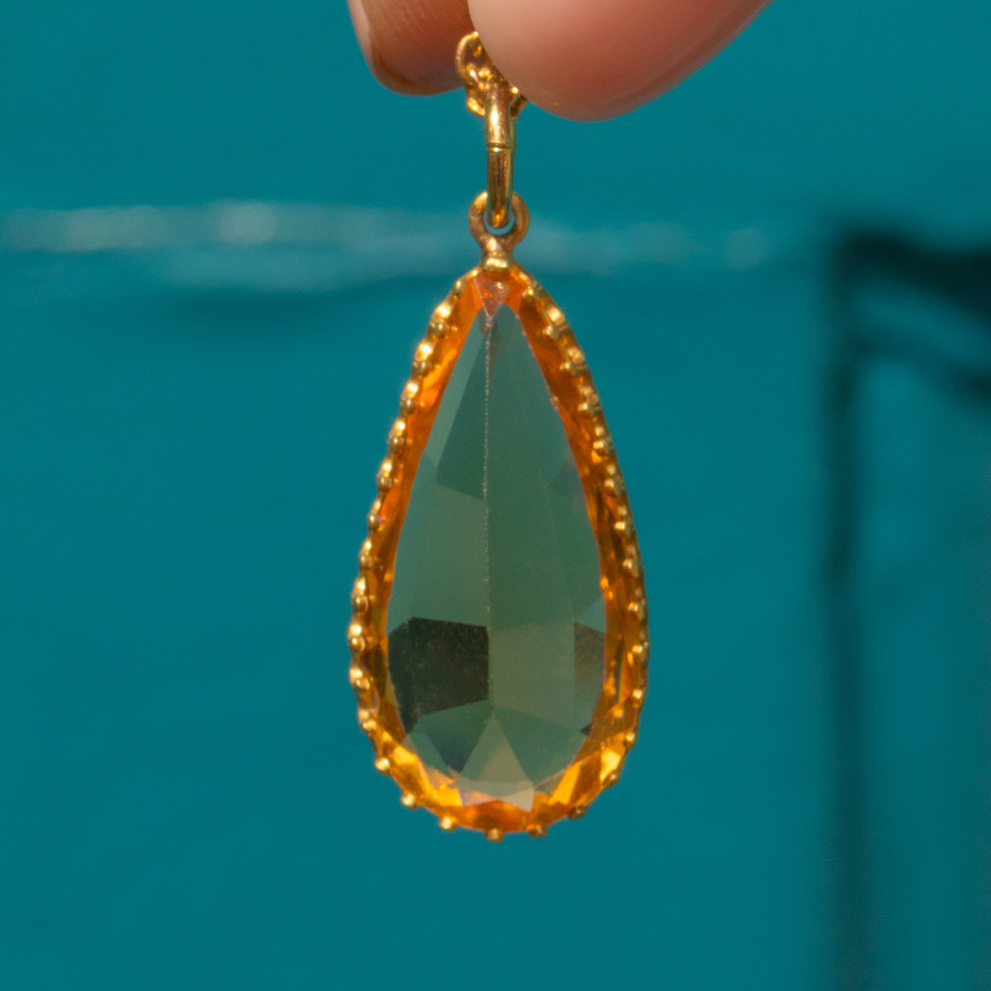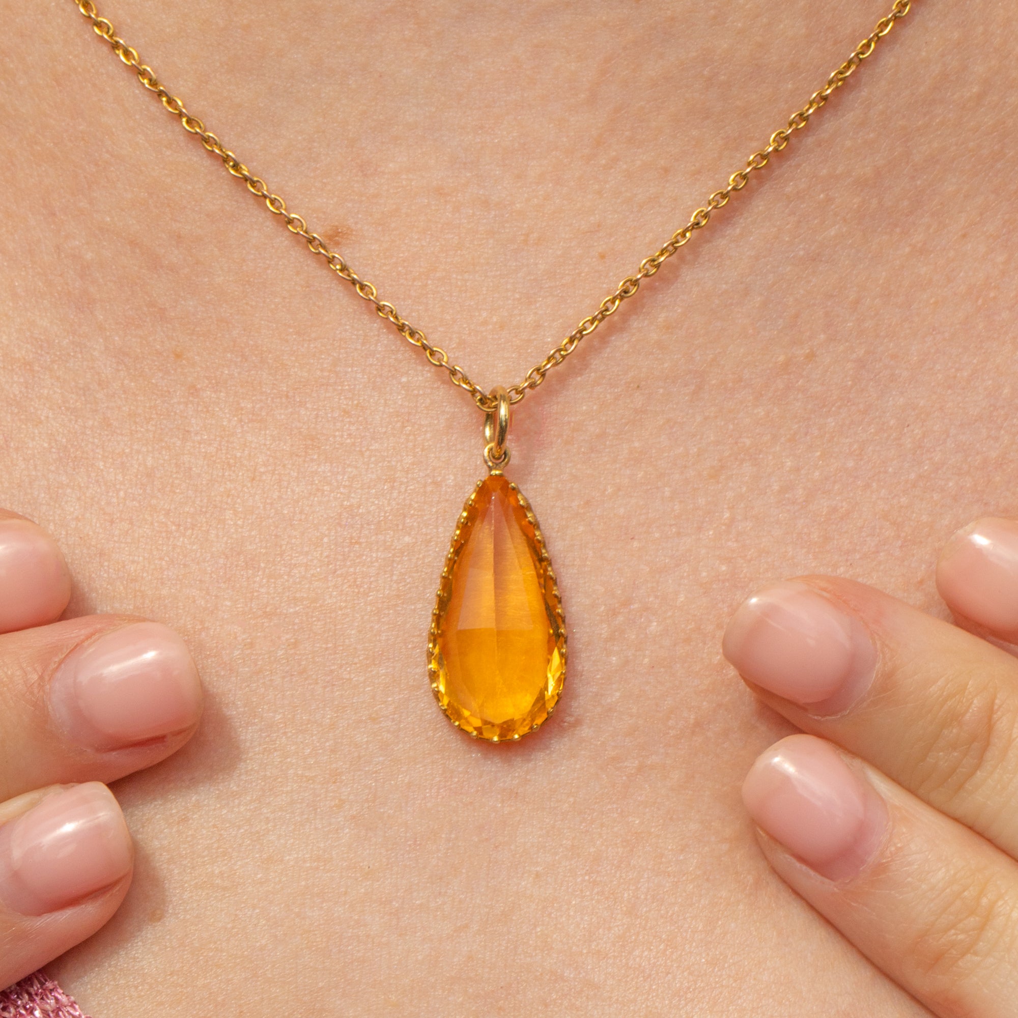 This antique 18ct Gold Paste teardrop pendant reveals spectacular honey hues at every twist and turn! Exquisitely faceted, the teardrop Citrine Paste catches the light beautifully as she adorns your décolletage.