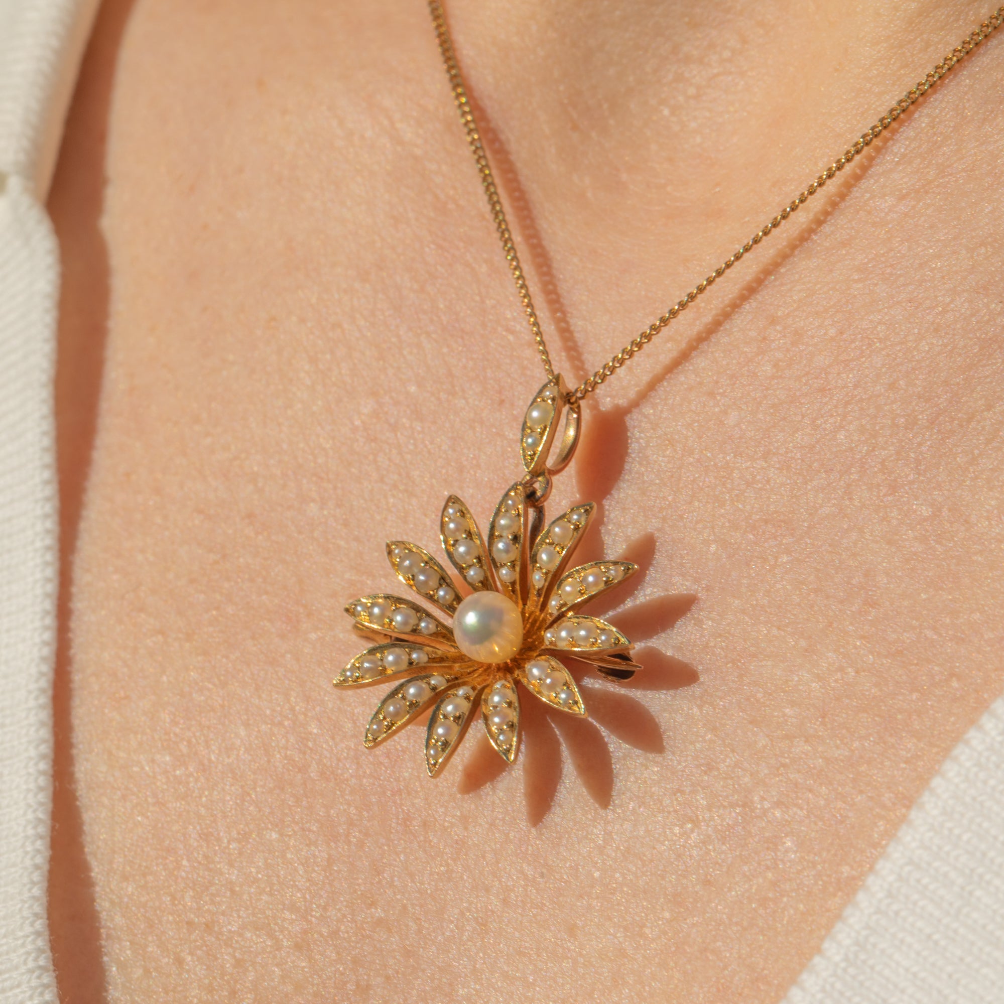 Dieser antike Anhänger in 18 Karat Gold mit Perlen in Form einer Gänseblümchenblüte strahlt Weiblichkeit aus! Der Blütenkörper ist aus massivem 18 Karat Gold mit einem satten, intensiven Farbton gefertigt. Die Blütenblätter biegen sich sanft vom Zentrum und sind mit gespaltenen Saatperlen besetzt, die die gesamte natürliche Perle elegant einrahmen.
