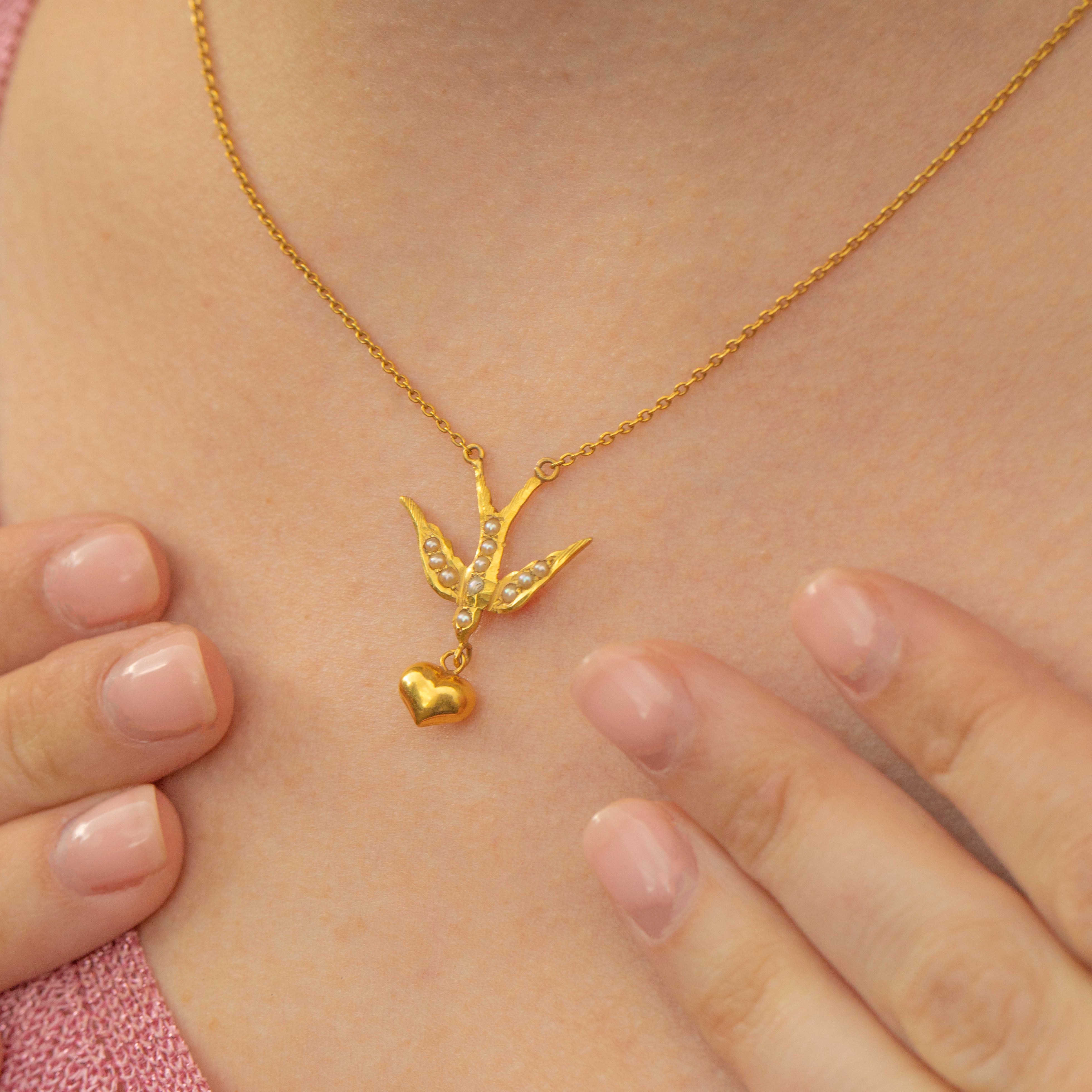 Let this antique 18ct Gold Pearl swallow drop necklace fly into your jewellery collection! Poised between two chains sits a sweeping swallow, formed of glossy 15ct Gold studded with shimmering Pearls across her curvaceous form.