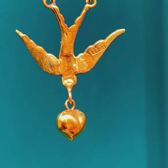 Falling from her swallow is a plump heart charm, providing a lovely fluidity once suspended across your décolletage. At 15.5" long, this Victorian Gold necklace accentuates your neckline, with her centre piece falling perfectly between your collarbones.