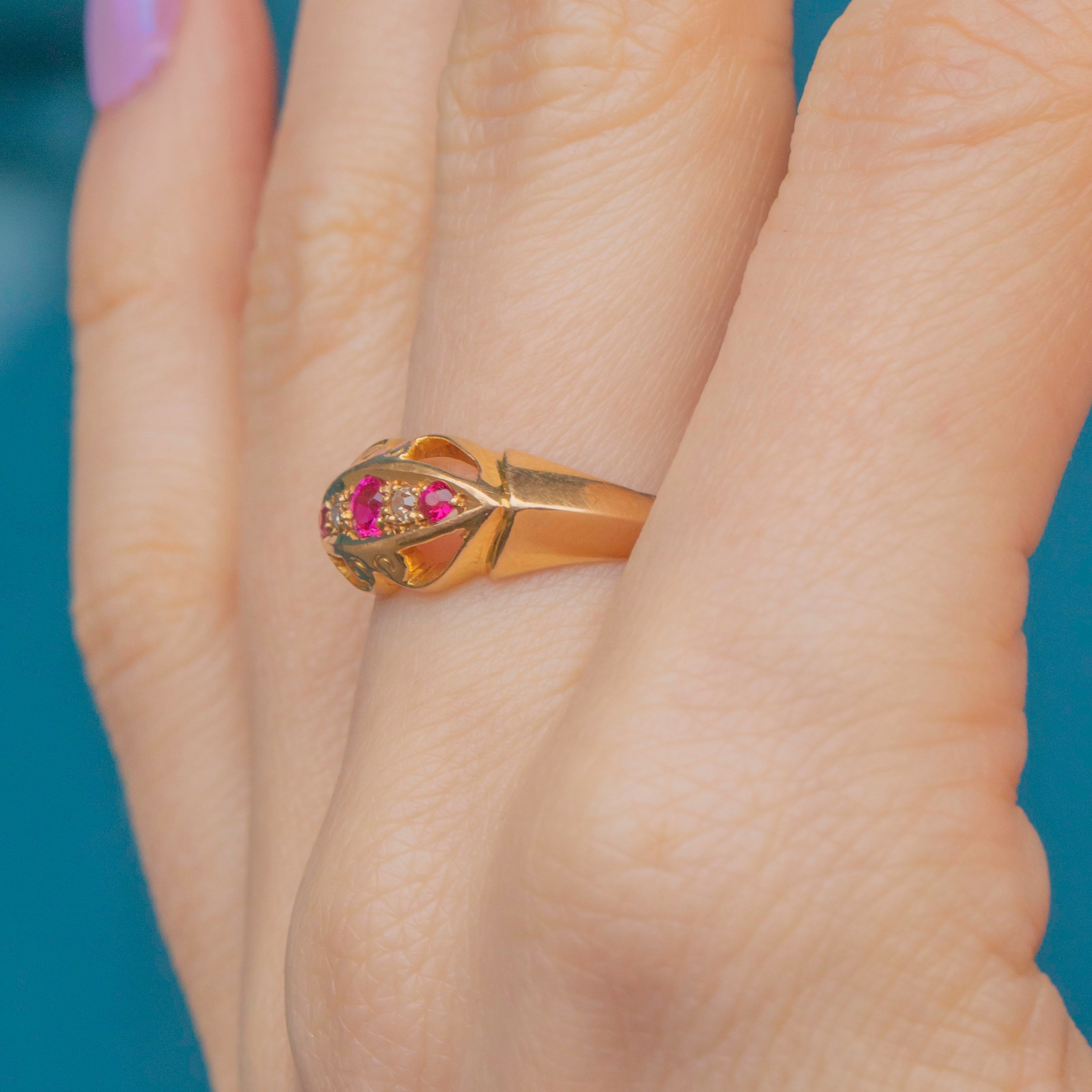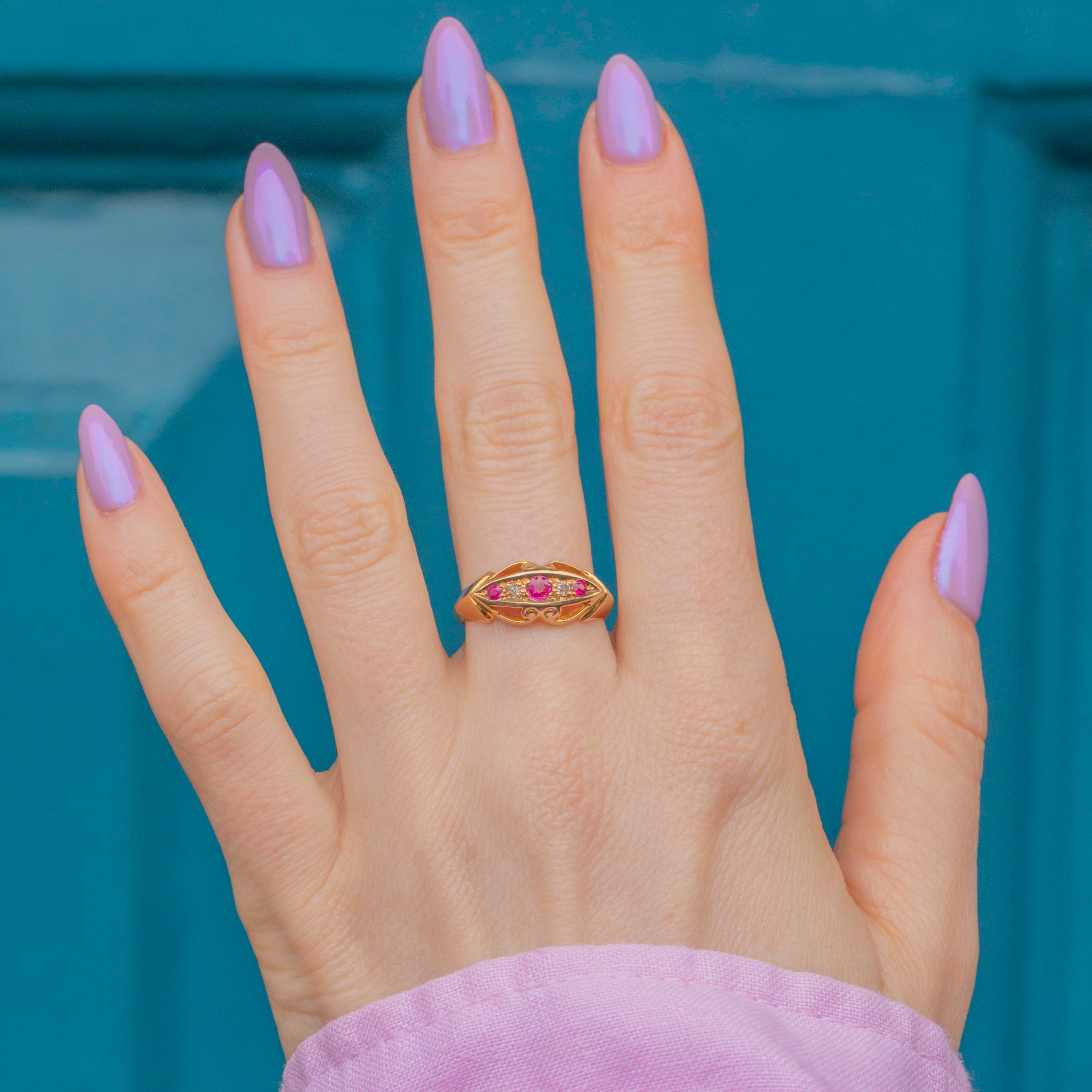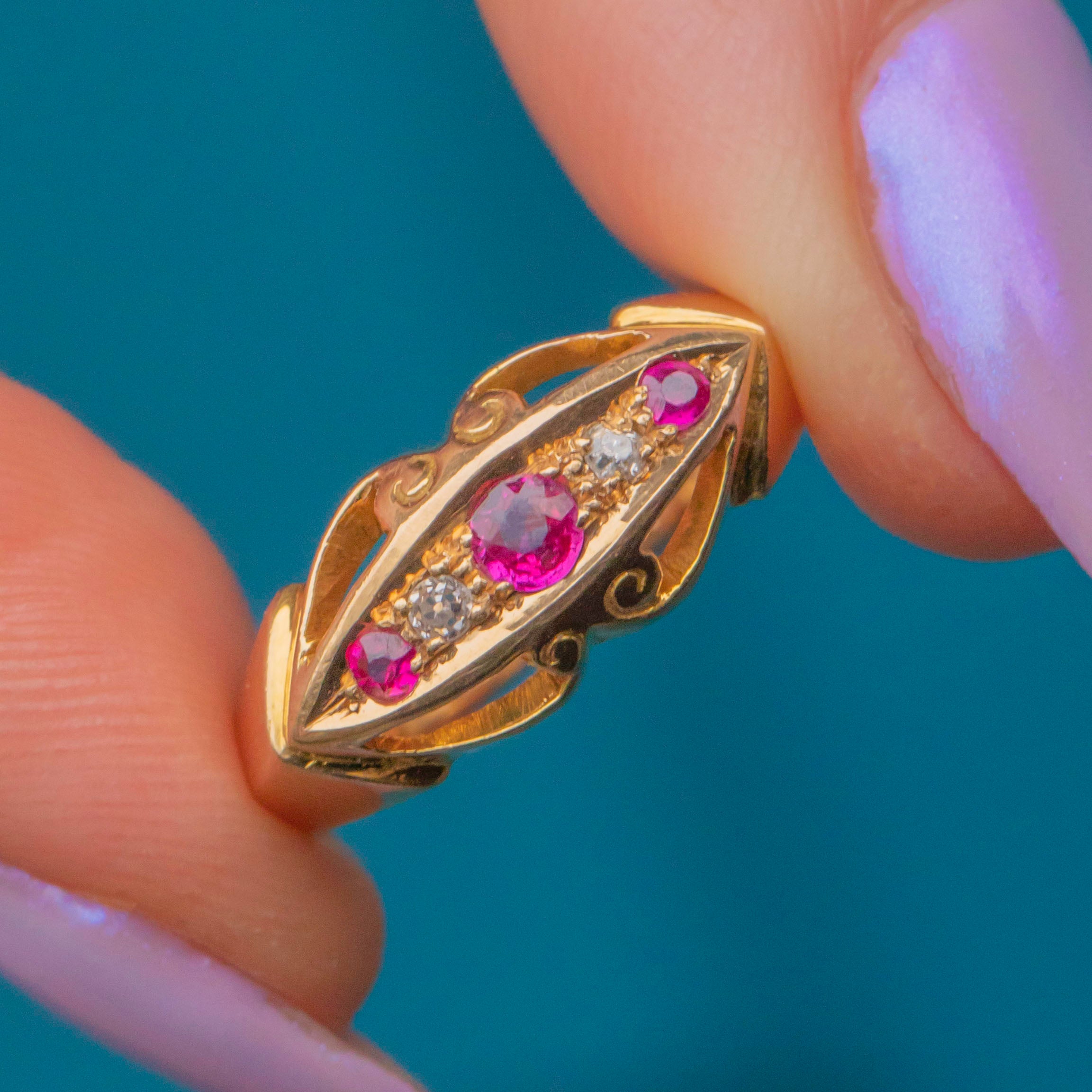 Inlaid with alternating Pink Sapphires and scintillating Diamonds, framed by a gorgeous openwork gallery, this antique 18ct Gold ring is elegant and versatile. Bright and buttery, she is a great option for stacking or to be worn as a stand-alone piece.