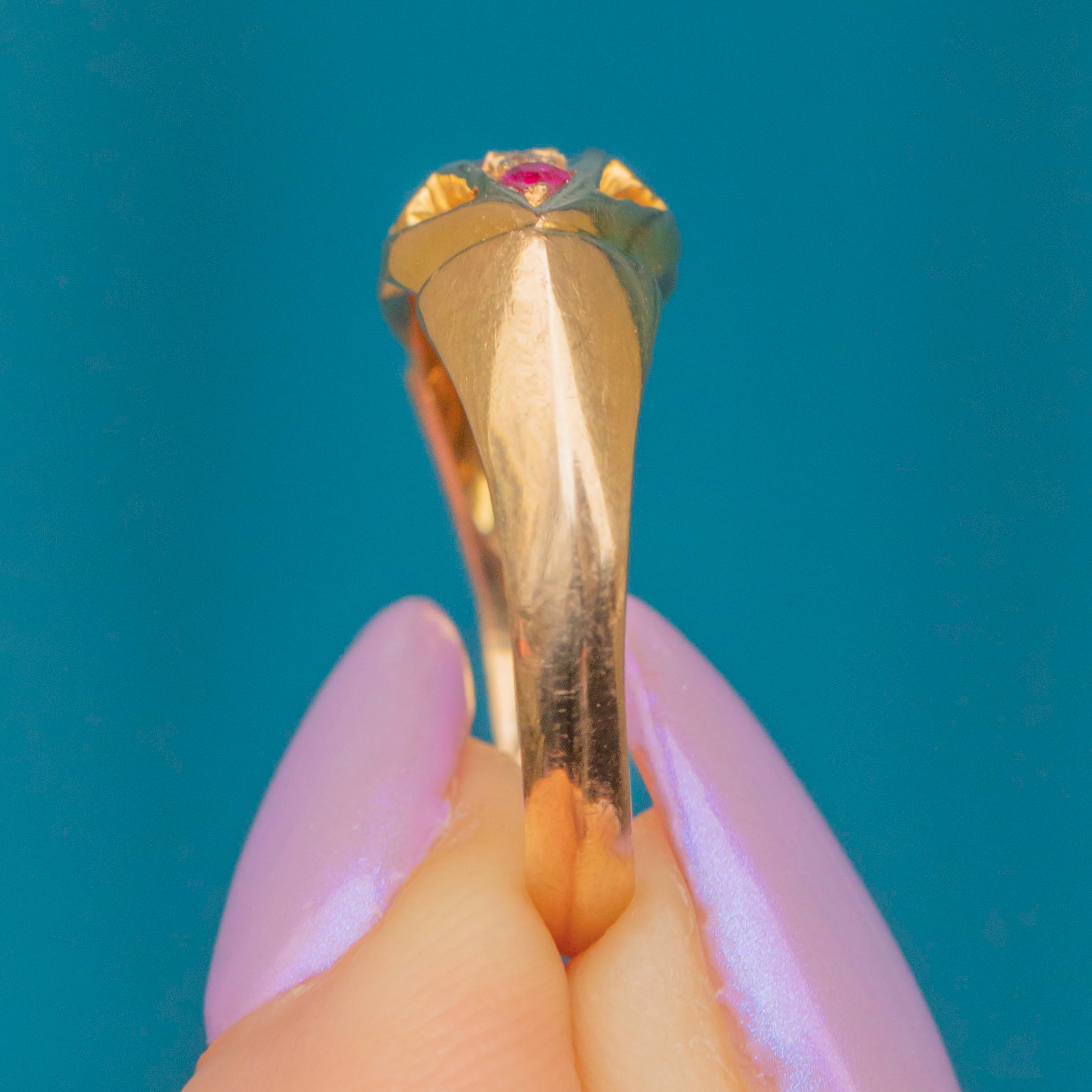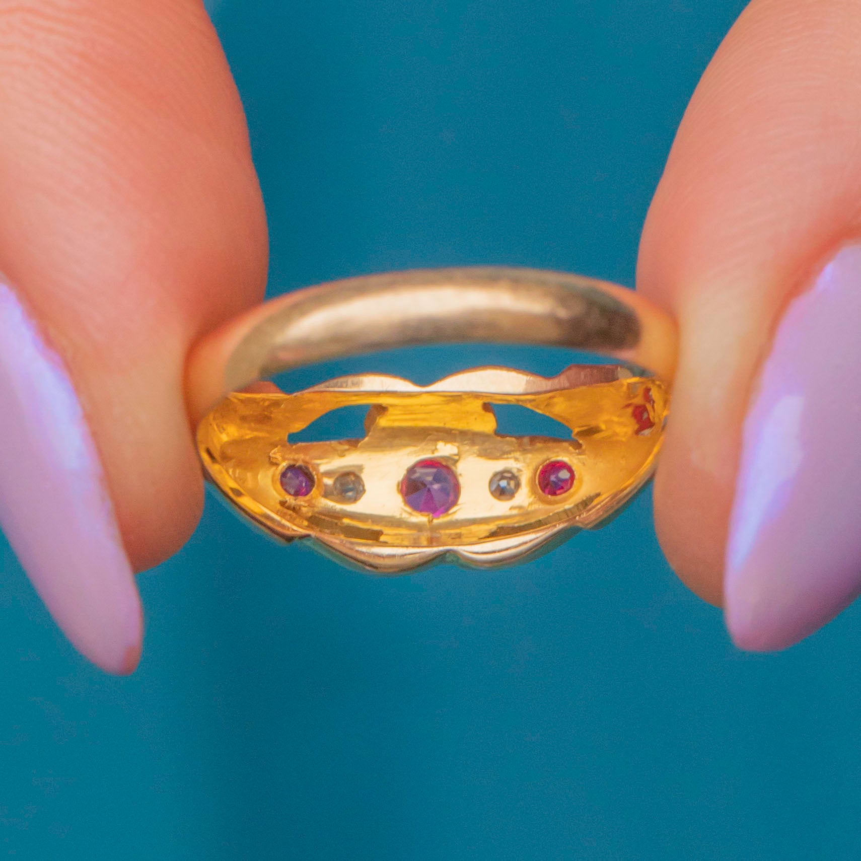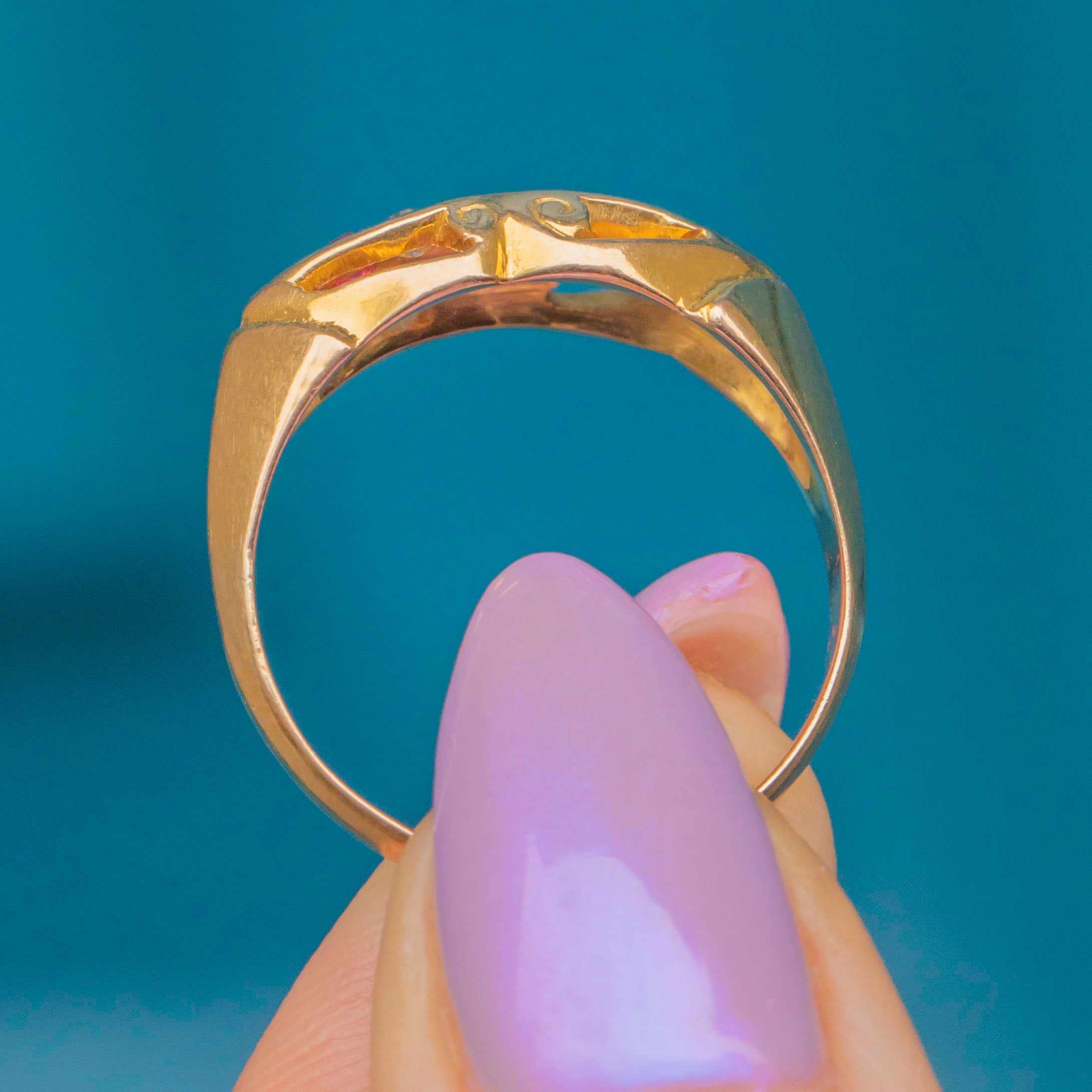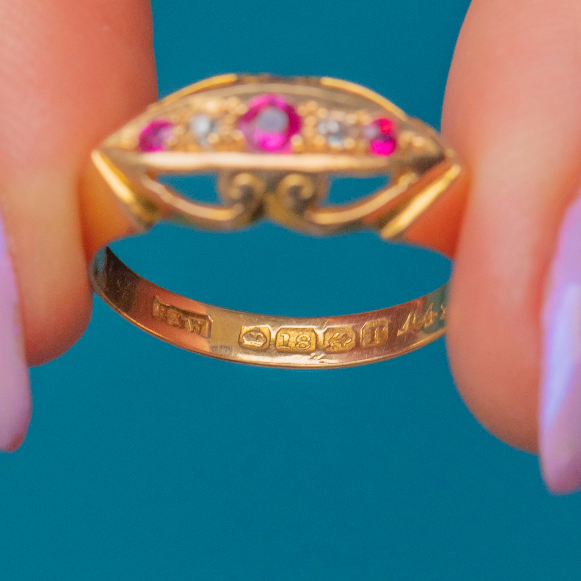 Inlaid with alternating Pink Sapphires and scintillating Diamonds, framed by a gorgeous openwork gallery, this antique 18ct Gold ring is elegant and versatile. Bright and buttery, she is a great option for stacking or to be worn as a stand-alone piece.