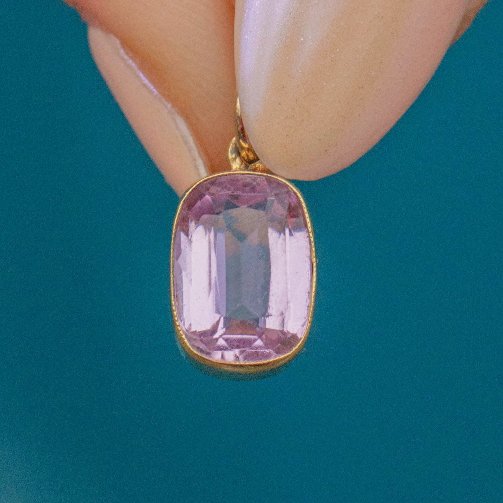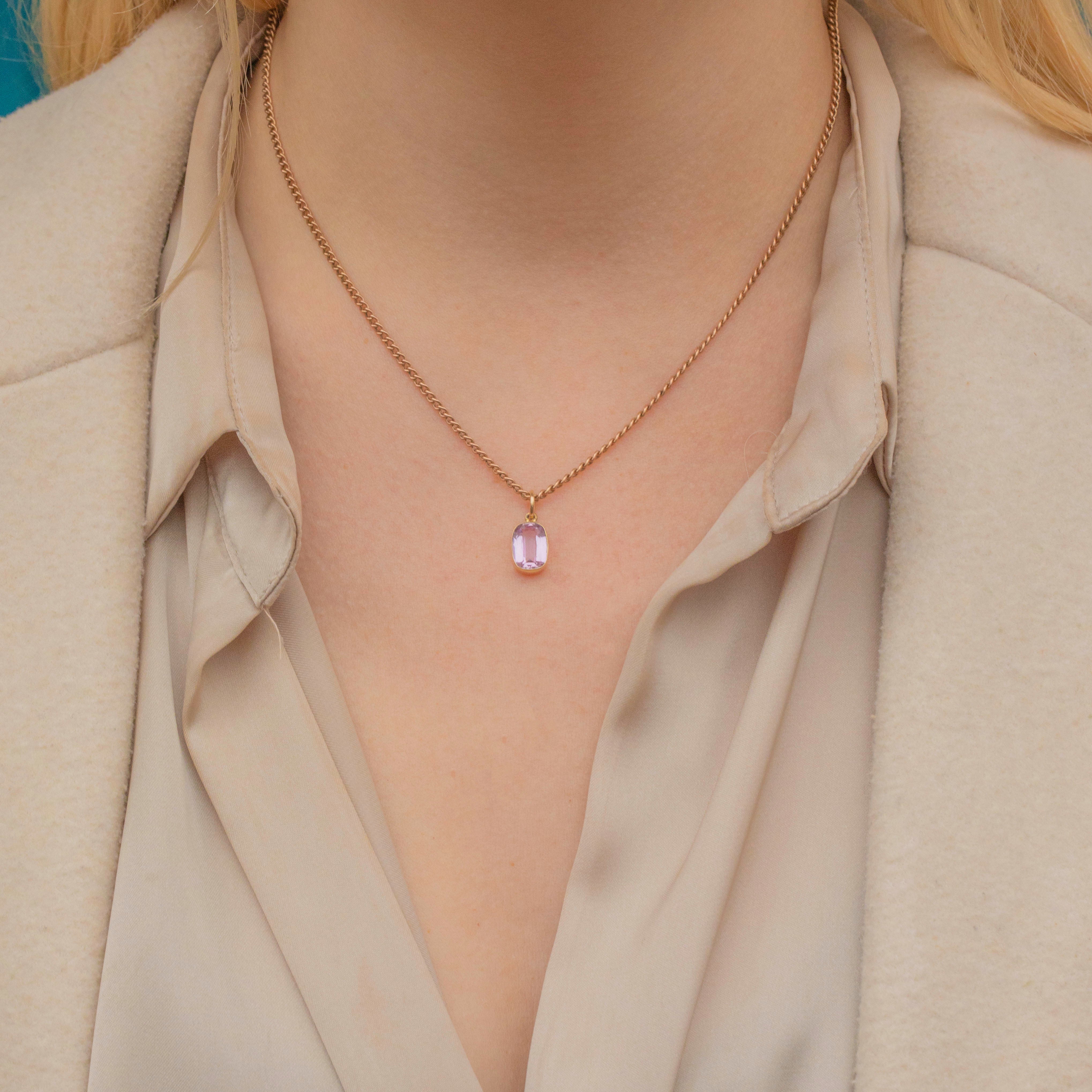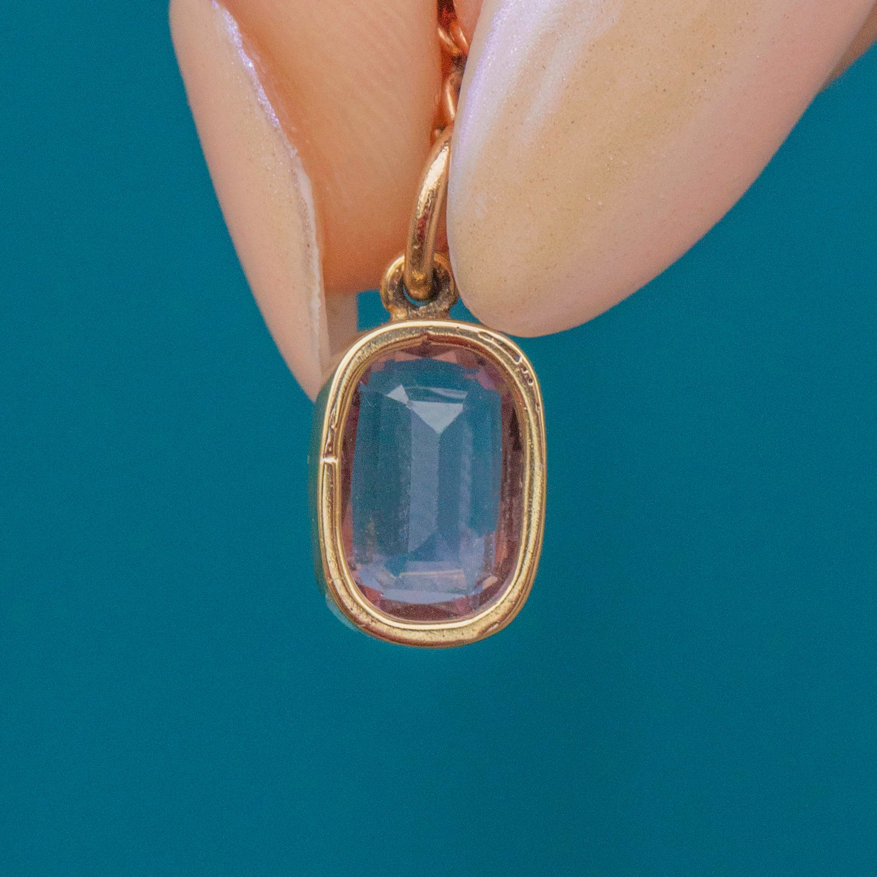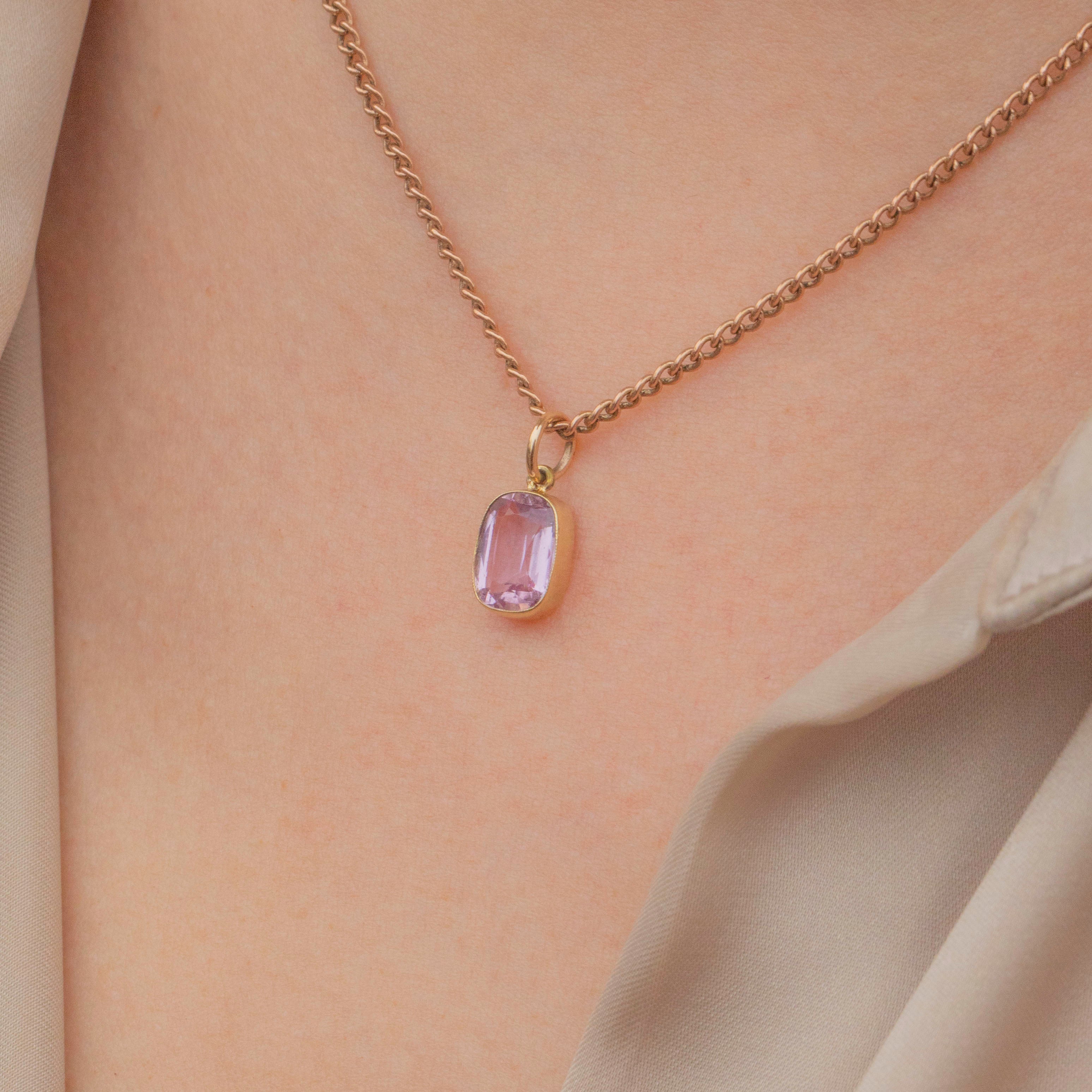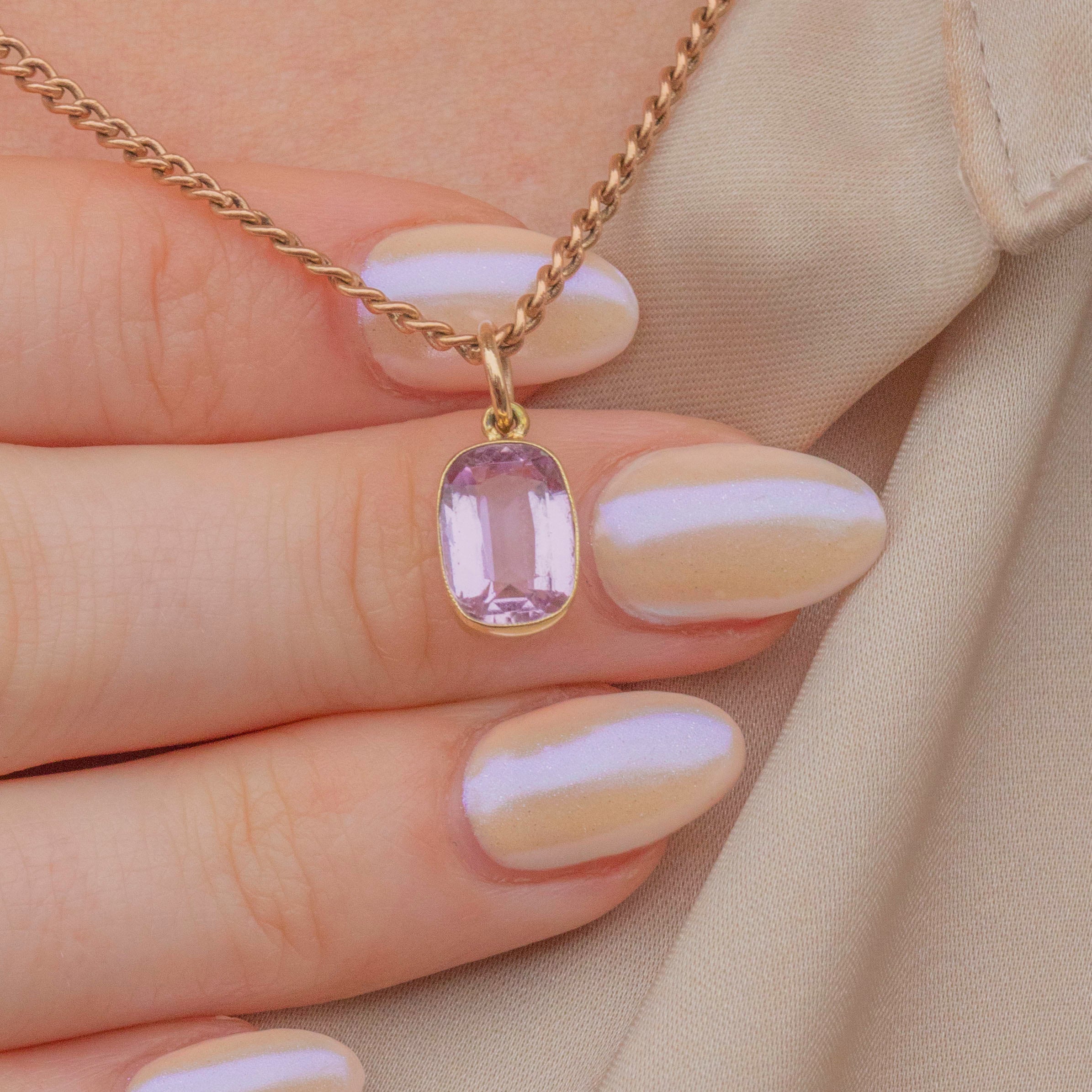 This sweet antique 18ct Gold pink Topaz charm will make an elegant addition to your collection! The 4.15ct Topaz boasts a lovely soft lilac hue, perfectly complimented by the saturated 18ct Gold bezel creating a feminine and luxurious colour palette.