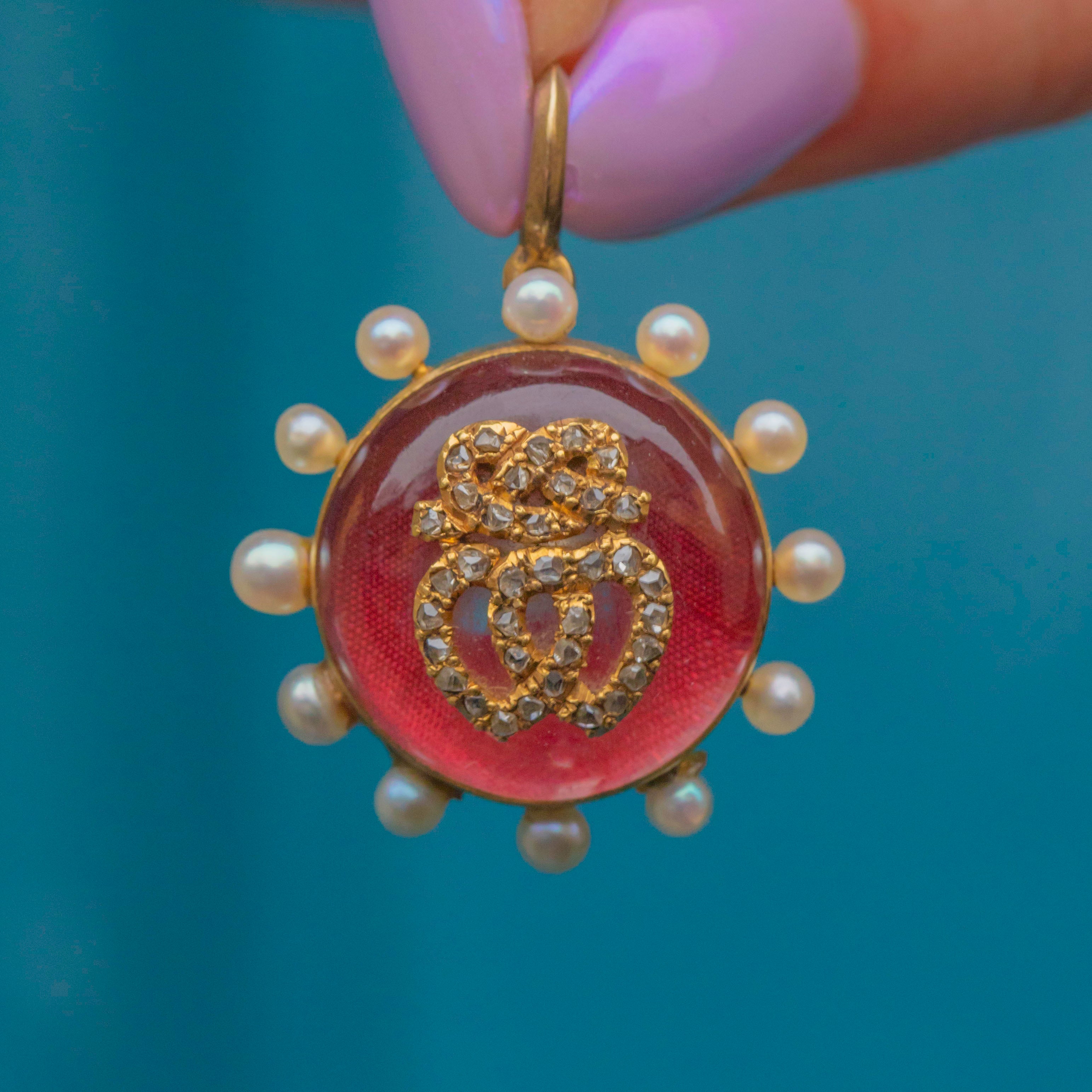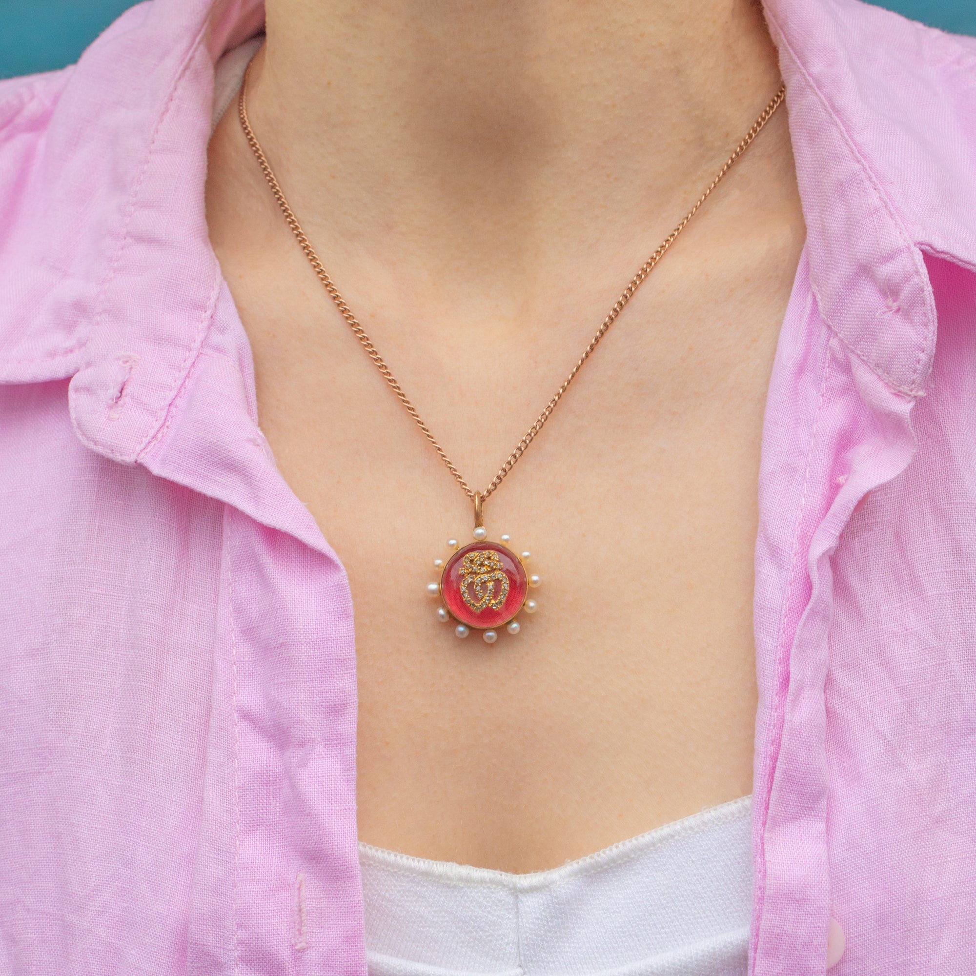 This Victorian pendant is adorned by a halo of iridescent Pearls and, complete with a sturdy bale, would look fabulous suspended from a Gold chain.