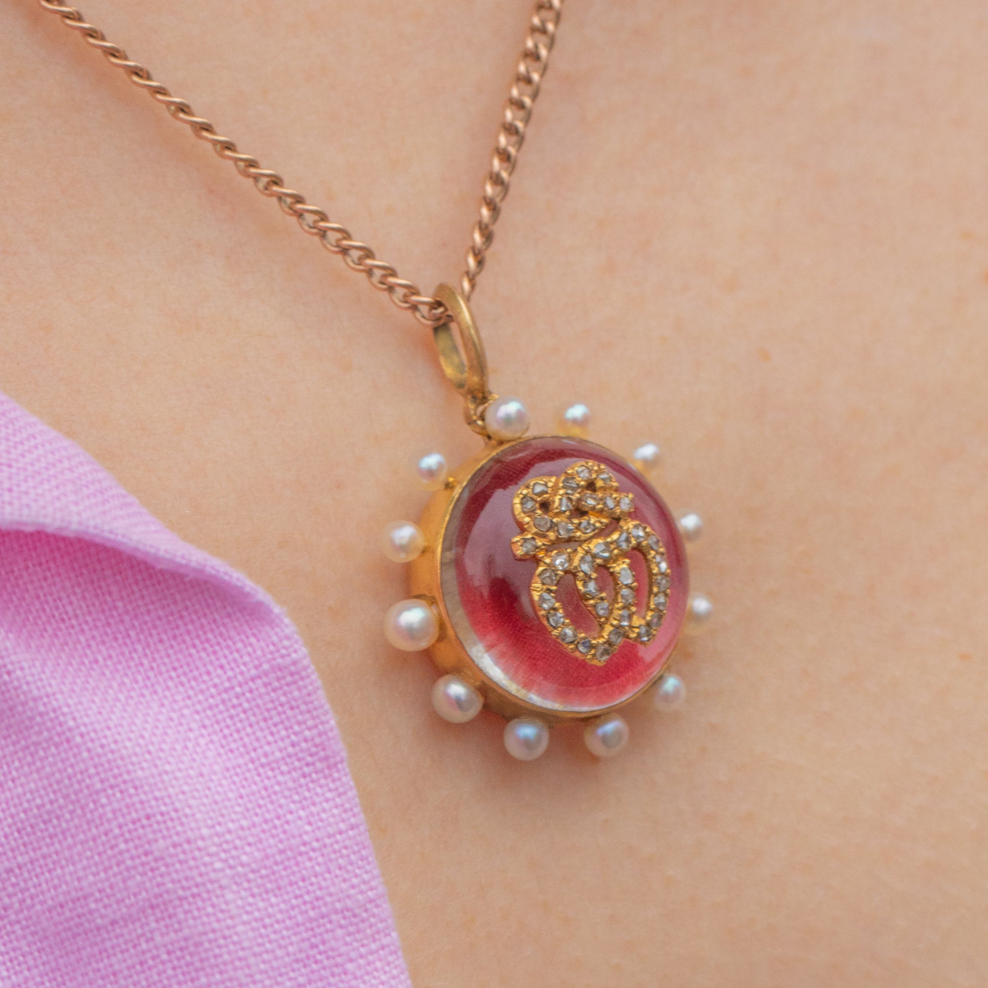 Displaying a domed Rock Crystal cabochon, this Victorian pendant features an adorable double heart motif encrusted rose-cut Diamonds set in sumptuous 18ct Gold. She is backed by richly saturated ribbon, giving her a lovely regal quality, and has a locket compartment on the back to which you can add a cherished photo.