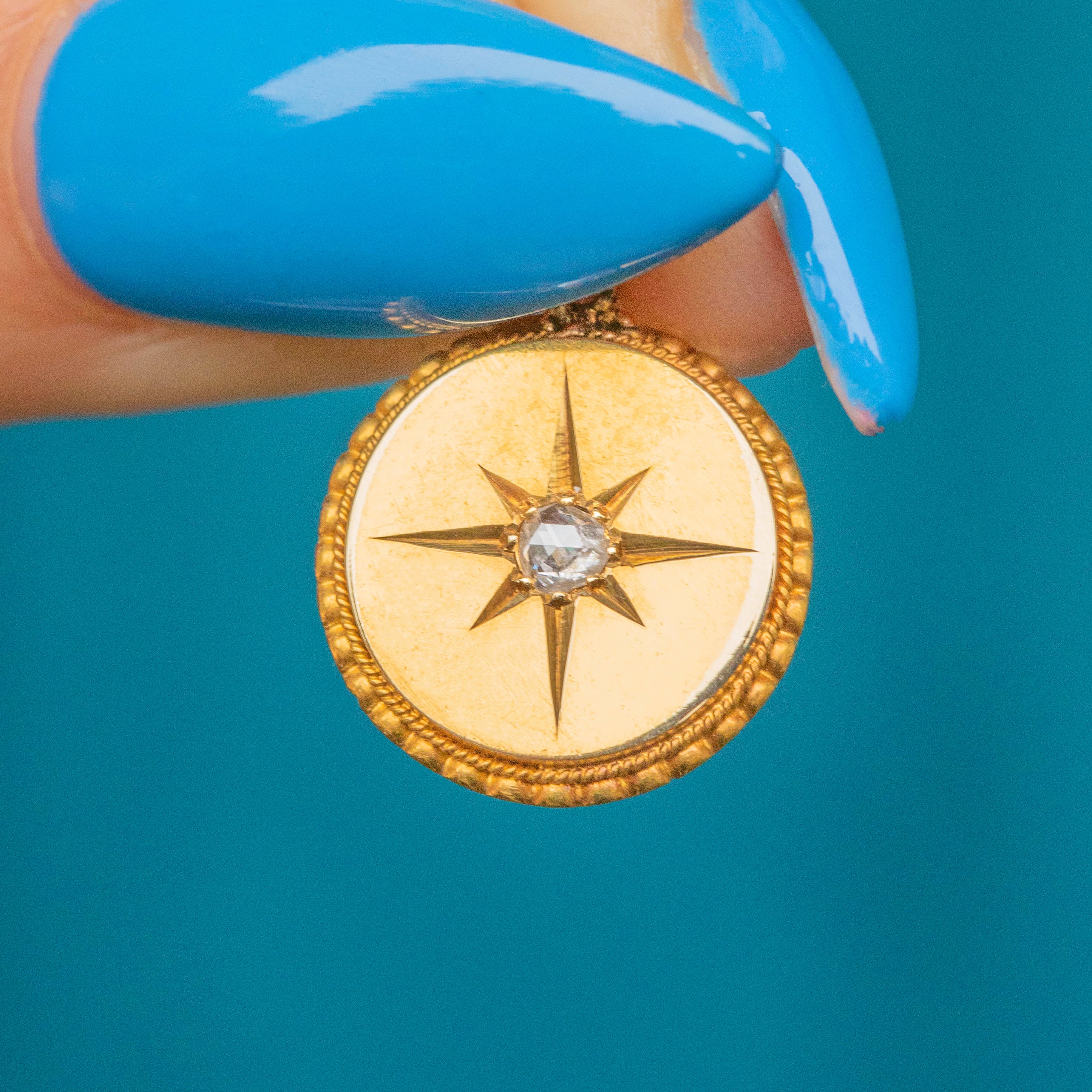 Set within a rich, buttery 18ct Gold setting, this star-set charm features a dazzling rose-cut Diamond in her centre, capturing the light beautifully. This Victorian delight features a gorgeous intricate star engraving, adding a touch of celestial elegance and enhancing the charm's timeless appeal.