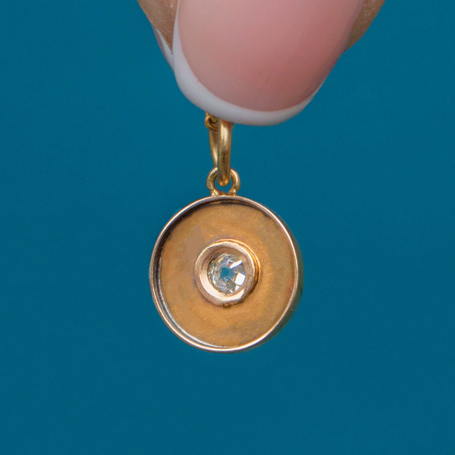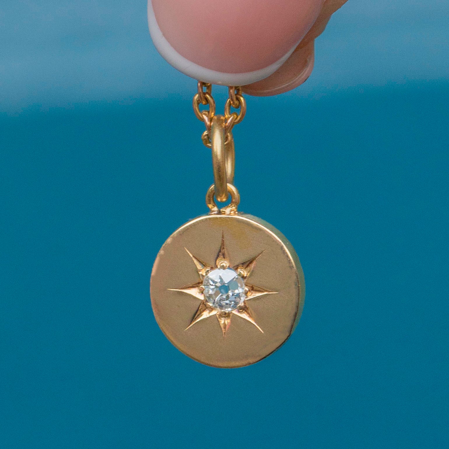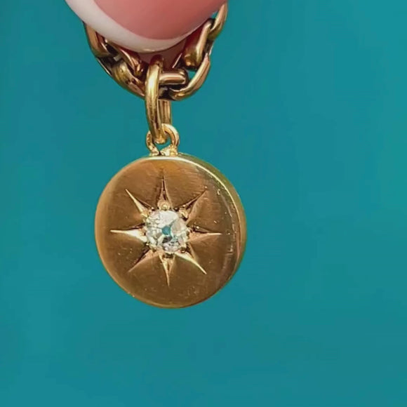 VERY GOOD. This antique 18ct Gold round Diamond star-set charm is in very good condition. Its Diamond is securely set and free from fleabites. There is some wear on the back of the pendant which cannot be seen while it is worn. The Gold is brightly saturated and ready to bring undeniable Victorian charm to your décolletage!