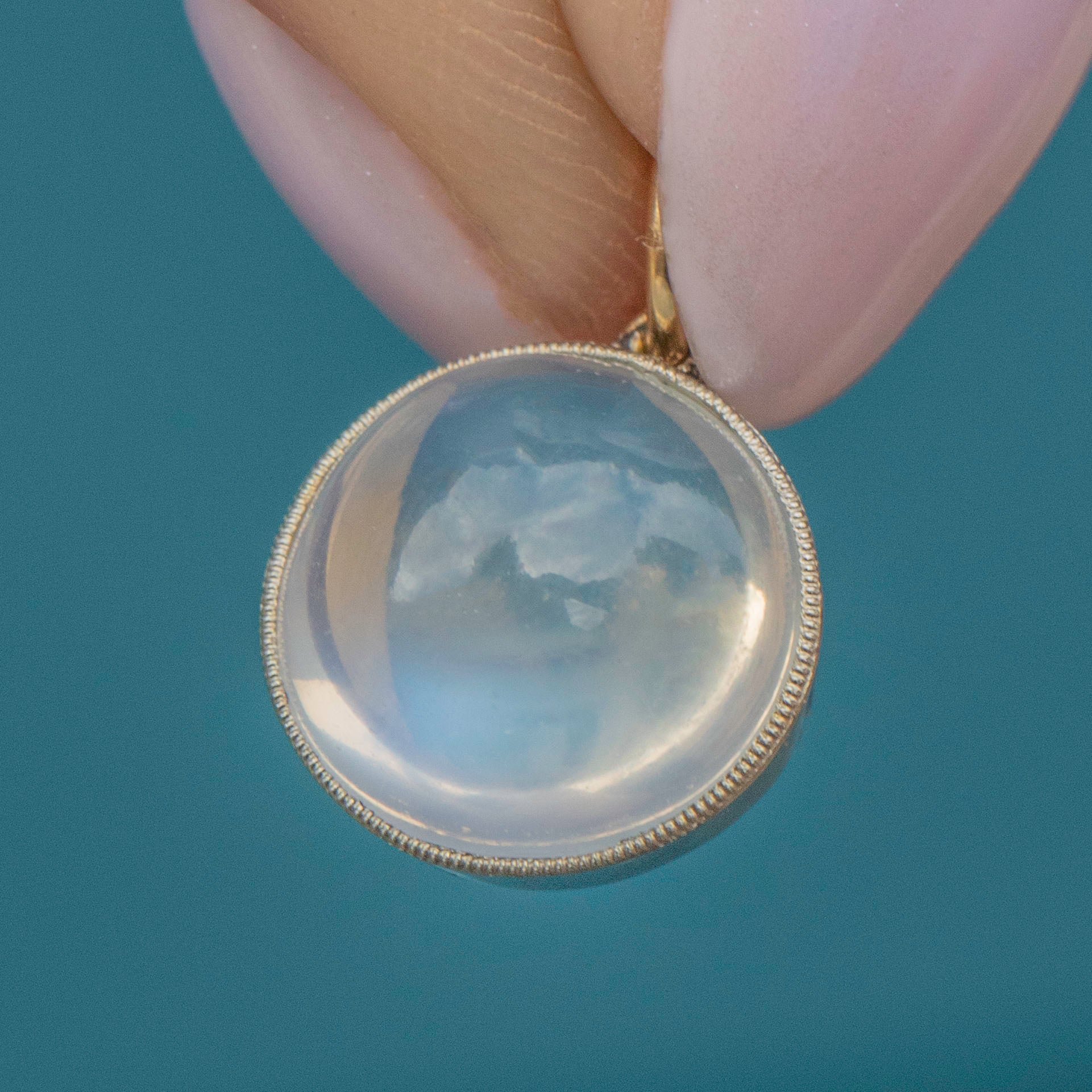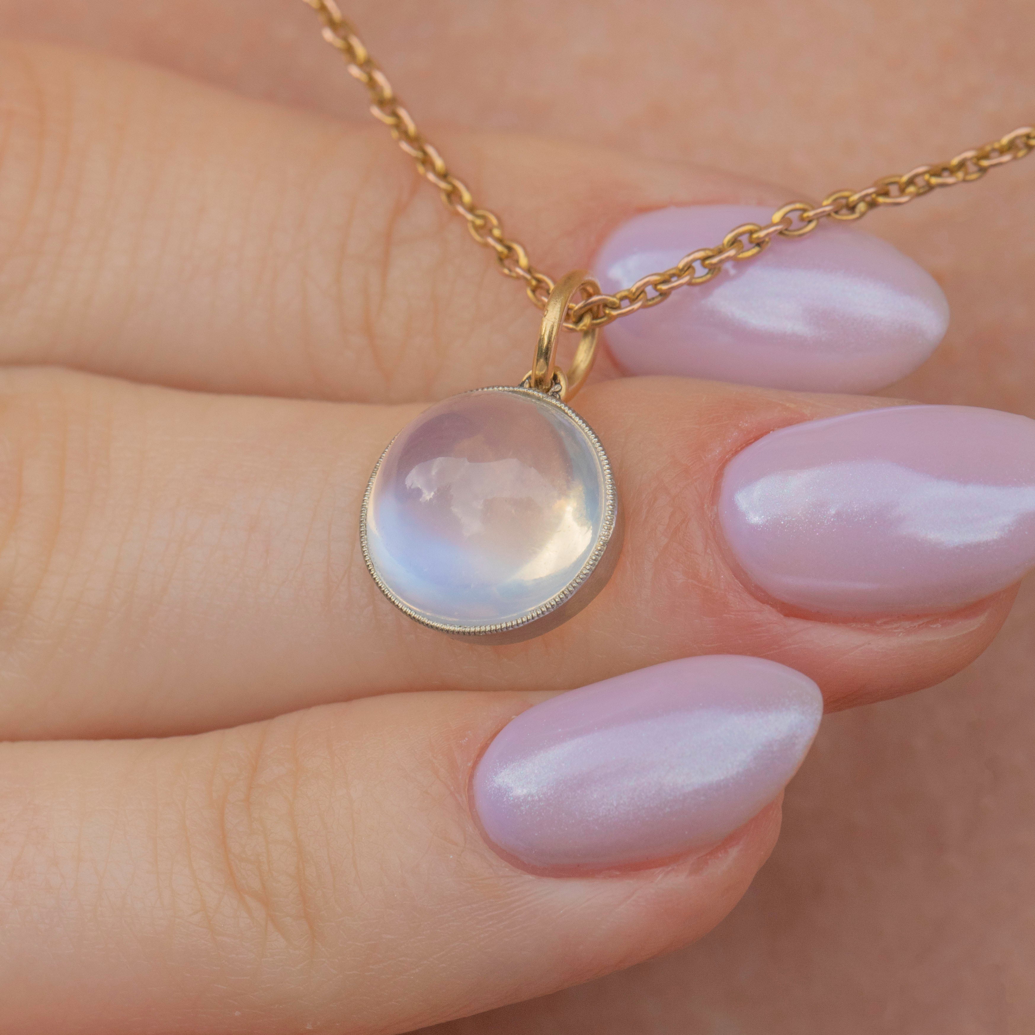 EXCELLENT. This antique 18ct Gold round Moonstone charm is in excellent condition. Her glowing Moonstone is magnificently toned with no scuffs or chips to note and is securely held within her smooth 18ct White Gold bezel setting. The White Gold is lustrous and robust with no scratches visible. Just affix her to a antique Gold chain or dog-clip and wear her straight from your pink Lillicoco box!