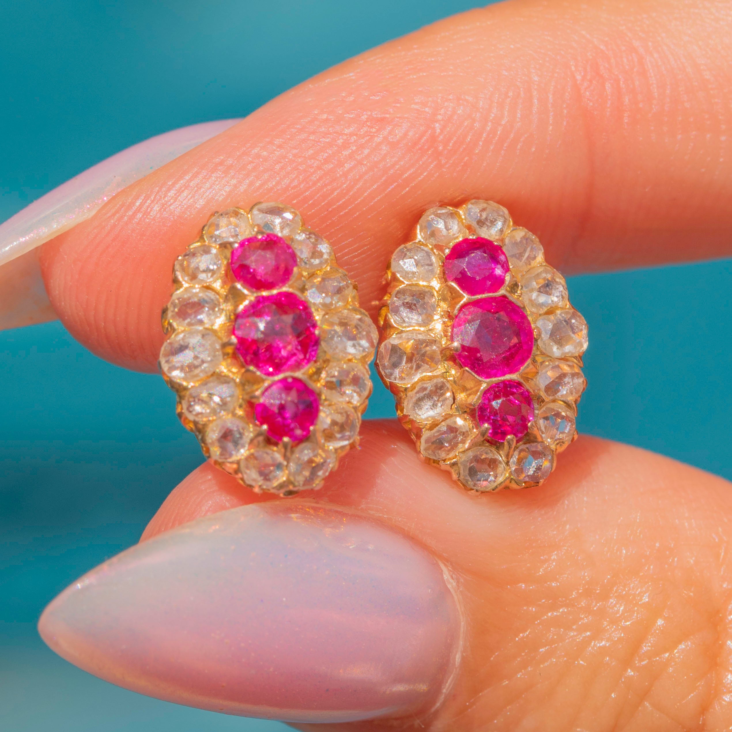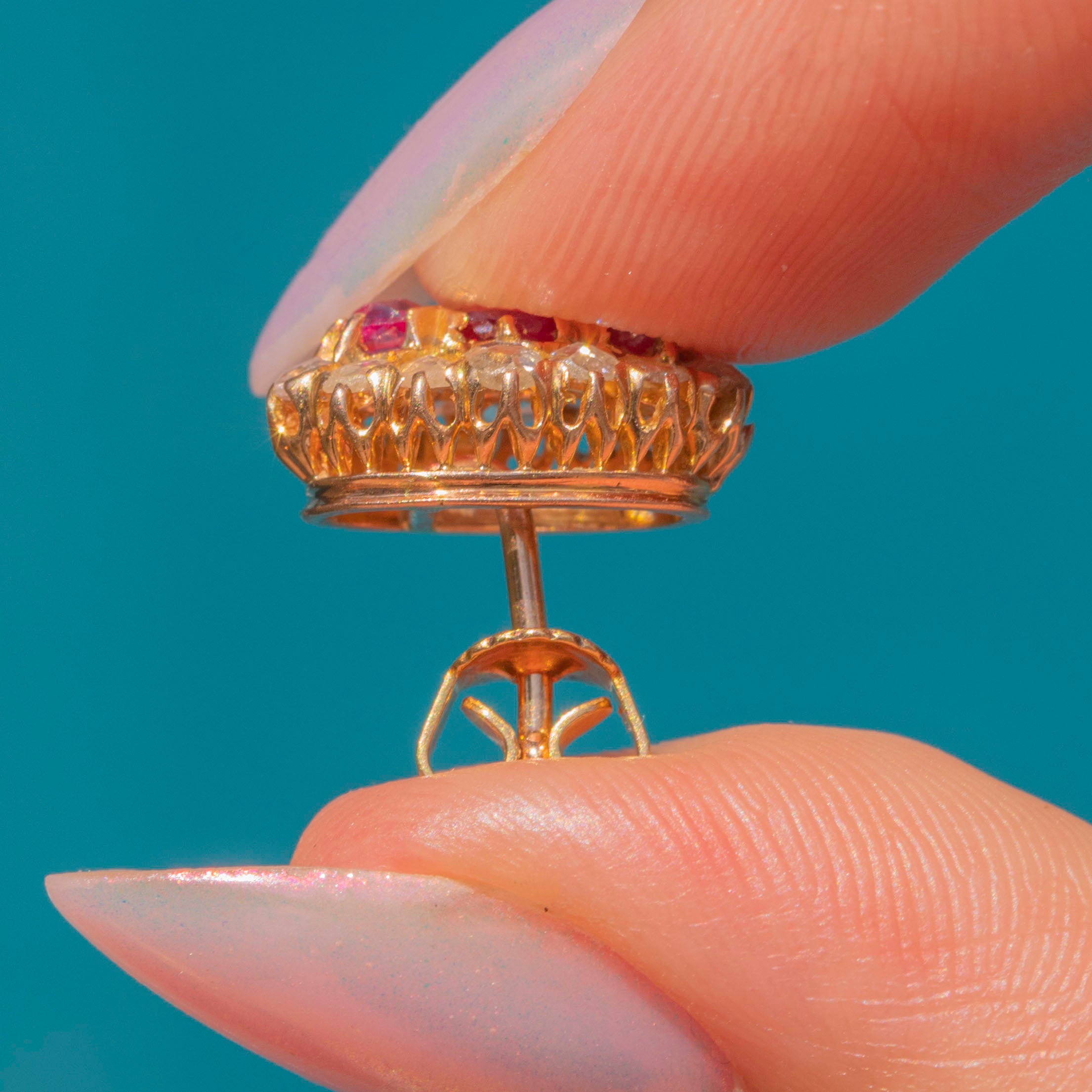 VERY GOOD-EXCELLENT. These antique 18ct Gold rose-cut Diamond cluster stud earrings are in fab condition. The Diamonds and Rubies are secure and super fiery, even to this day! The only thing to note is that the butterfly backs are not perfectly matched; it's likely that one was lost over the years, so a replacement has been used. However, the main thing is that they keep the pair secure in the ear, and you won't notice this difference when you wear them! What a stunning pair!