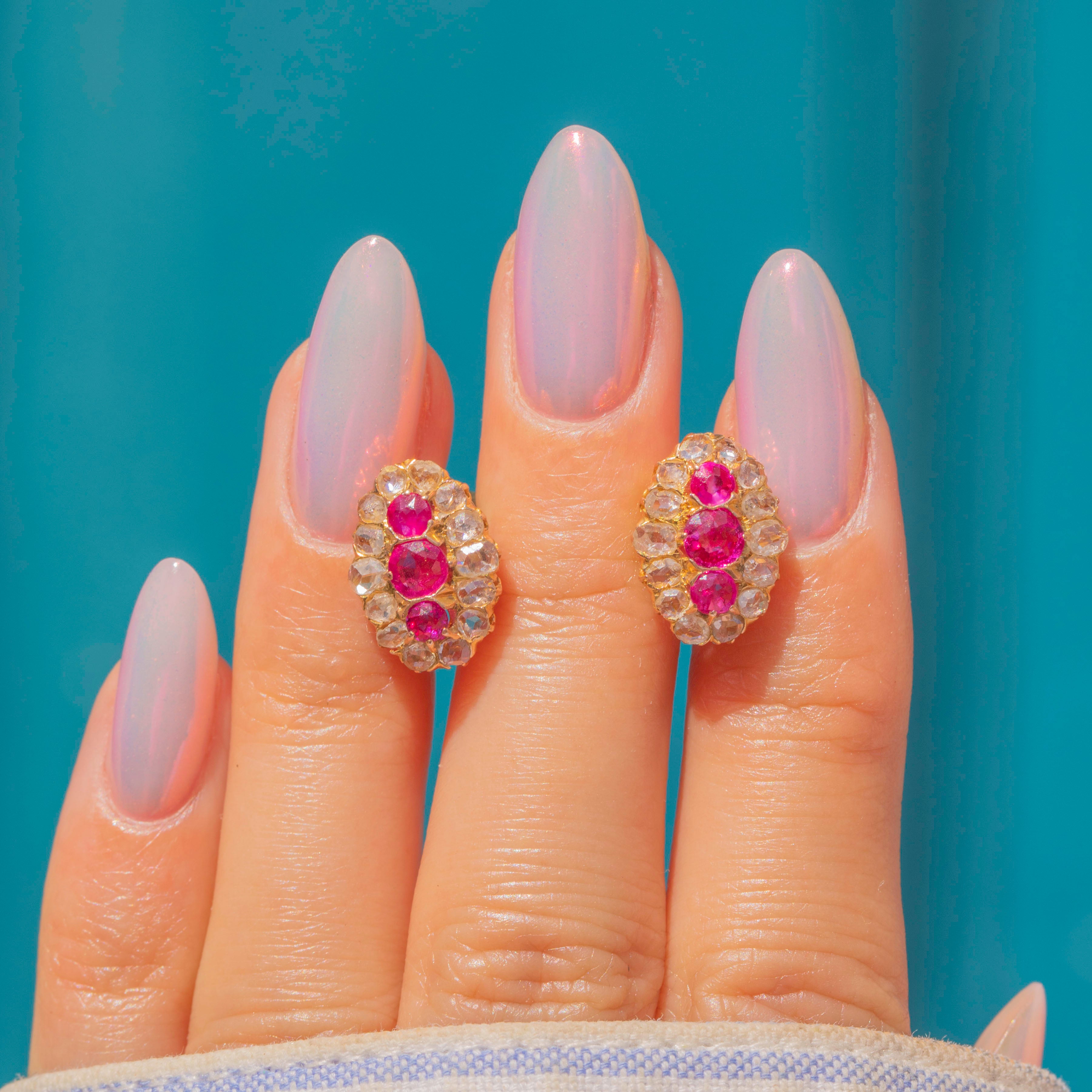 These antique 18ct Gold Ruby rose-cut Diamond cluster stud earrings are a marvel! Set in 18ct Gold are a total of twenty-eight scintillating Diamonds and six berry red Rubies, culminating in a gemstone cluster that leaves nothing more to be desired!