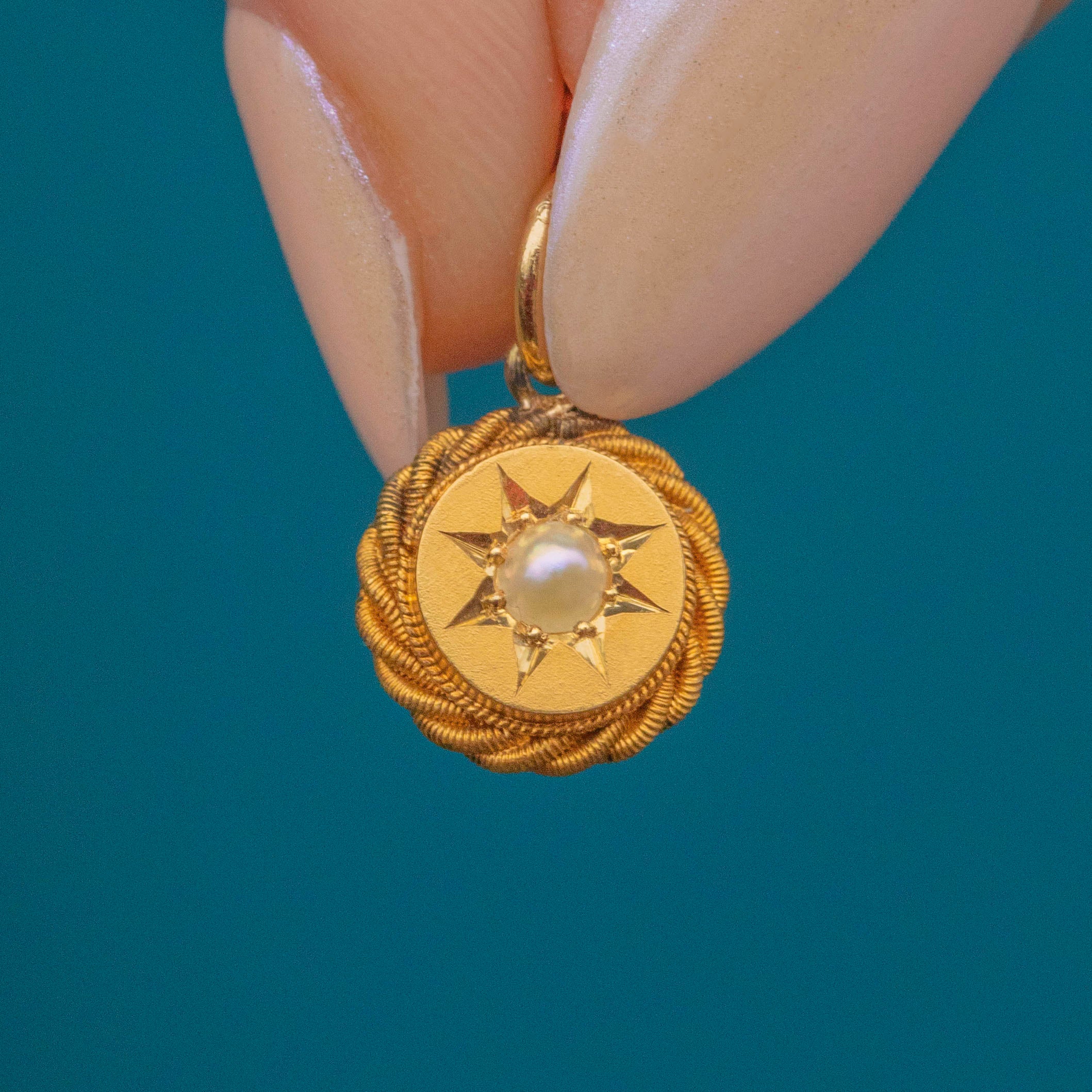 Add a touch of celestial allure to your outfit with this sweet Victorian 18ct Gold Pearl star-set charm! The 18ct Gold is brightly saturated, encasing a crisp white Pearl within a bold star setting in its centre, haloed by a rope border for a decorative finish.