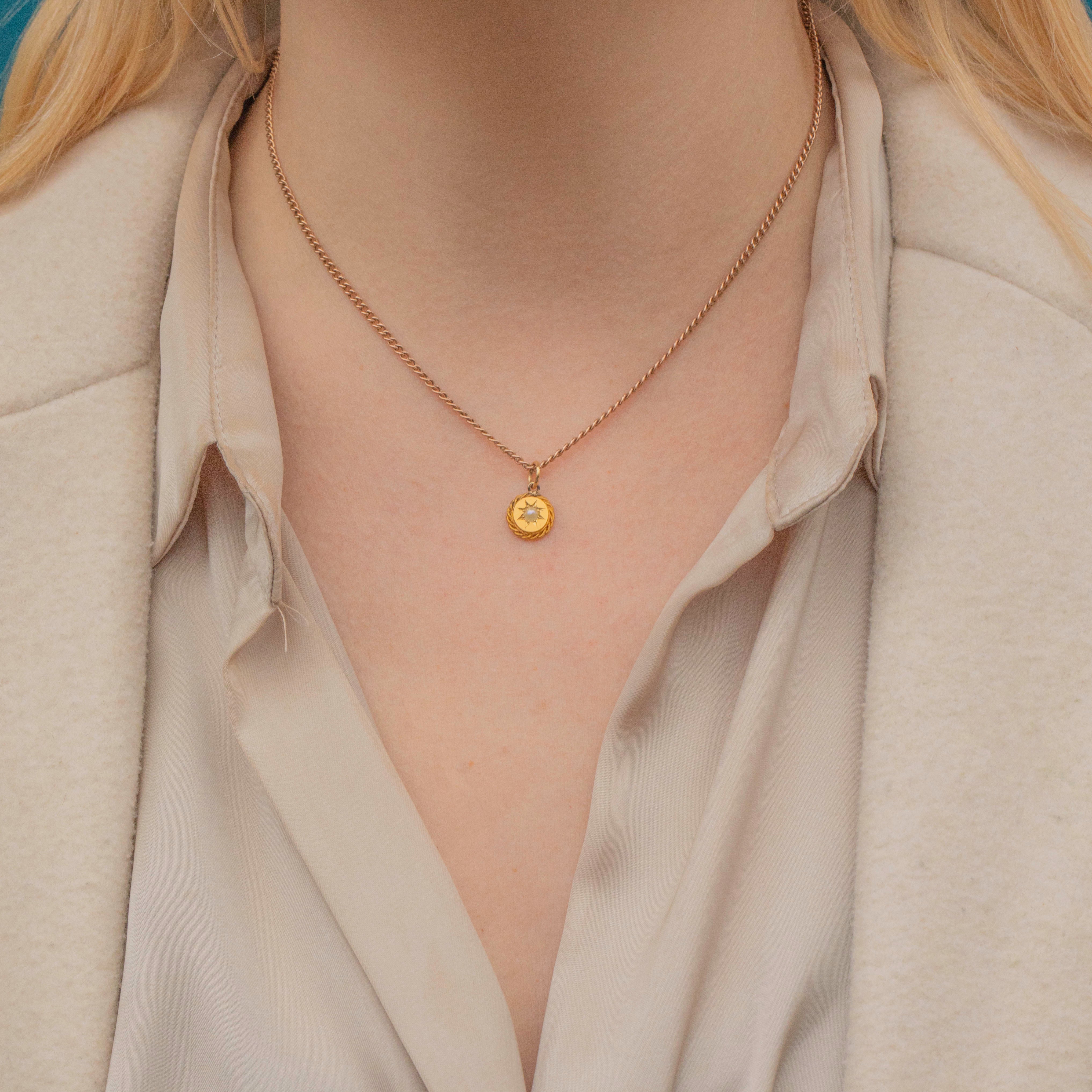 VERY GOOD. This Victorian 18ct Gold Pearl star-set charm is in very good condition. The Gold is brightly saturated and the details are free from signs or wear. There is signs of a conversion from a stick pin on the back, but the charm wears comfortably against the skin and this can't be seen from the front. The Pearl is securely set with no visible surface wear. All in all, a lovely little Victorian charm to add to your collection!