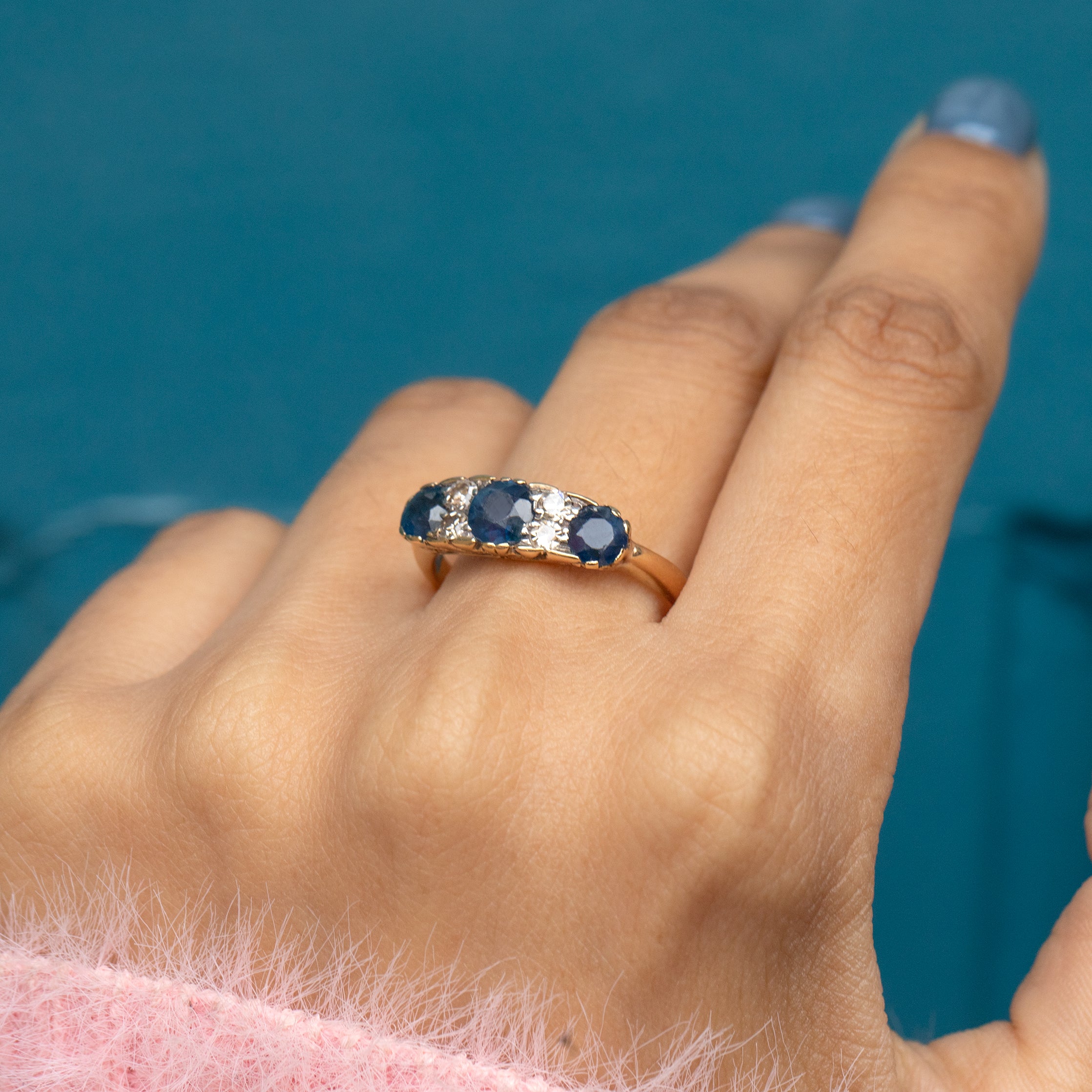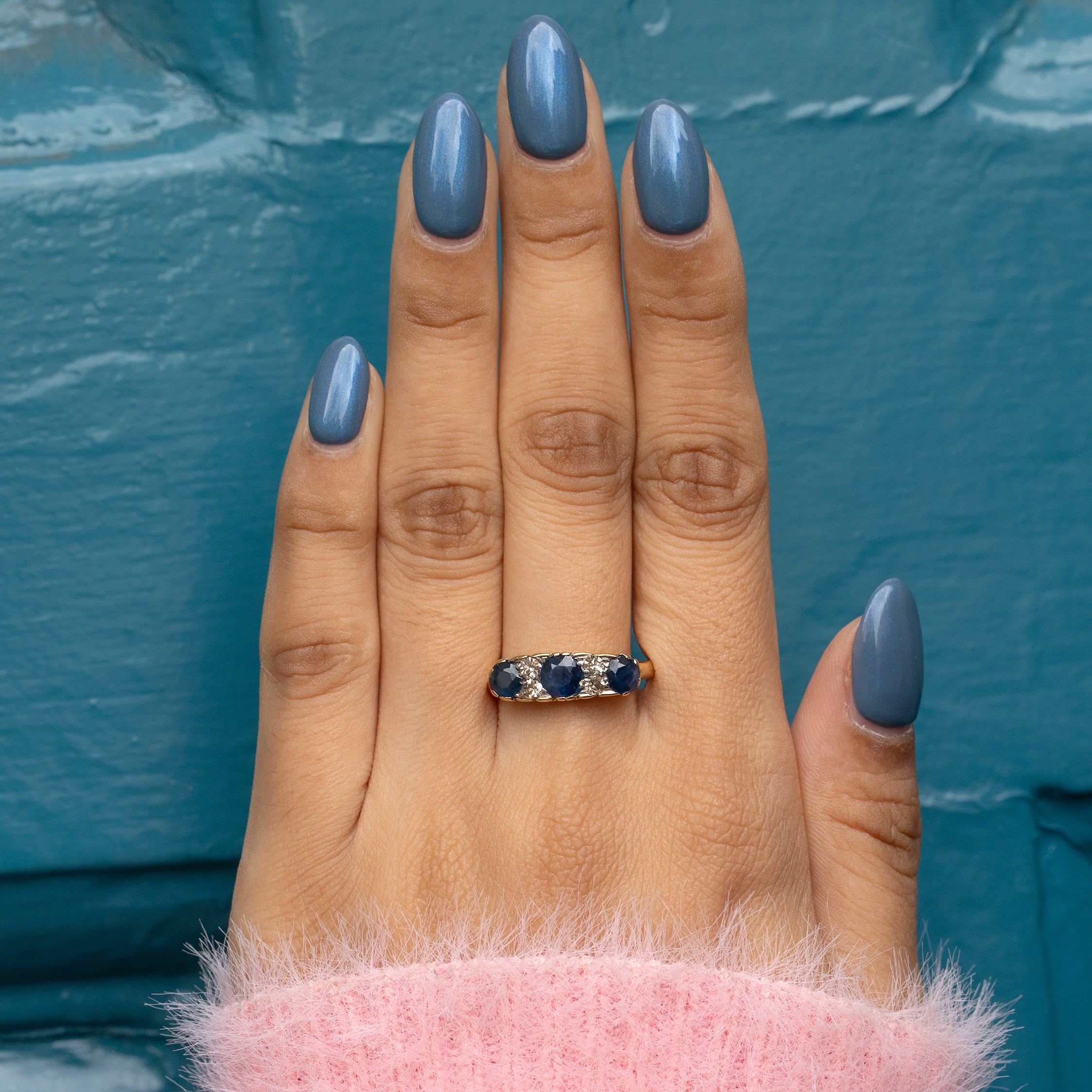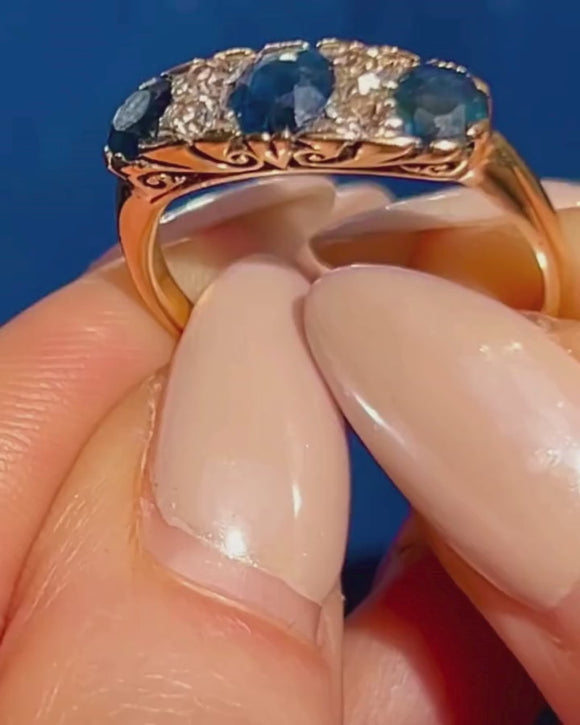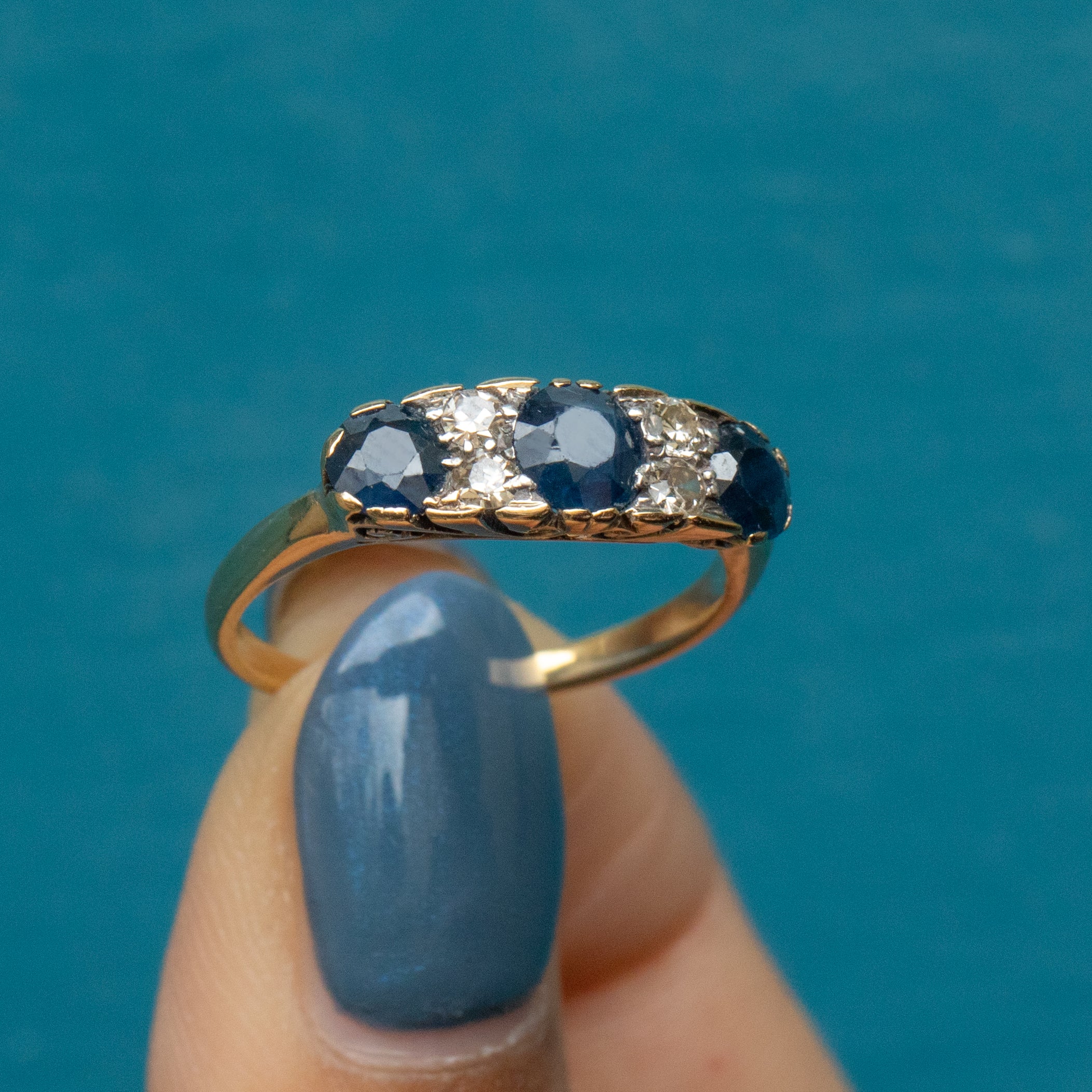 The deep royal natural blue Sapphires, with a total weight of 1.00ct, are accompanied by a sprinkling of old European-cut Diamonds for a timeless antique finish. The gallery of the ring is typically Victorian, and we adore its wispy and flowing form; they just don't make rings quite like this anymore!
