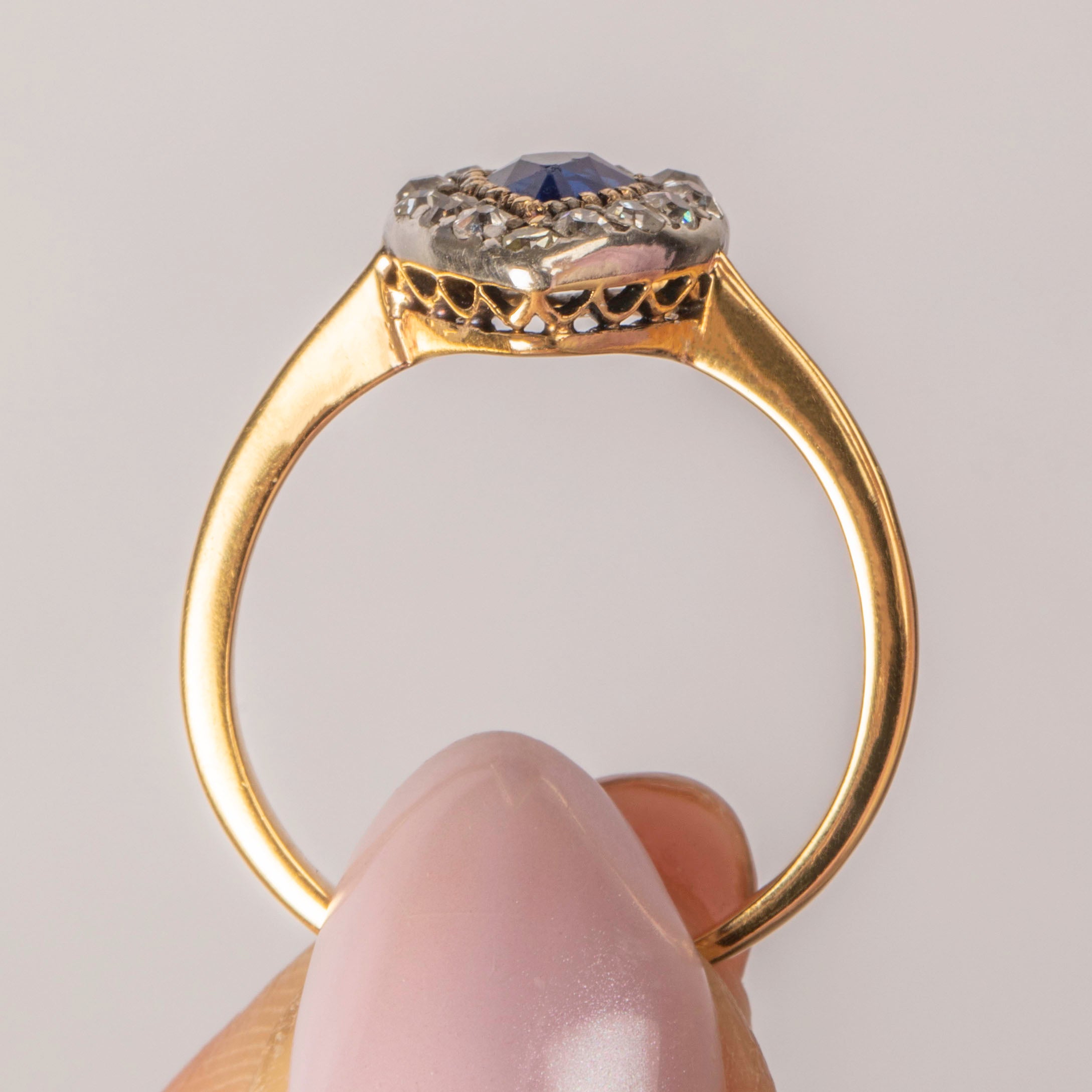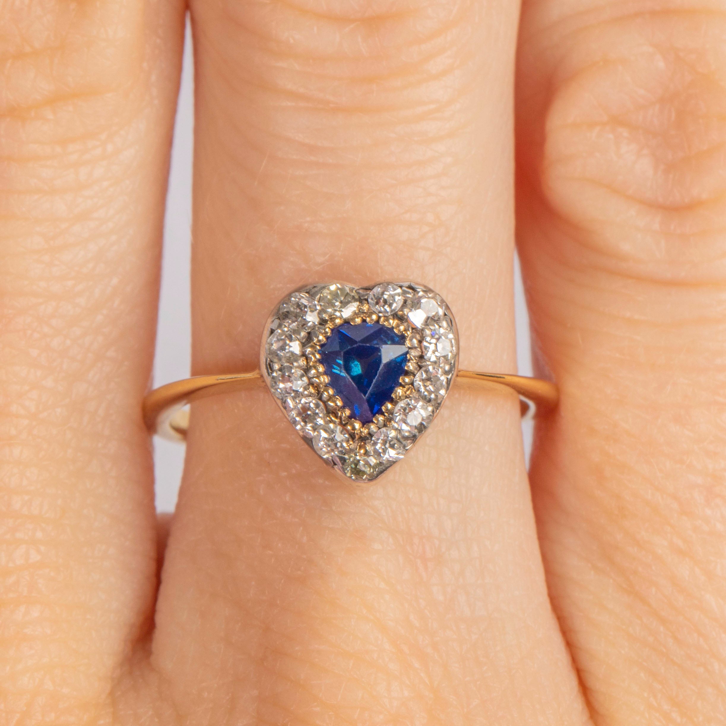This antique 18ct Gold Sapphire Diamond heart ring looks as though she has been plucked from a fairytale! Glistening from afar, you can't help but fall weak at the knees for her romantic heart form, inlaid with a midnight blue 0.30ct Sapphire at the centre, haloed by scintillating Diamonds.