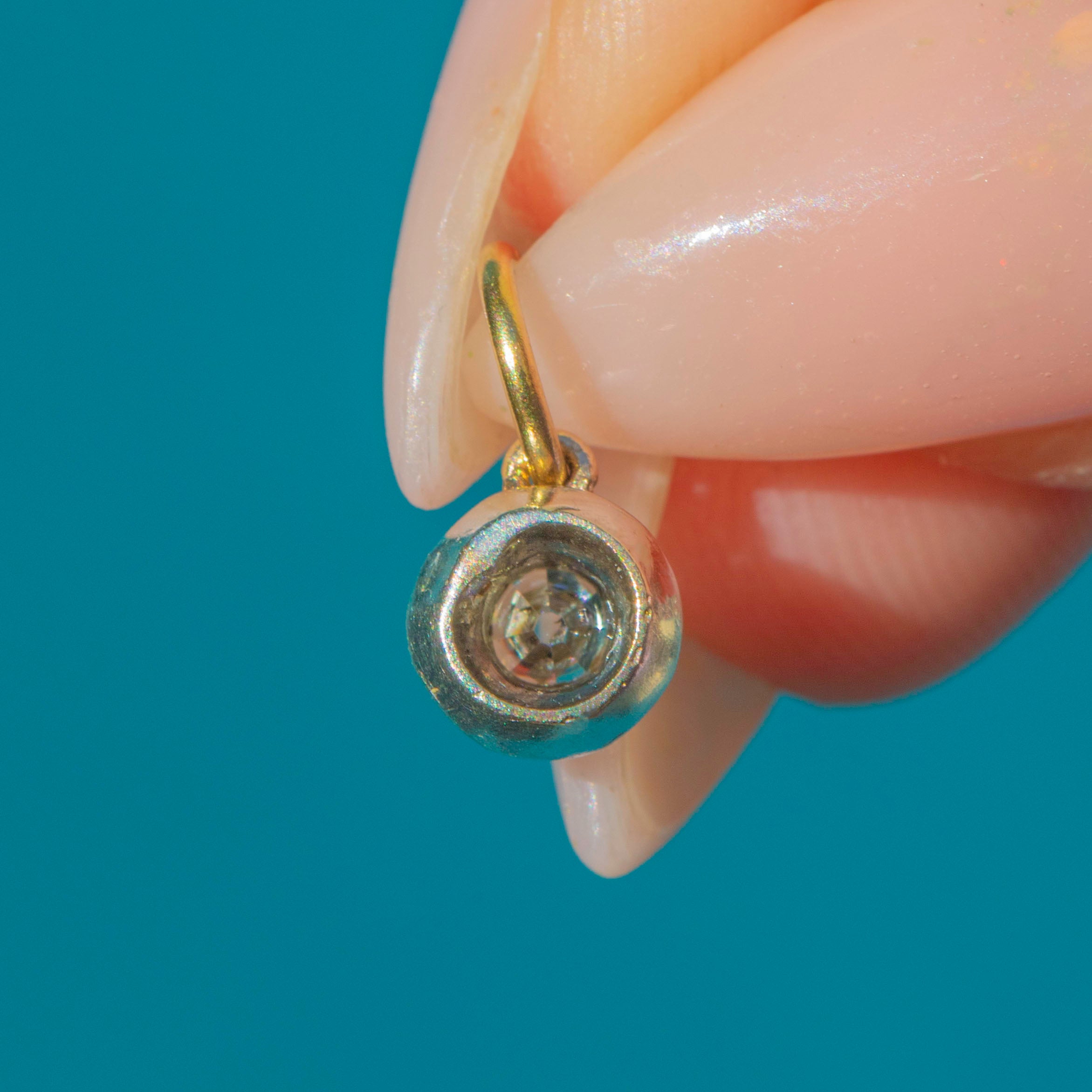 EXCELLENT: The Old Mine Cut Diamond is bright and secure, with no chips or surface abrasions. The Silver collet and 18ct Gold backing are in superb condition with minimal wear, and the Gold jump ring is strong and secure. A well-preserved and charming Victorian jewel.