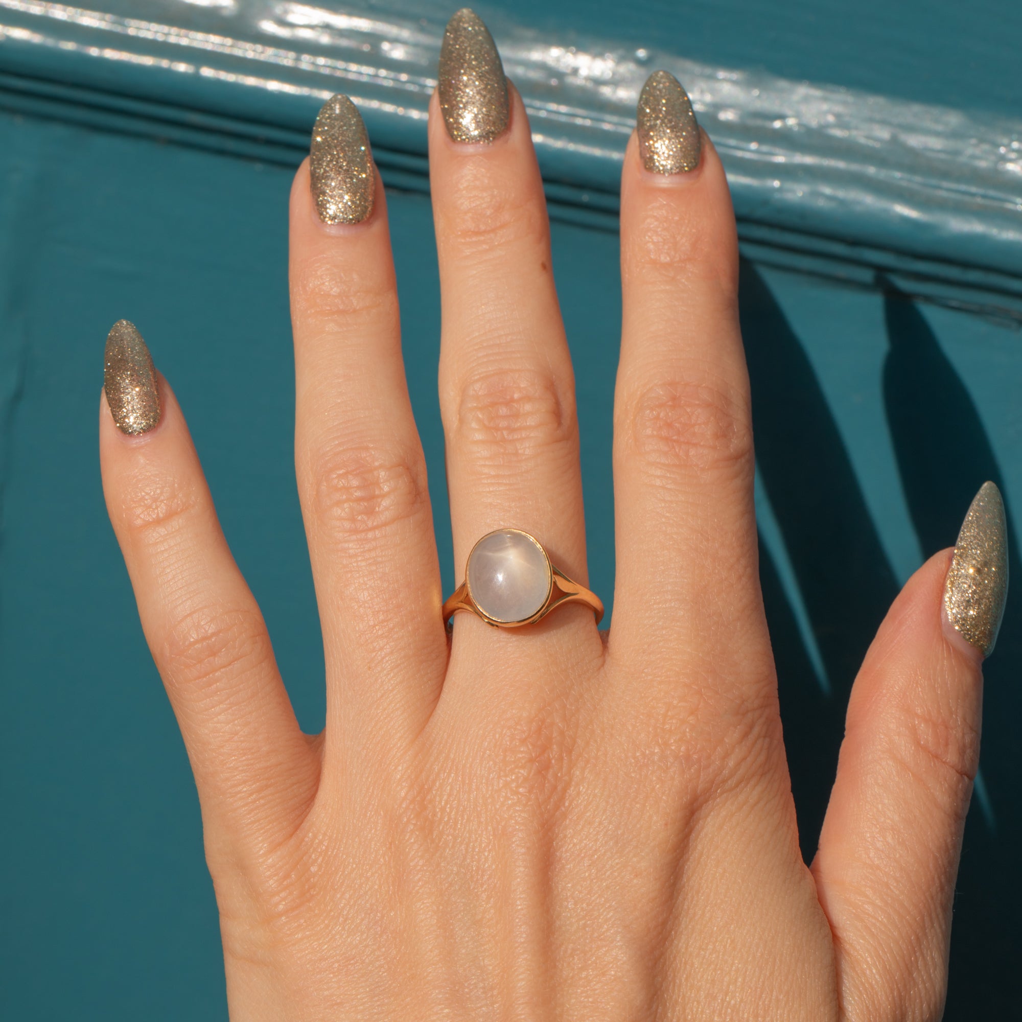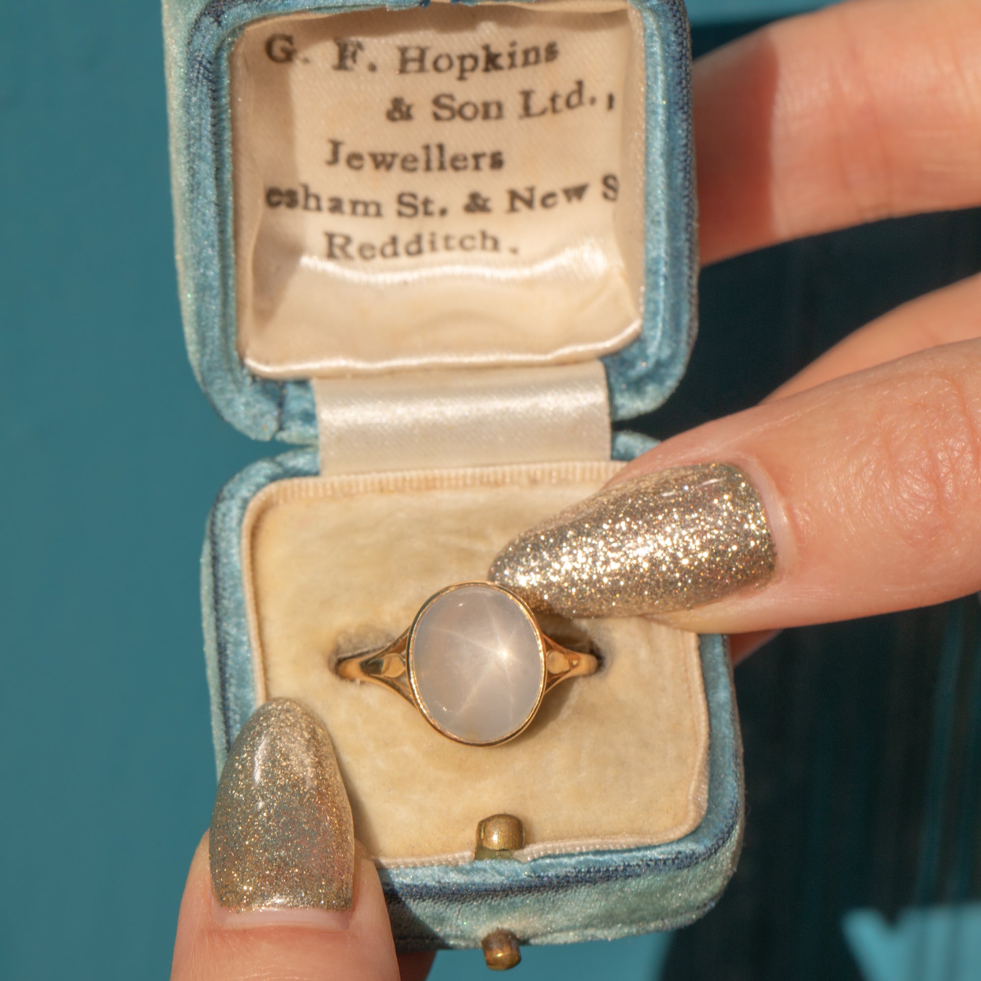 Add some celestial charm to your repertoire with this antique 18ct Gold star Sapphire ring! Homing a cloudy white 4.50ct Sapphire cabochon with sweet lilac overtones, as the light glides over her smooth cabochon cut a six point star reflects off of her surface, a testament to the wonders of mother nature.