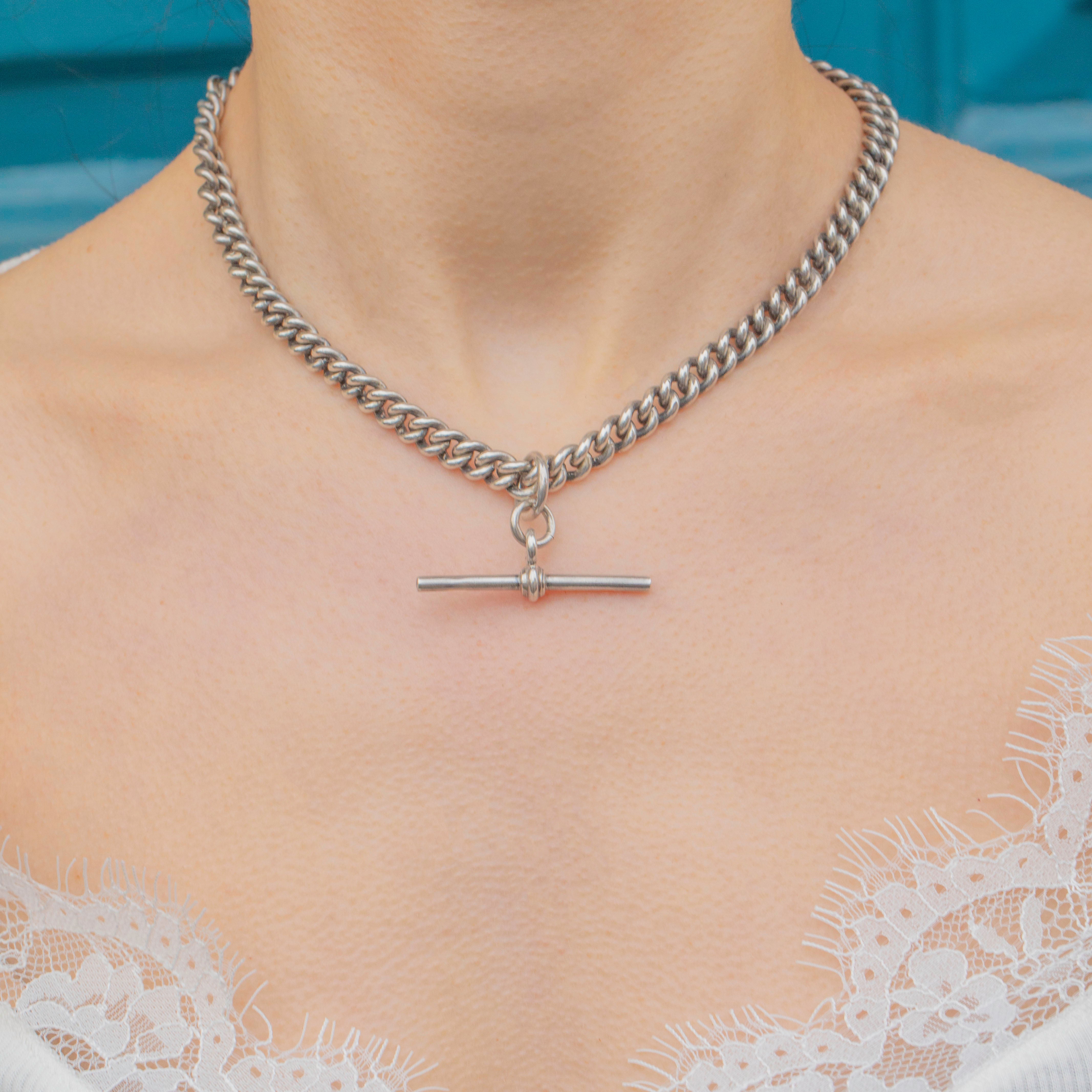 She is complete with a T-Bar and two sought-after dog clips, making this a collectible piece of Victorian jewellery. A highly versatile Victorian chain is the ultimate statement piece, and can be worn as a standalone chain or have charms suspended from its dog-clips for a personal touch!