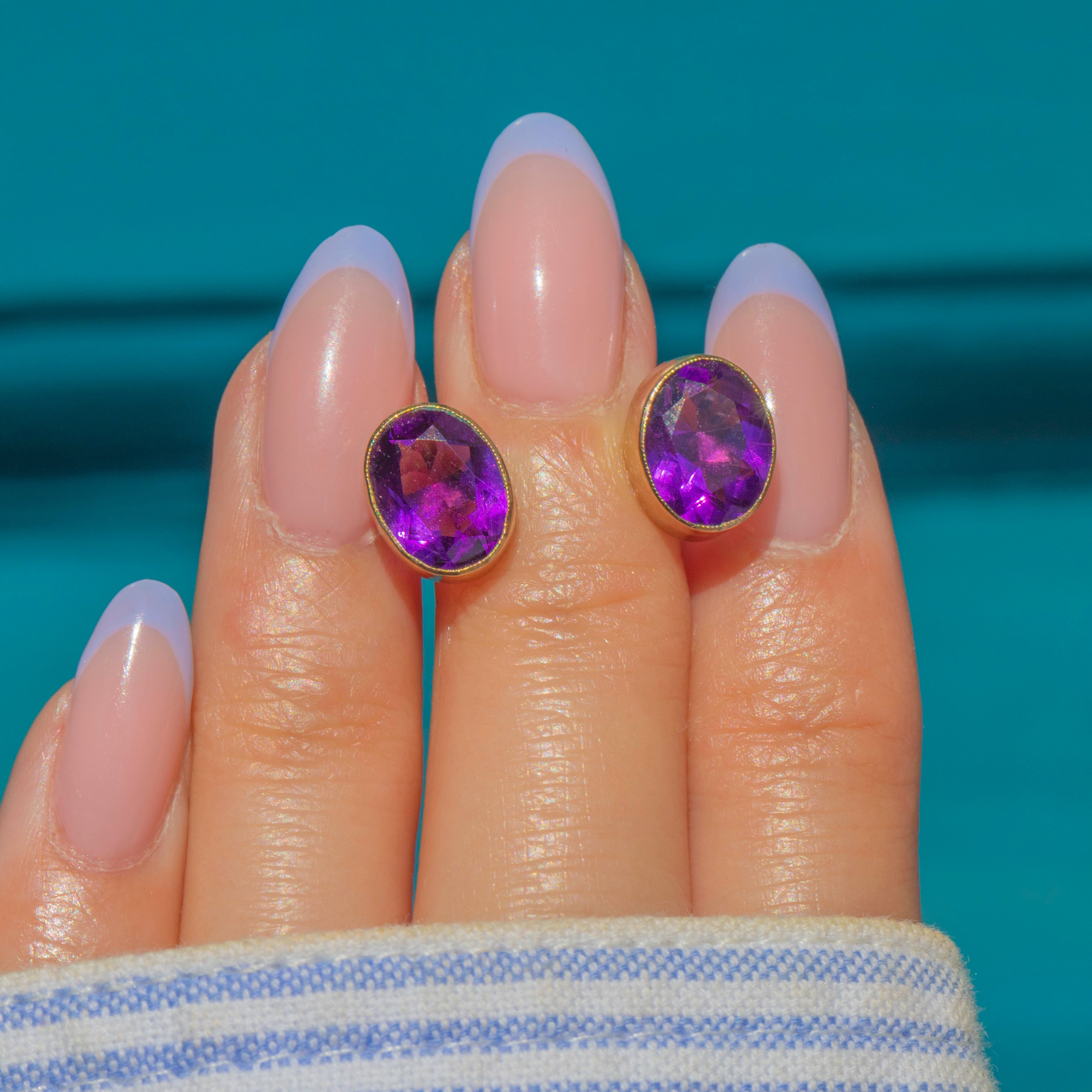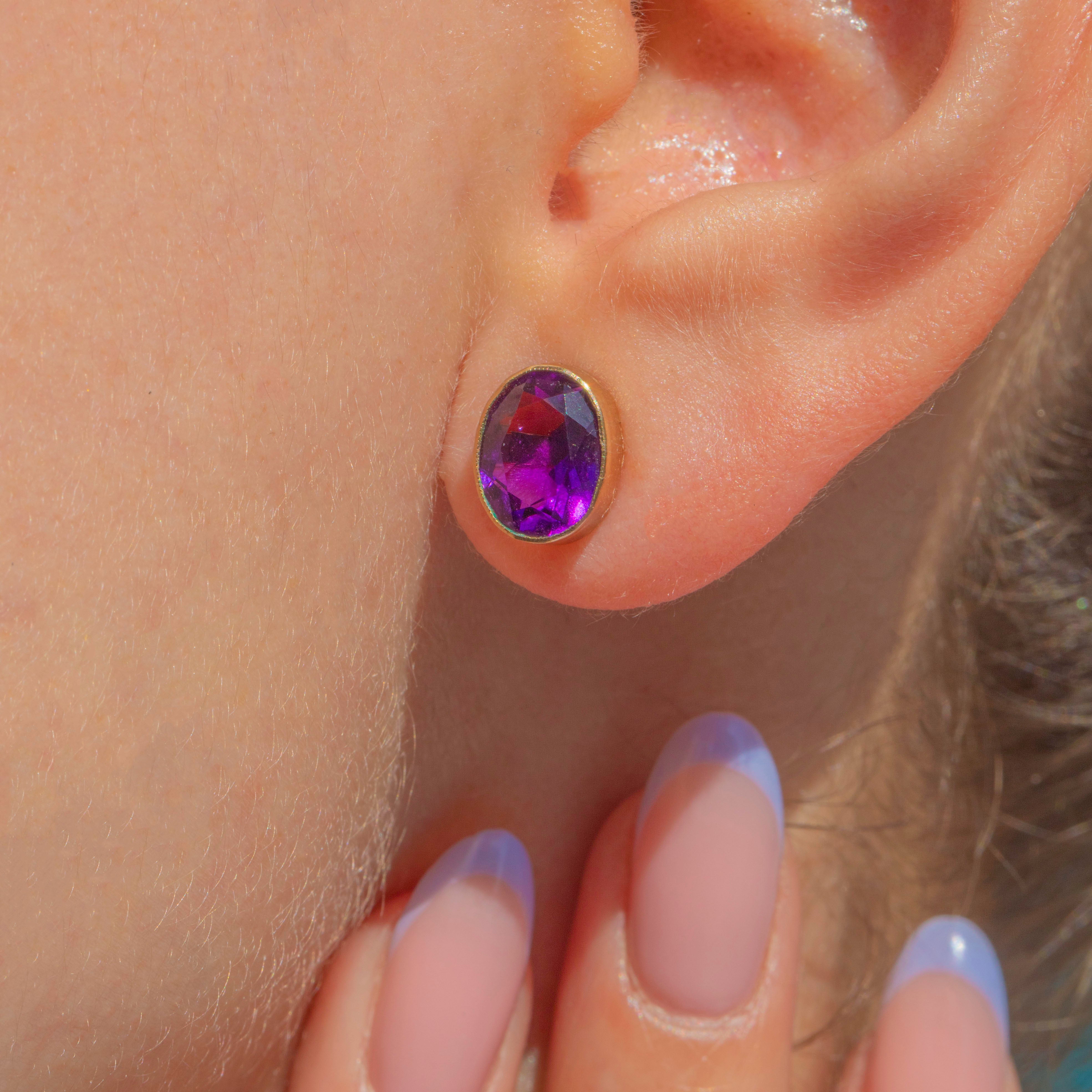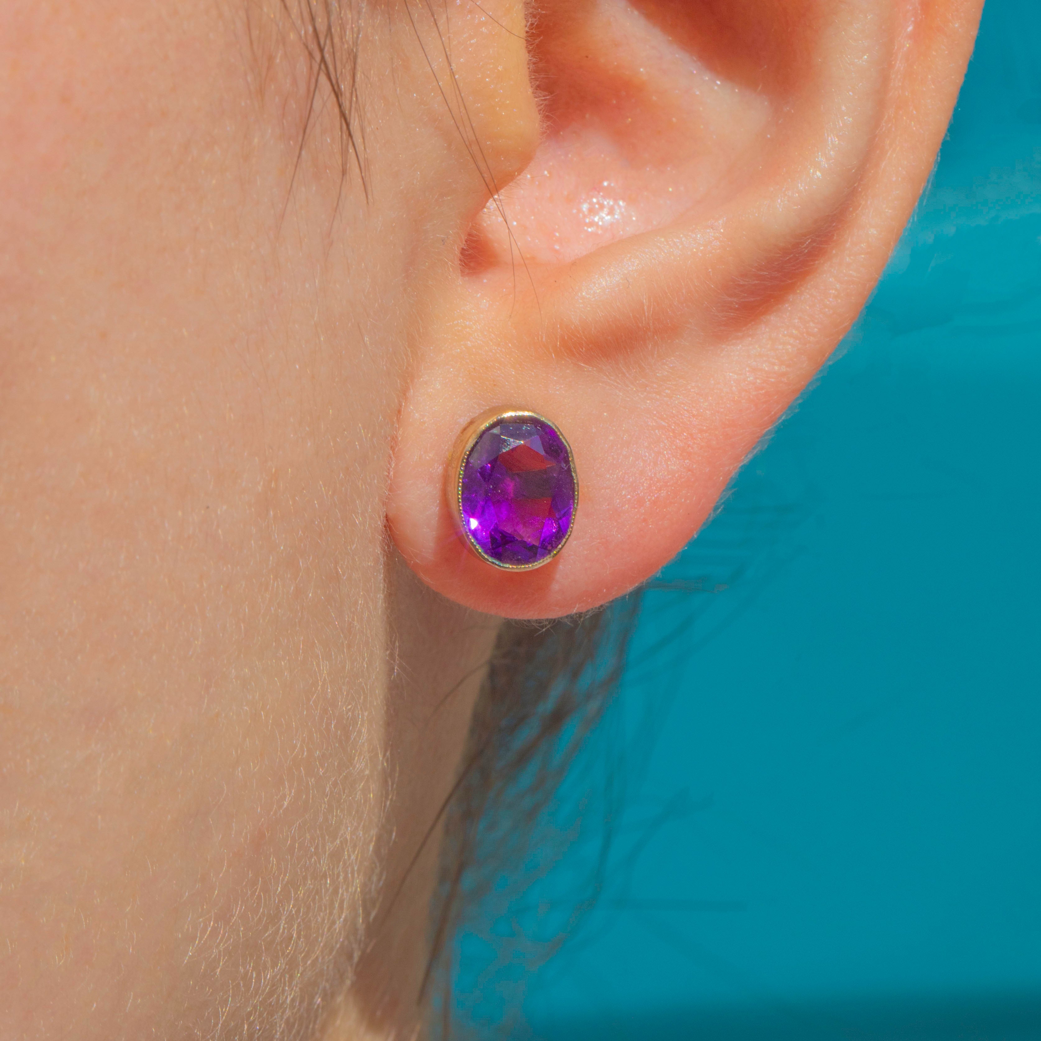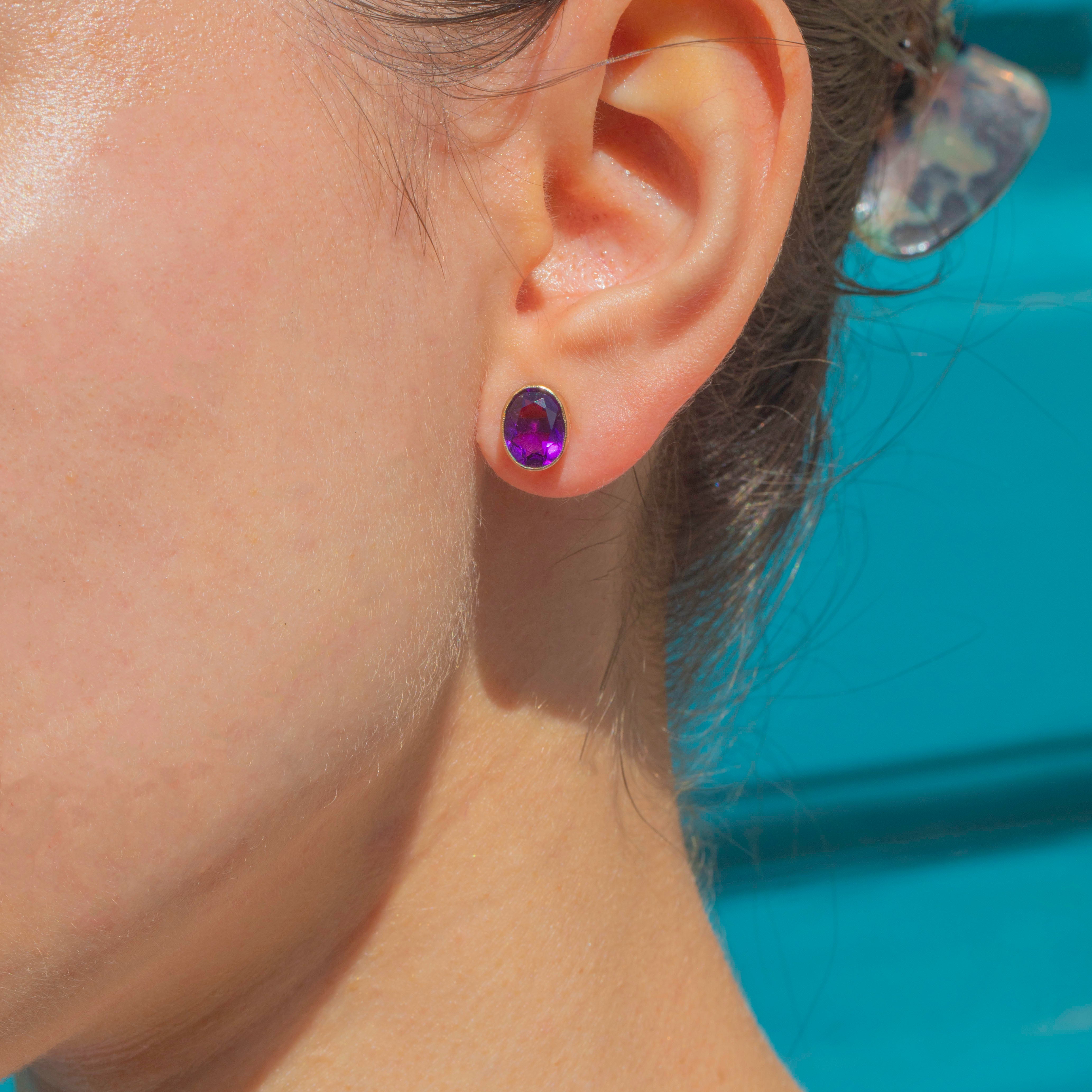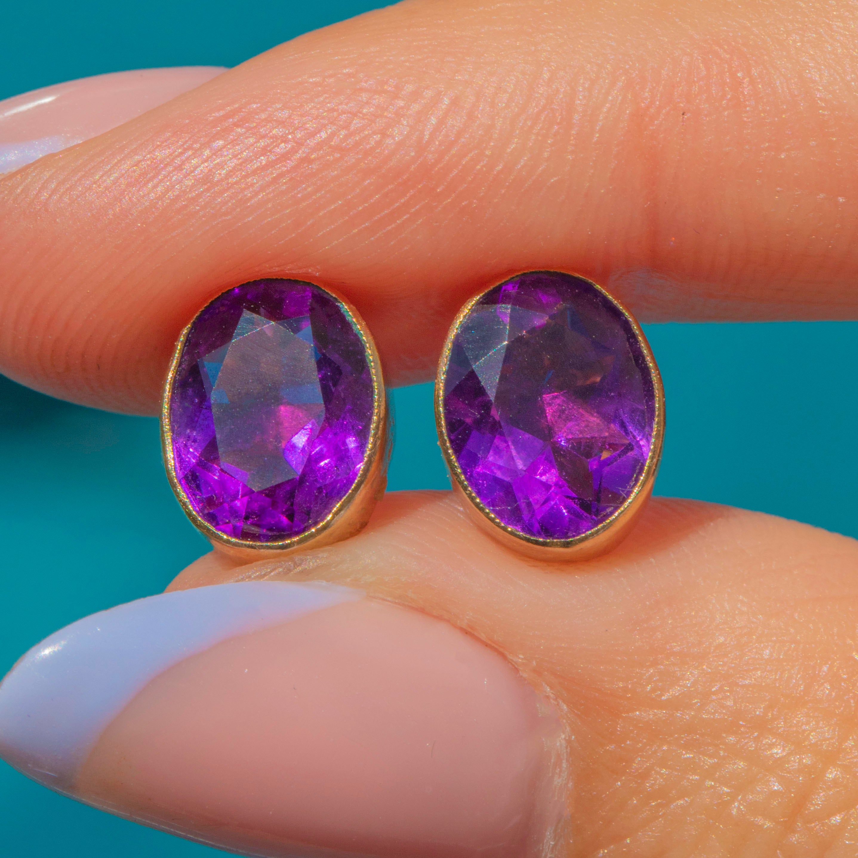 VERY GOOD-EXCELLENT: These antique 9ct Gold Amethyst bezel-set stud earrings are in wonderful condition. The Amethysts have a deeply saturated hue and crisp facets that are free from chips or abrasions. The Gold is buttery and the bezels robust, with only minor surface wear commensurate with age. With secure posts and snug-fitting butterfly backs, you can enjoy wearing these antique Amethyst earrings with absolute confidence!