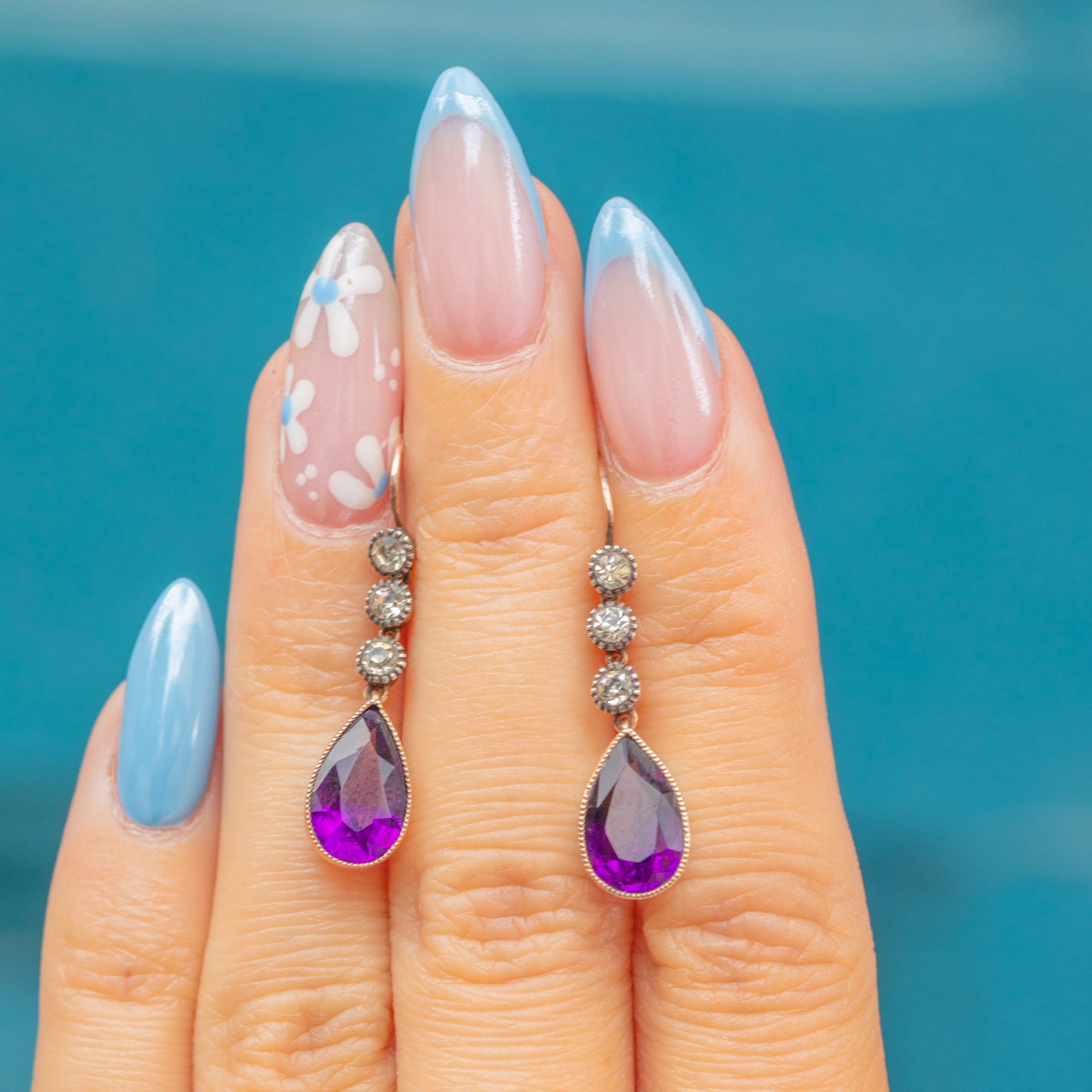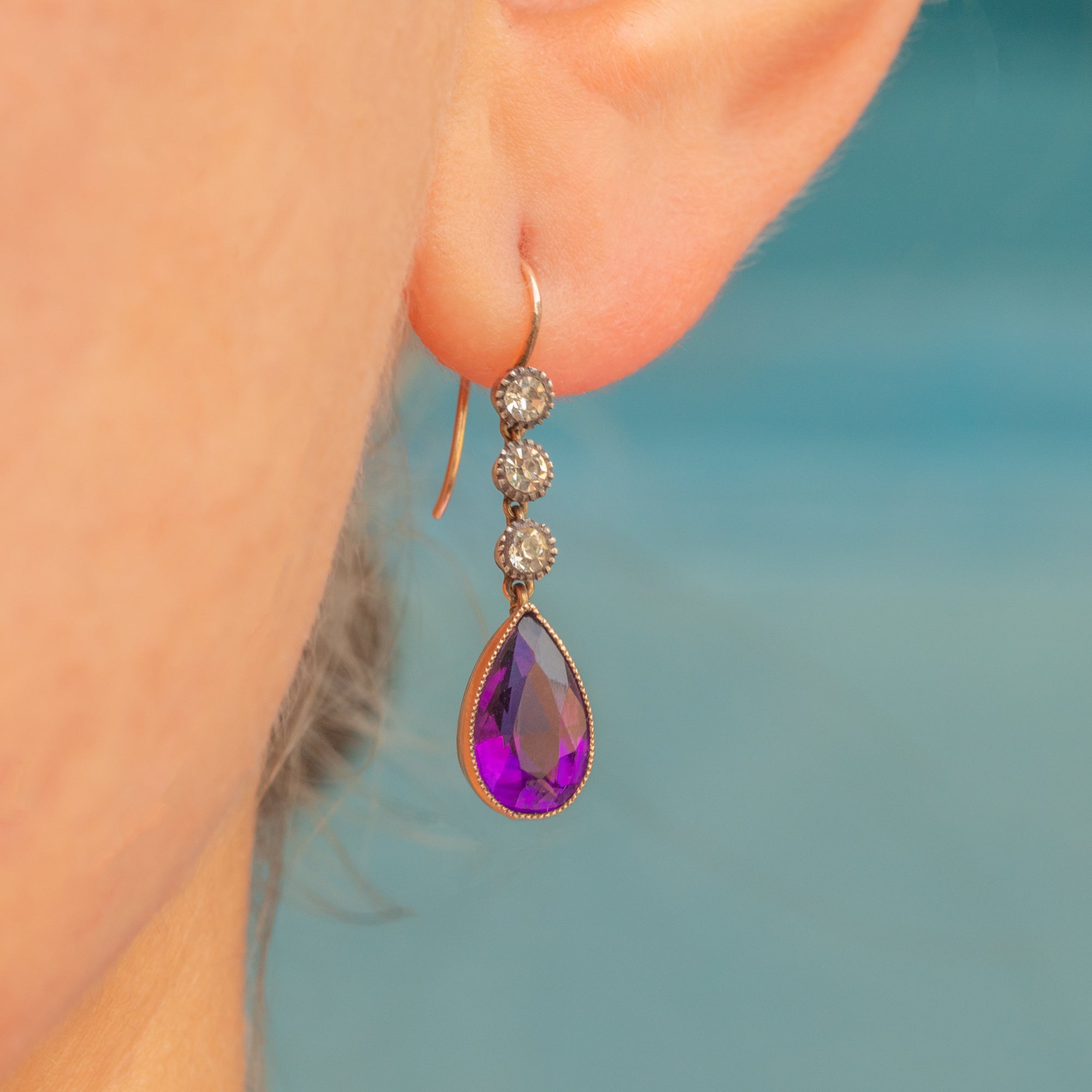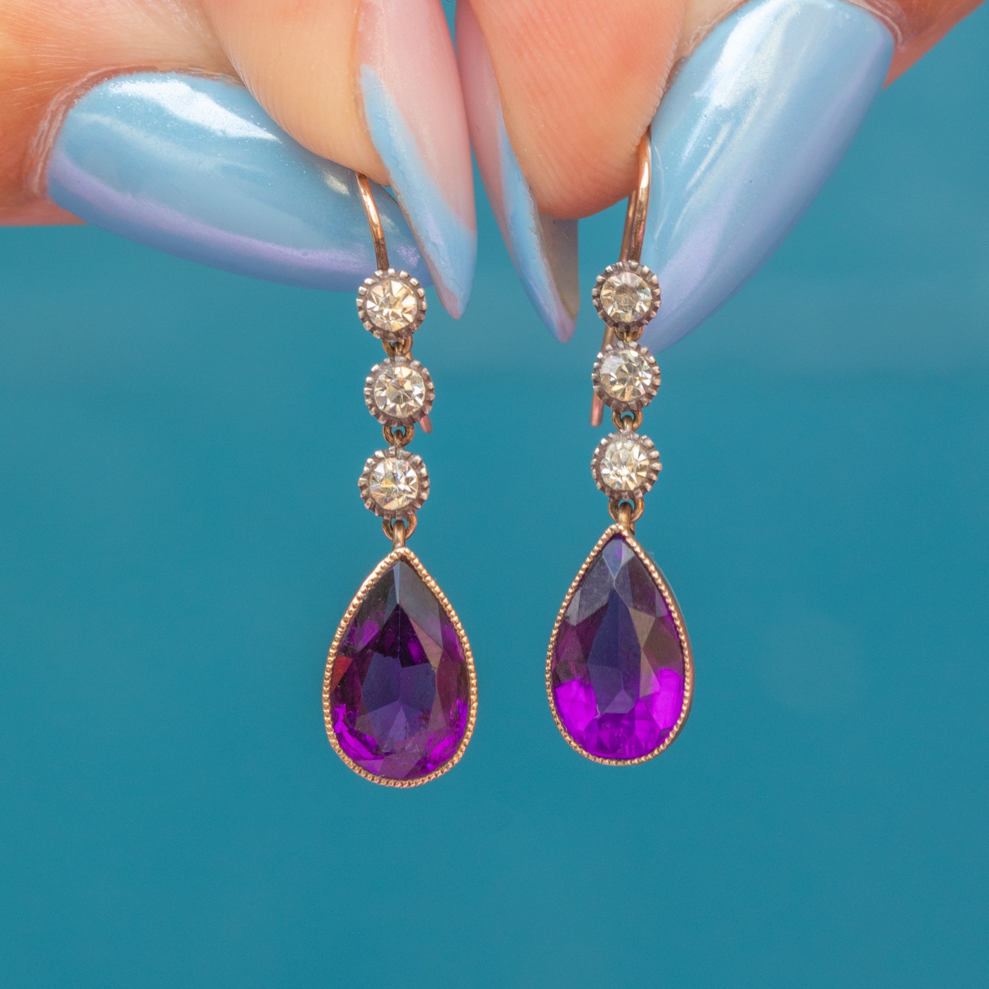 Each drop earring boasts a vibrant royal purple Paste, expertly cut into an elegant pear shape, and is adorned by a trio of twinkling Diamond Paste stones. Dancing with movement as they suspend from your lobes, these Victorian drop earrings are the perfect versatile pair to add to your collection.