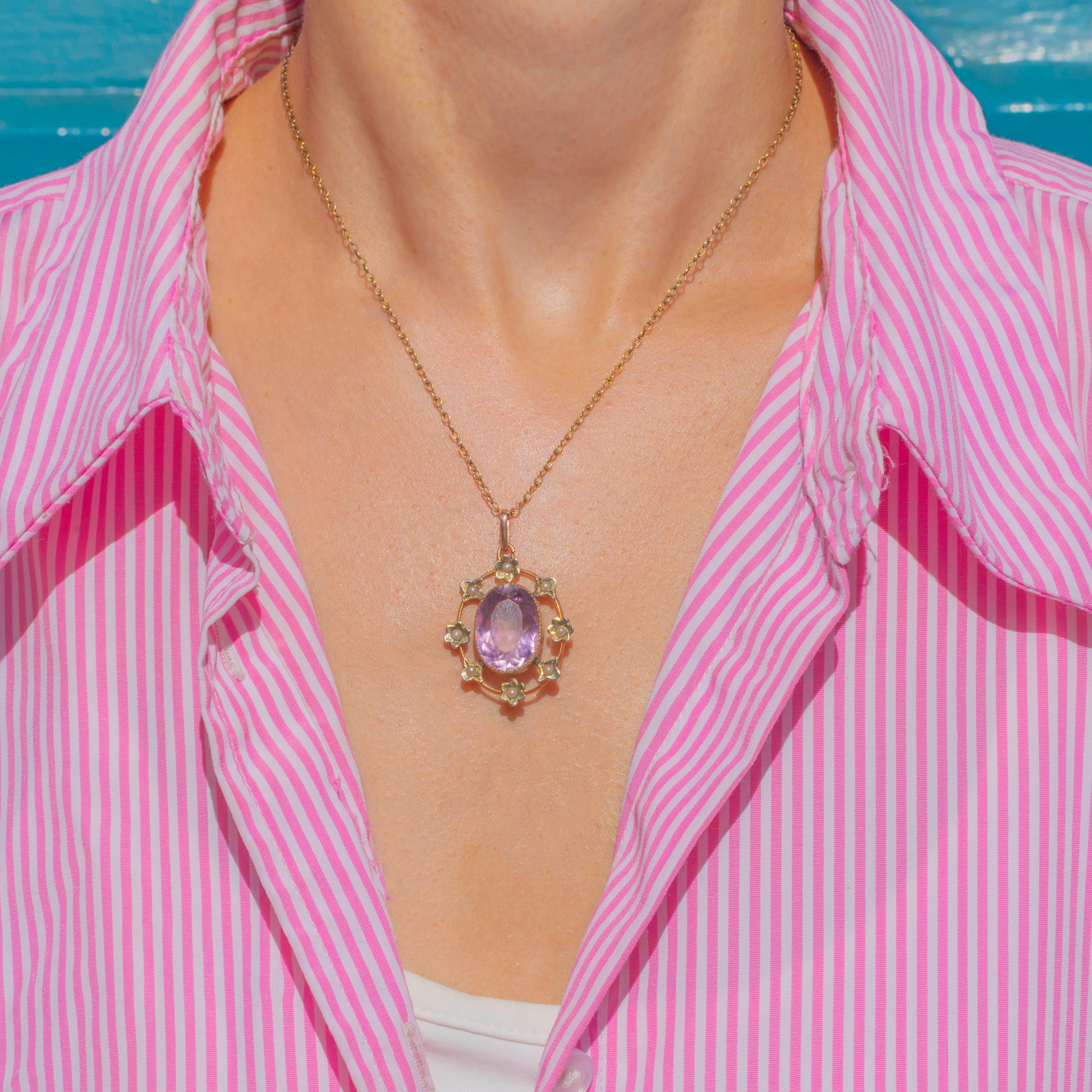 Set with a 9.60ct Amethyst, this antique Gold pendant has a whimsical feel! The lavender-hued Amethyst is haloed by Pearl-set flowers and fleur-de-lys to create a feminine piece that'll pair perfectly with a belcher chain.
