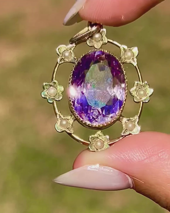 Antique 9ct Gold Amethyst Pearl Flower Cluster Pendant 9.60ct