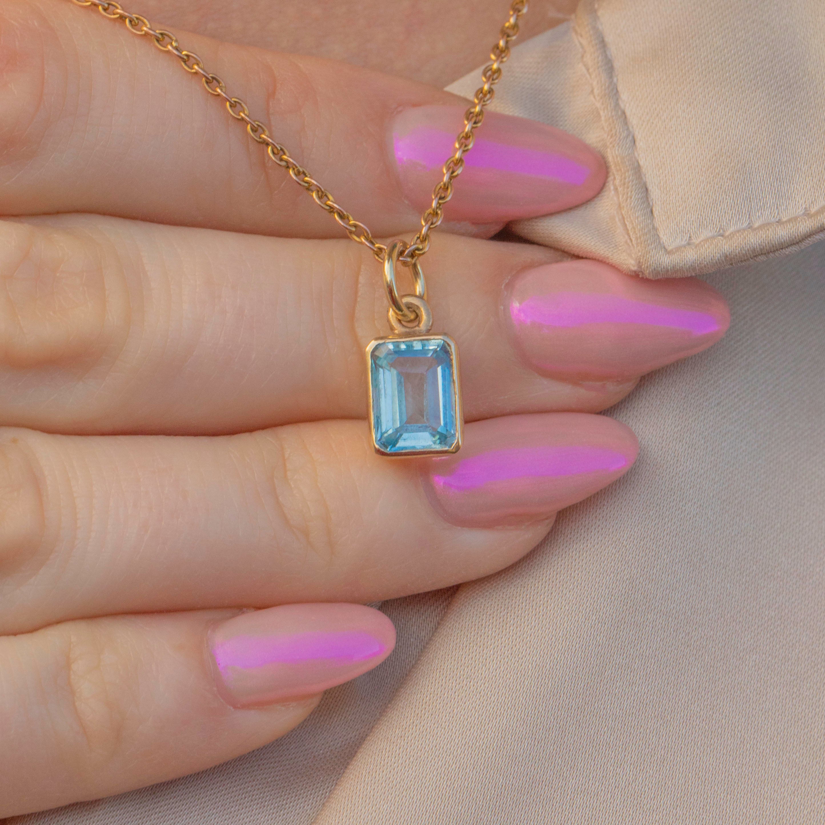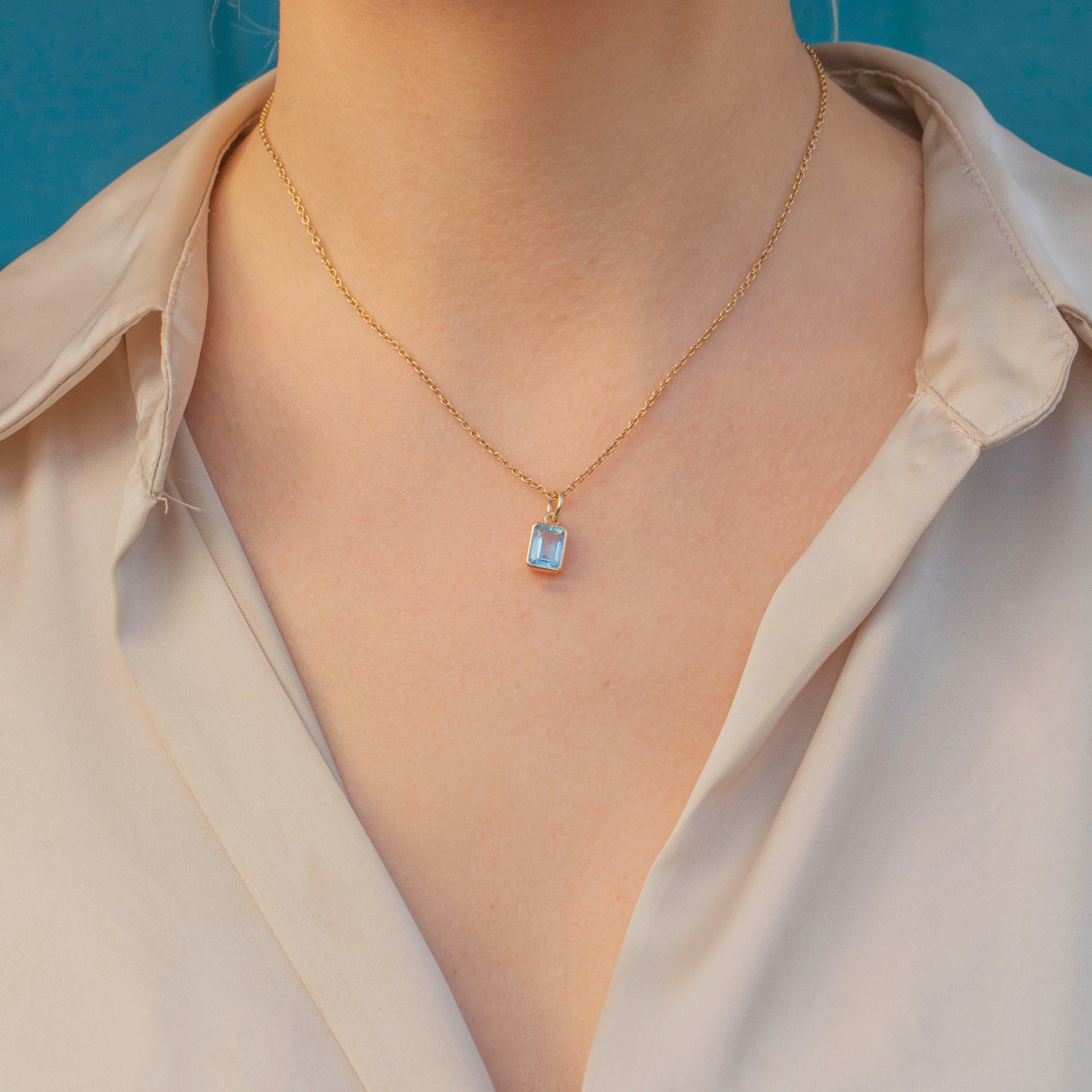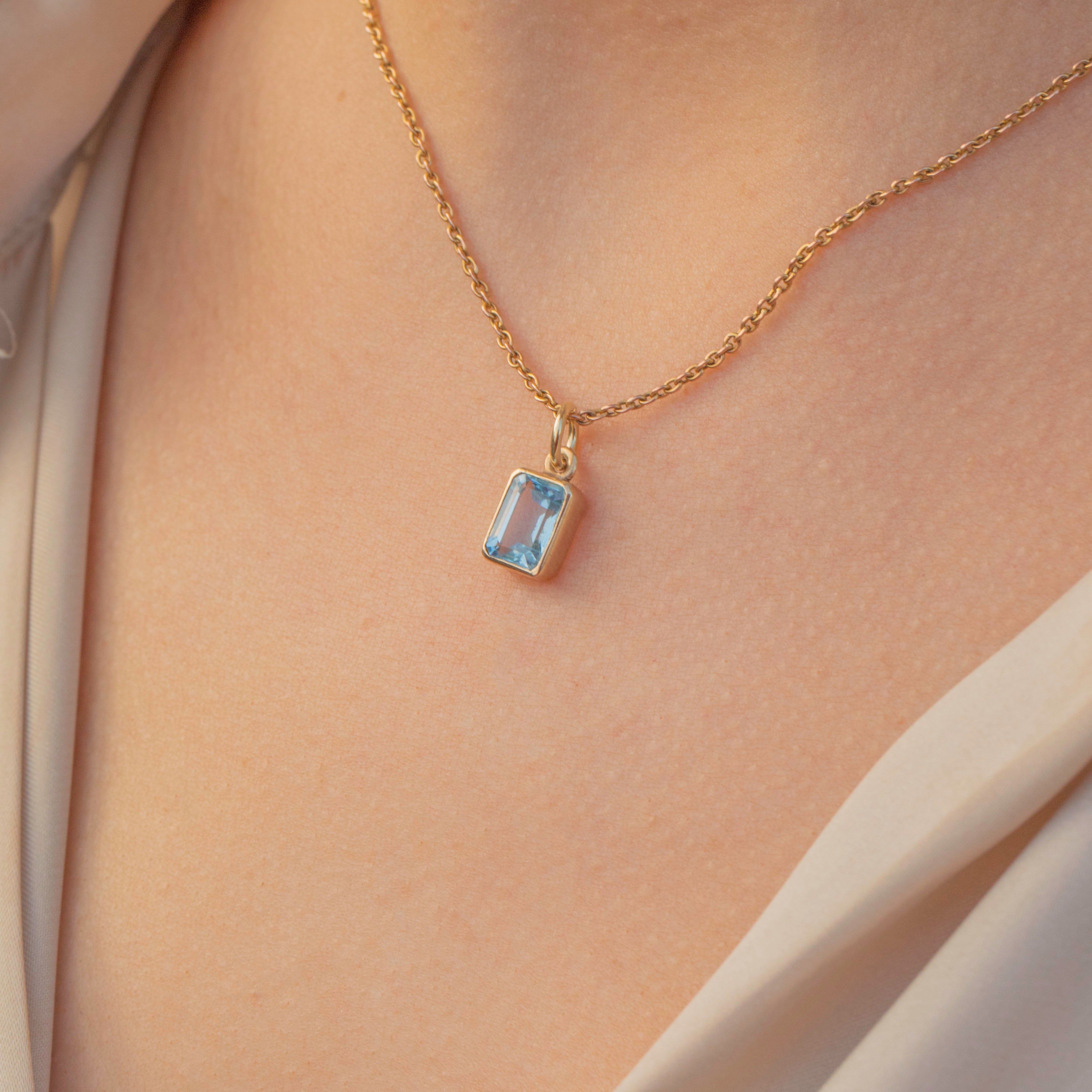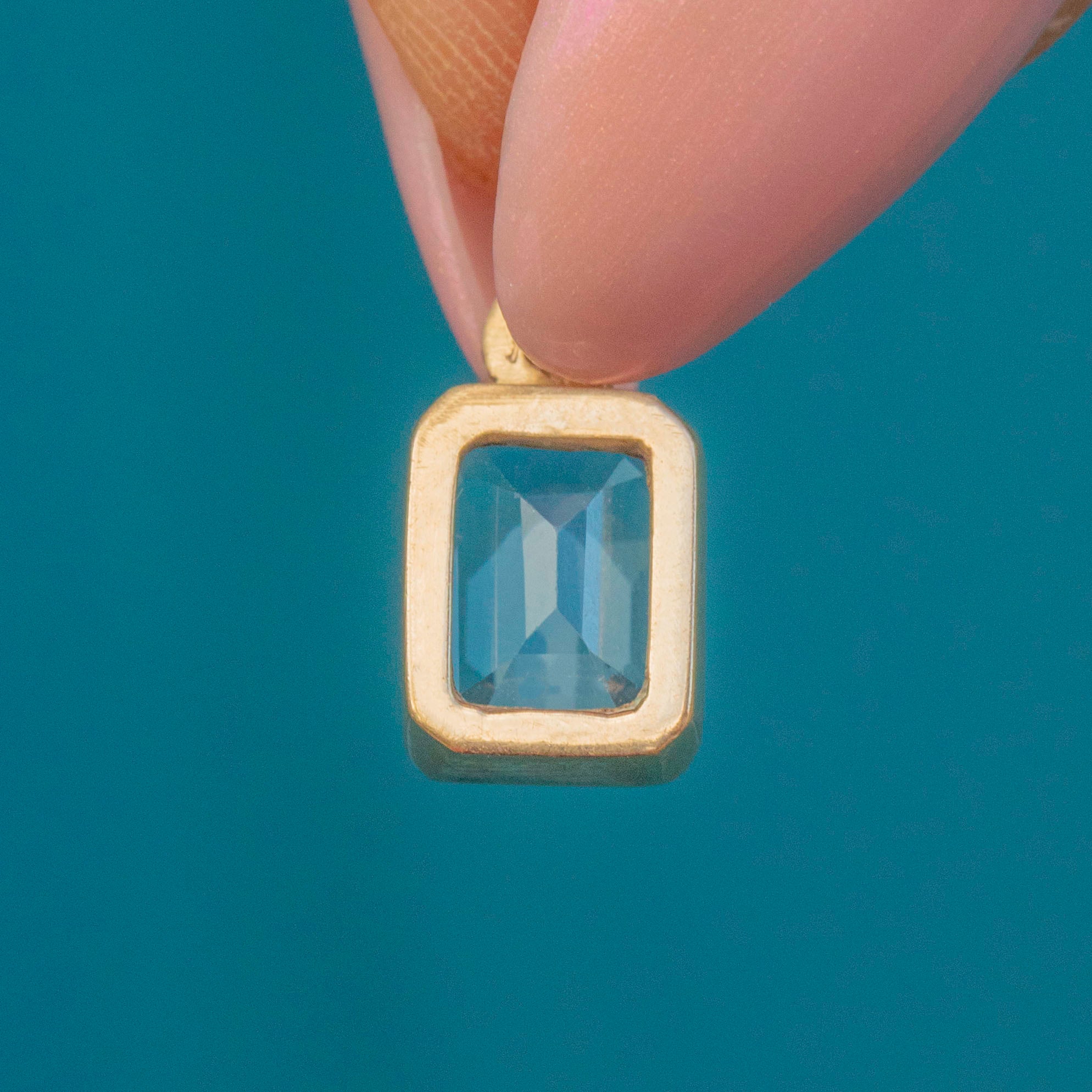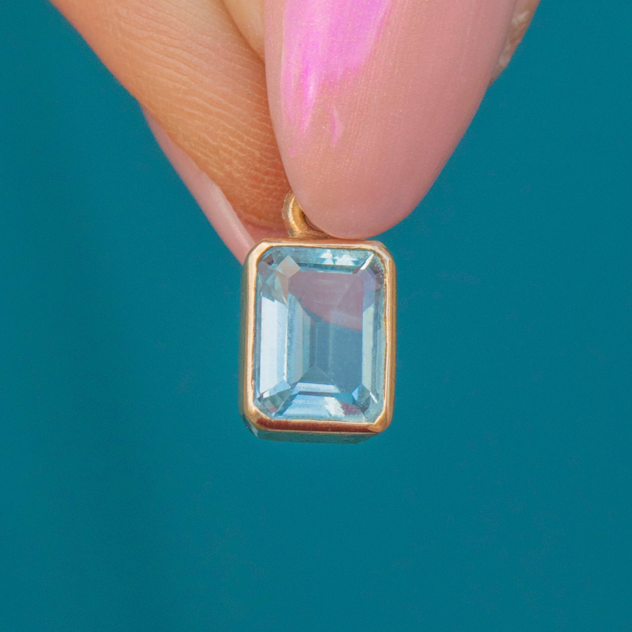 This stunning antique 9ct Gold Blue Topaz charm features a rectangular-cut light blue Topaz, sparkling like sunlight on a clear lake. Set in a warm 9ct Gold bezel, she’s a perfect blend of antique elegance and timeless style.