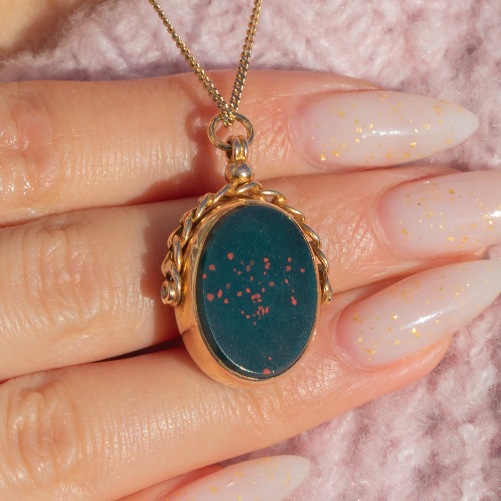 VERY GOOD: The Carnelian shows light surface scratching and the Bloodstone has minor abrasions consistent with age. The 9ct Gold frame is bright with gentle patina and light wear to high points only. The swivel mechanism and bail are secure and operate smoothly, with no visible dents or repairs.