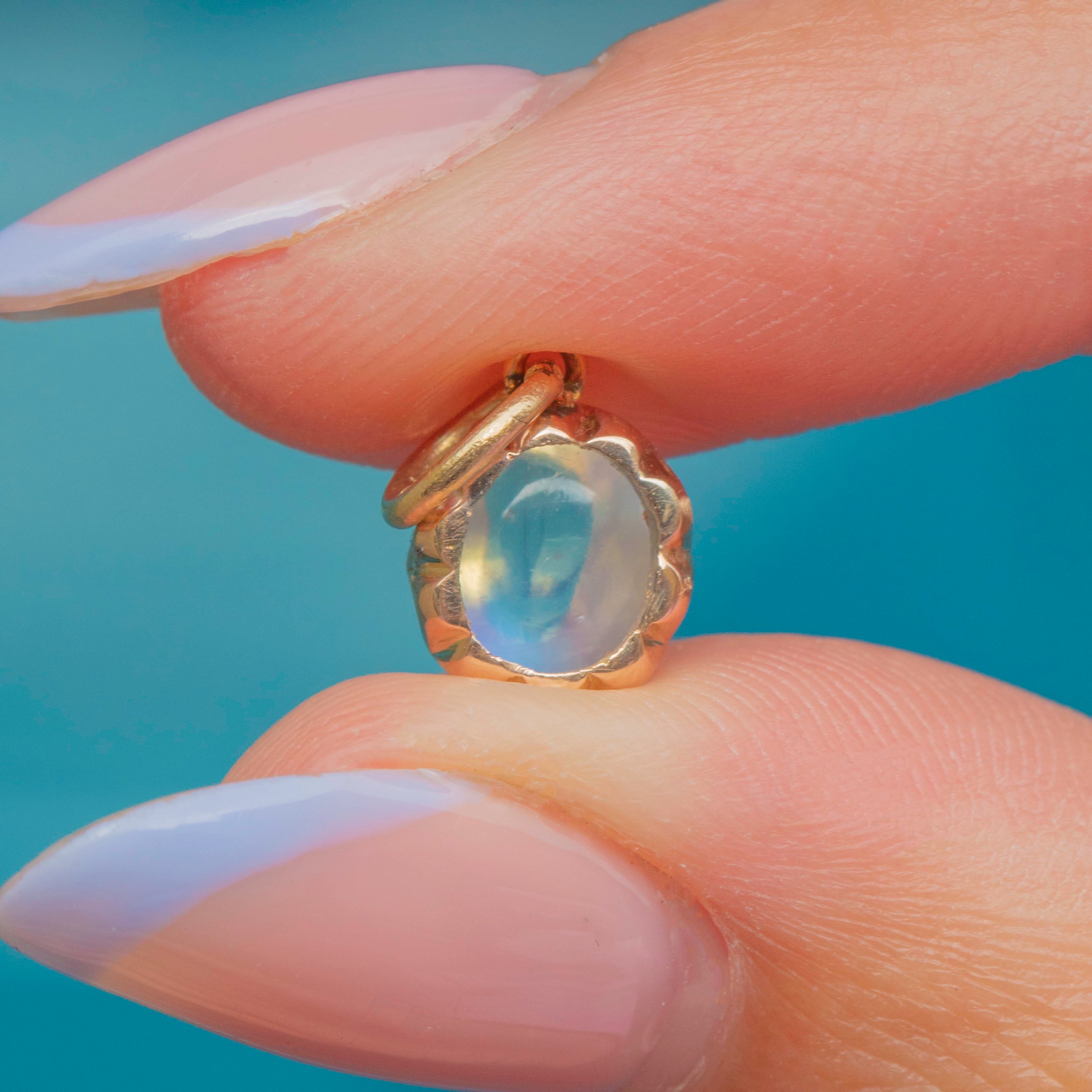 VERY GOOD: This Victorian 9ct Gold Ceylon Moonstone charm is in very good condition. The Moonstone is radiant and set securely within her claw settings. There are some small nibbles to the Moonstone, though this is commensurate with age and only visible under close inspection. With a securely soldered jump ring, you can wear this antique charm with utmost confidence!