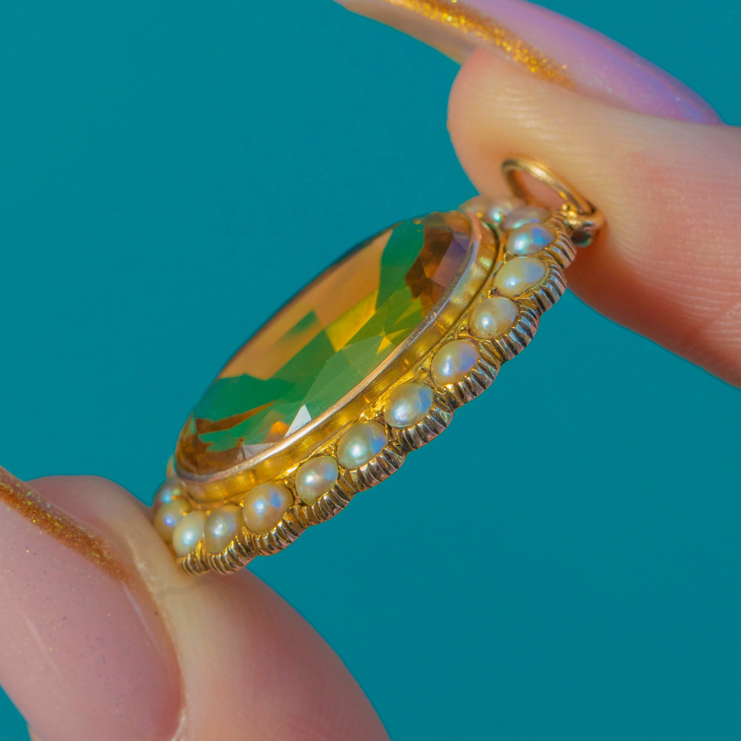 This gorgeous antique pendant centres on a rich golden Citrine in a classic oval cut, surrounded by a sweet halo of creamy Pearls. The 10.40ct Citrine is beautifully proportioned and full of life, creating a wonderfully luxurious look on the neckline.