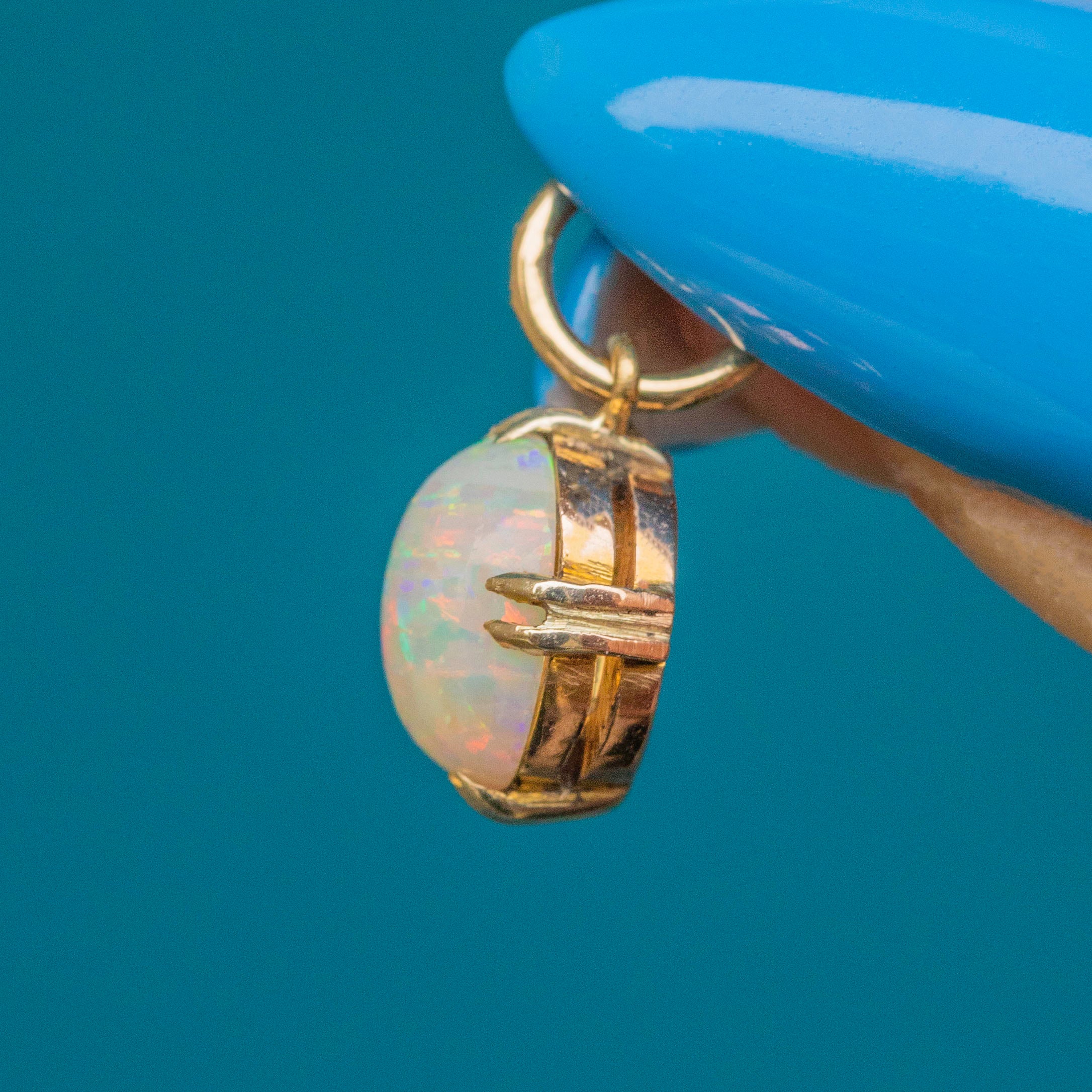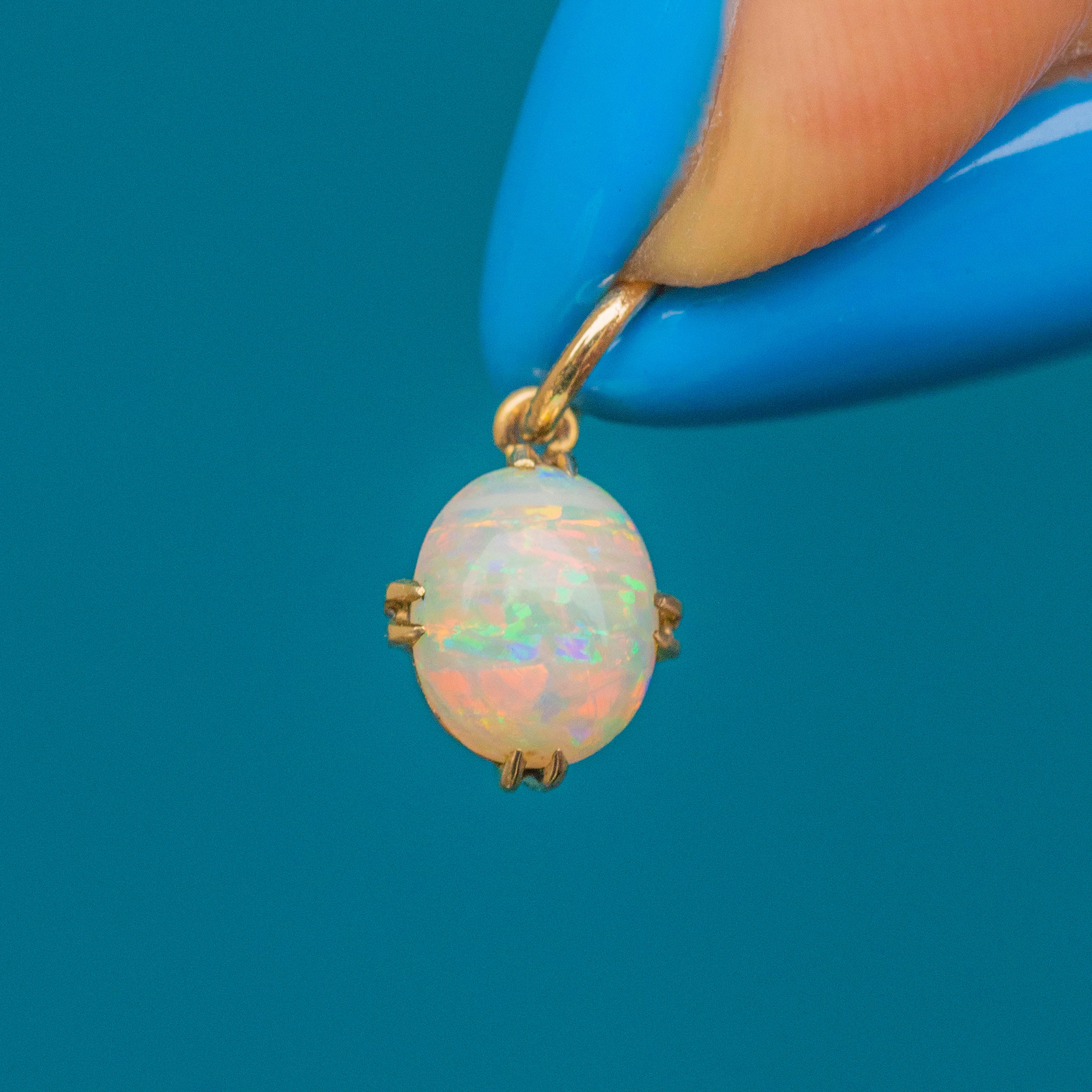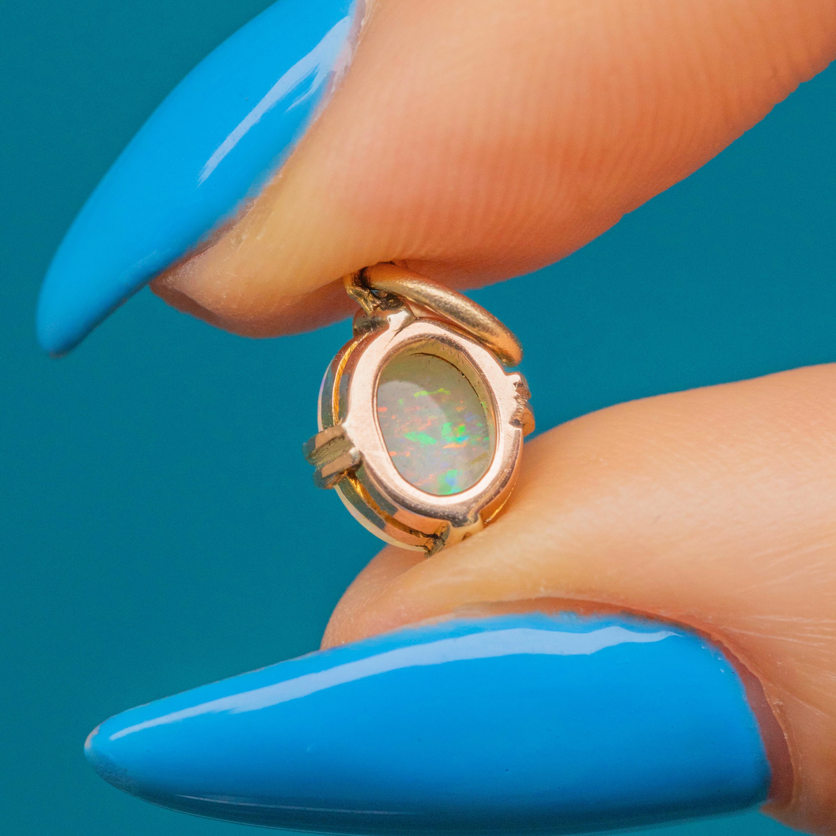 VERY GOOD-EXCELLENT. This antique 9ct Gold Confetti Opal cabochon charm is in wonderful condition. The Opal is vibrant and majestic, radiating a playful array of colours, and free from chips or abrasions. She sits securely within her setting, which has only minor signs of wear commensurate with age. A beautiful piece, this Victorian charm is a must-have!