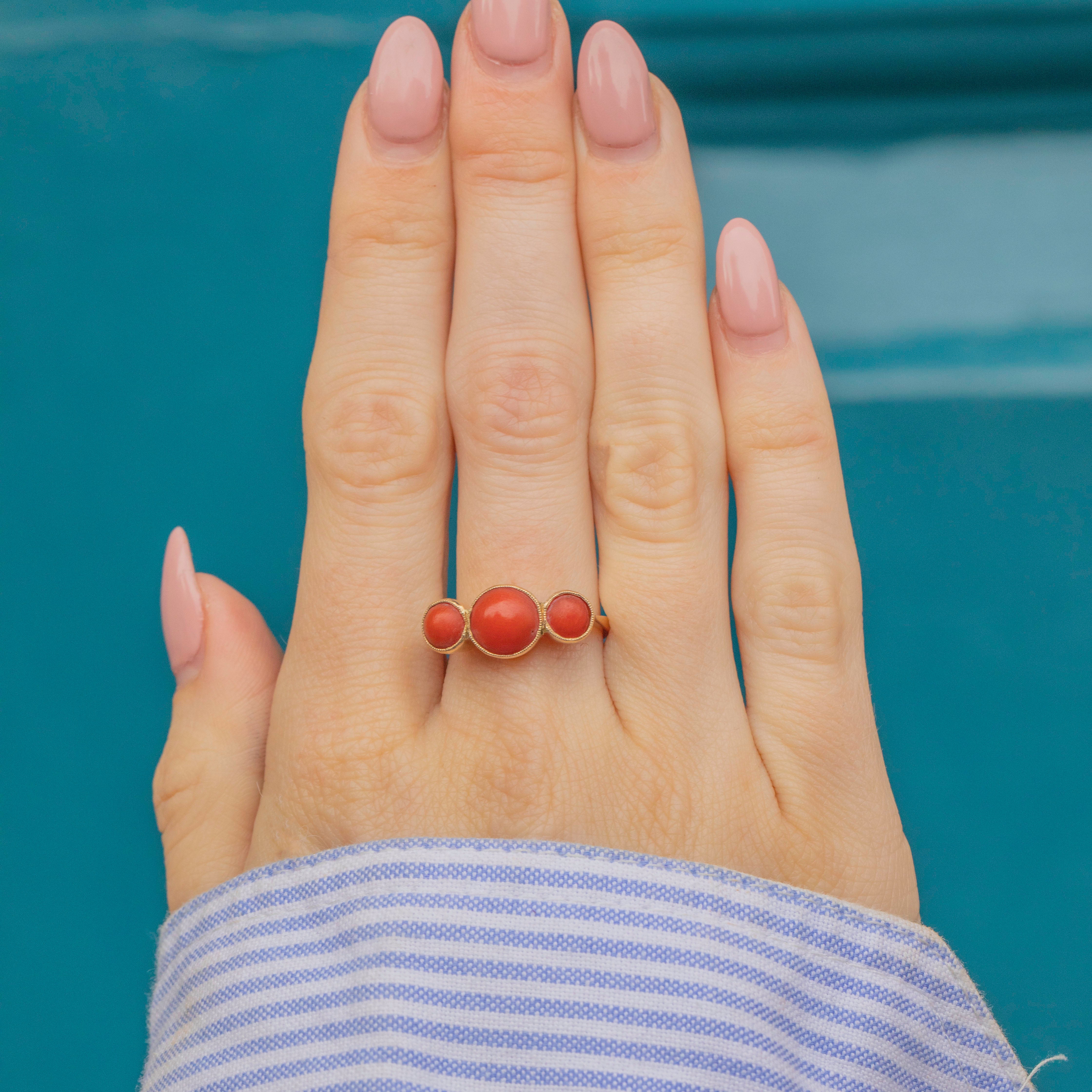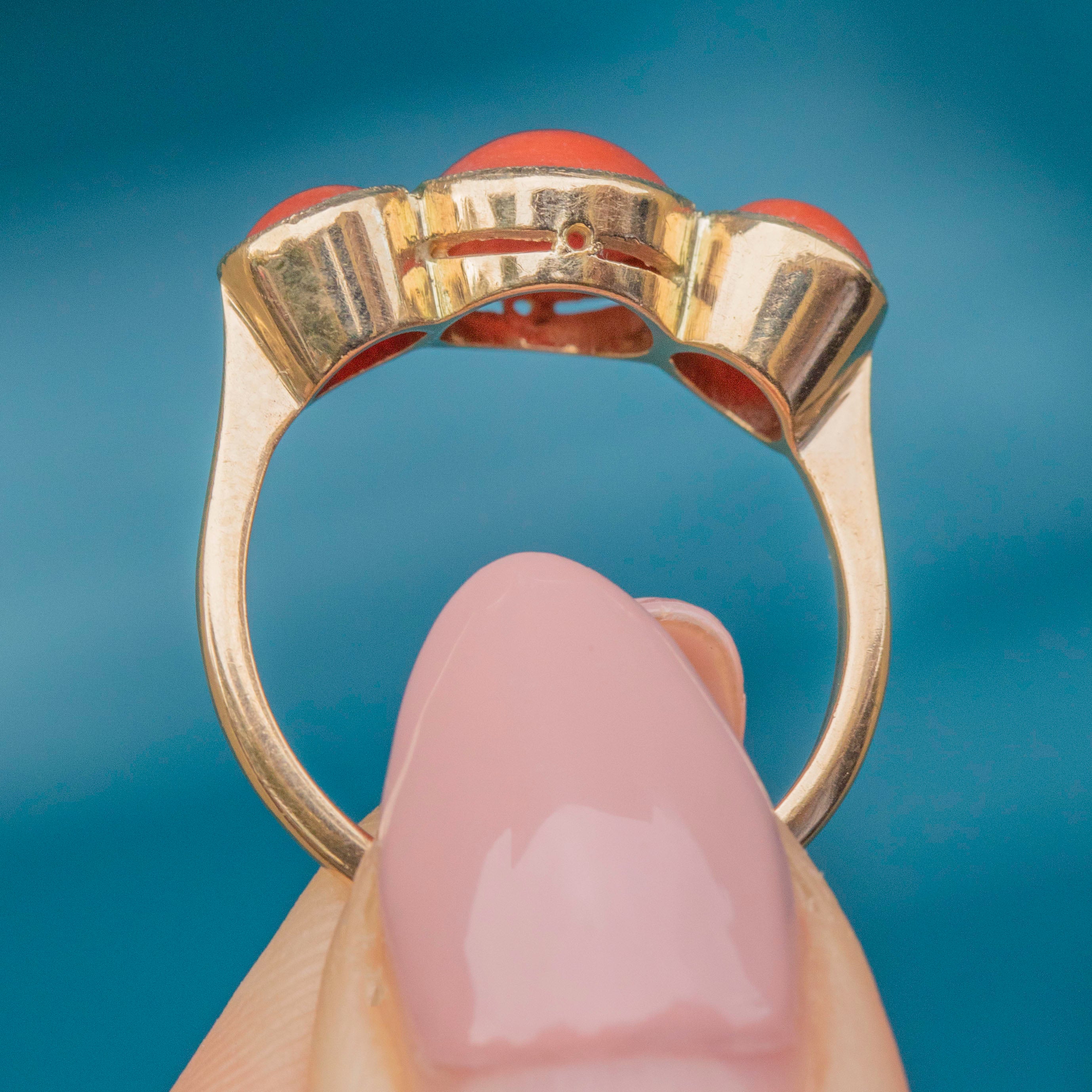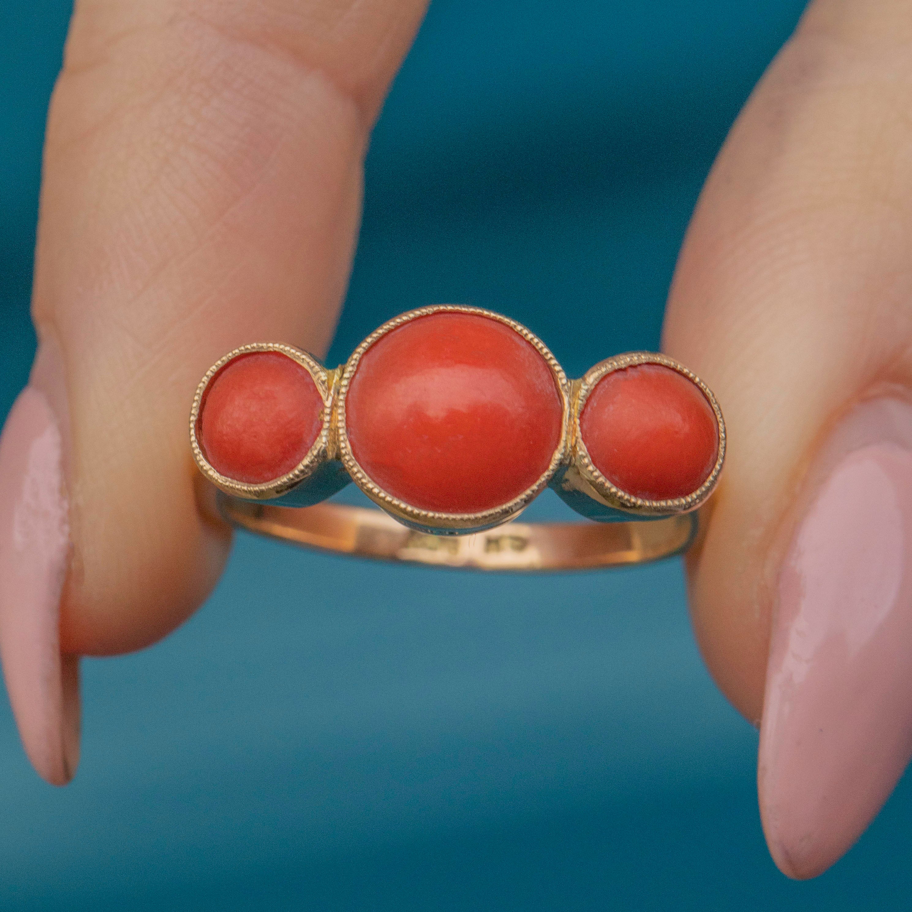 VERY GOOD. This antique 9ct Gold Coral trilogy ring is in very good condition. The Gold is buttery with wonderful reflective qualities, and the band has retained its form well over the years. The Coral stones are perfectly smooth, they have sunk slightly in their bezels, meaning they have slight movement, but they are still set securely. As Coral is a natural, organic stone, this ring should be worn with care, avoiding wet and humid conditions. With so much life left in her, don't hesitate to make this unique statement ring your newest obsession!