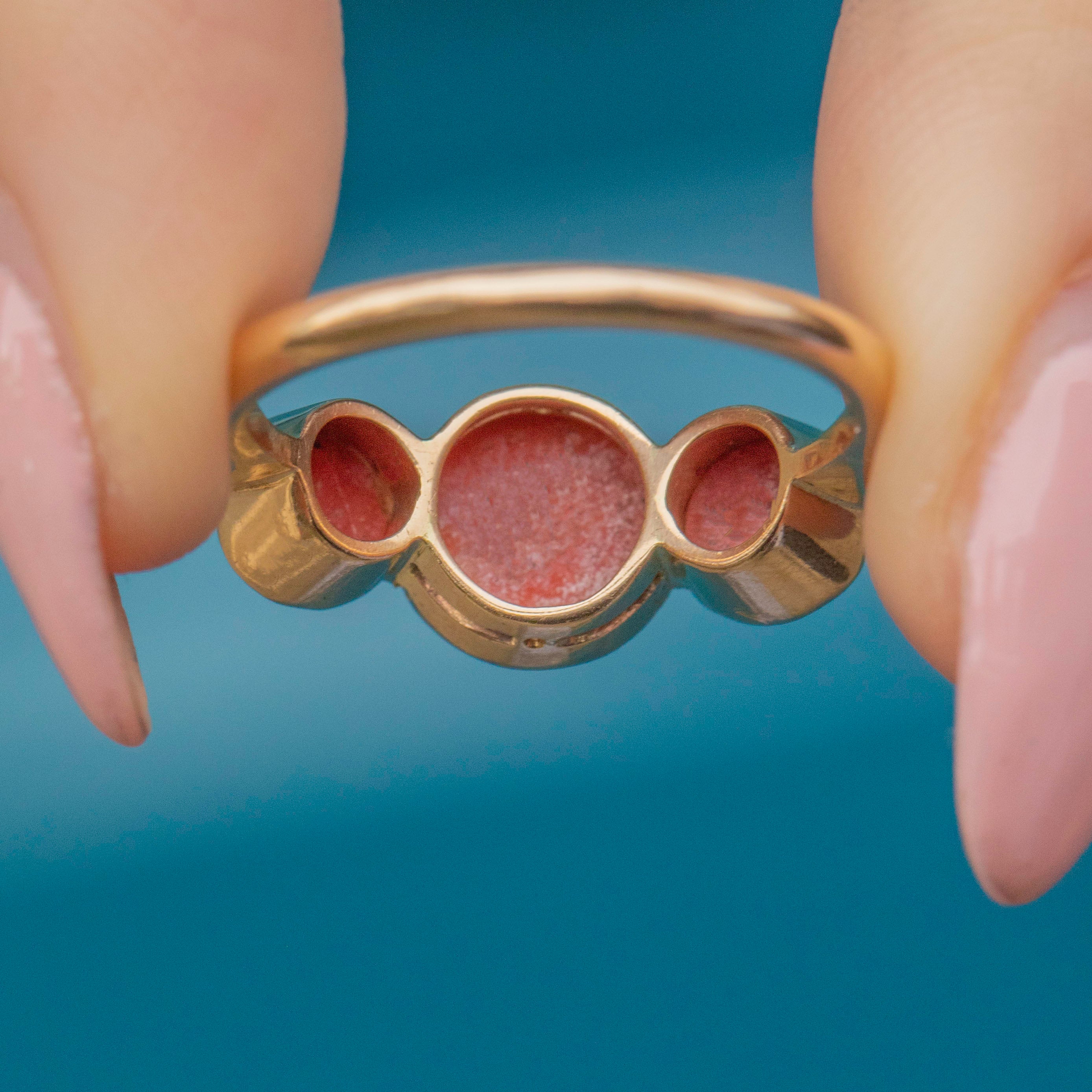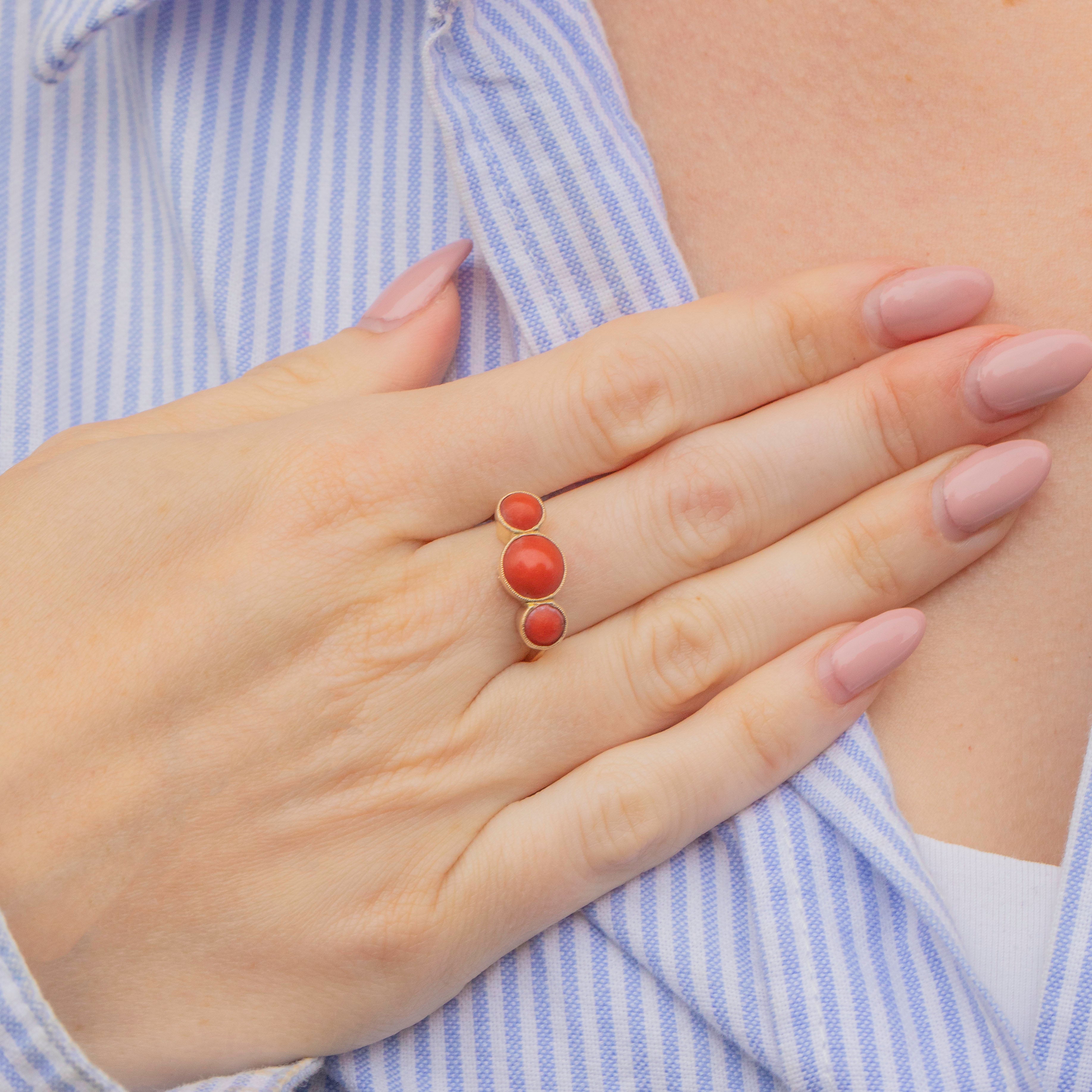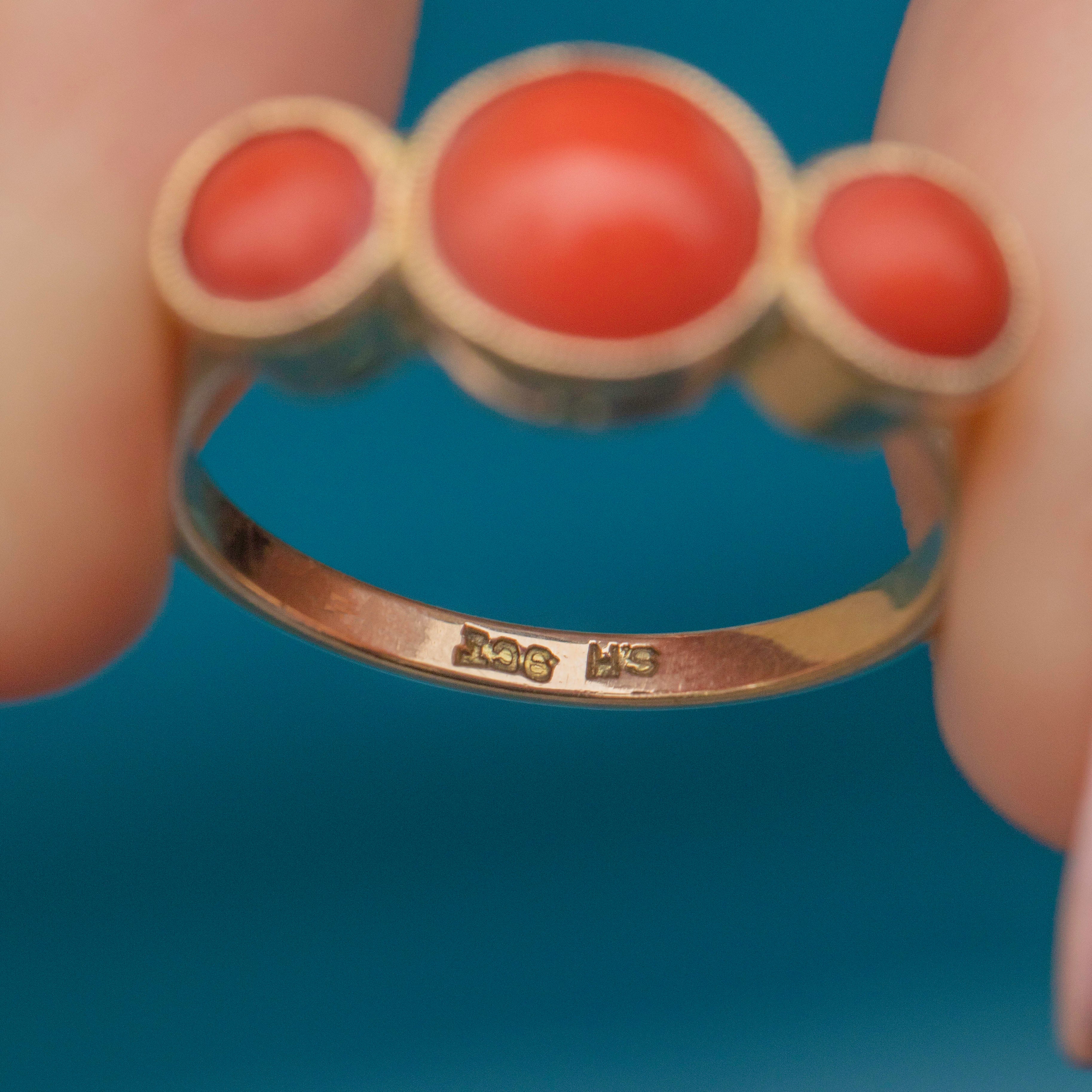 VERY GOOD. This antique 9ct Gold Coral trilogy ring is in very good condition. The Gold is buttery with wonderful reflective qualities, and the band has retained its form well over the years. The Coral stones are perfectly smooth, they have sunk slightly in their bezels, meaning they have slight movement, but they are still set securely. As Coral is a natural, organic stone, this ring should be worn with care, avoiding wet and humid conditions. With so much life left in her, don't hesitate to make this unique statement ring your newest obsession!