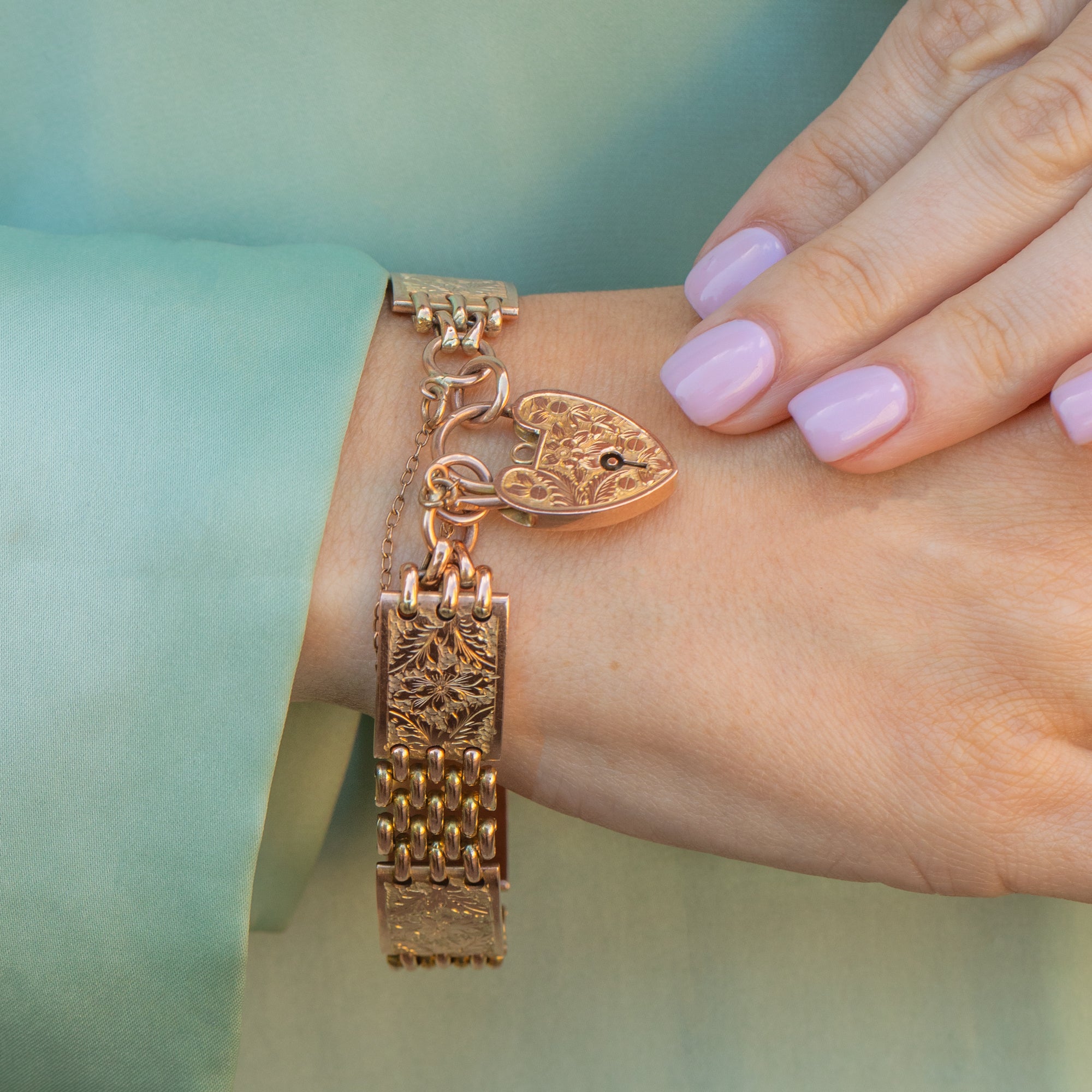 EXCELLENT. This antique 9ct Gold engraved gate bracelet is in excellent condition. The engraved panels are securely linked, with a lovely rosy hue. The intricate heart padlock is free from wear, its clasp opening and closing with ease. The piece also has an additional security chain, giving you peace of mind while wearing this spectacular Victorian gate bracelet!