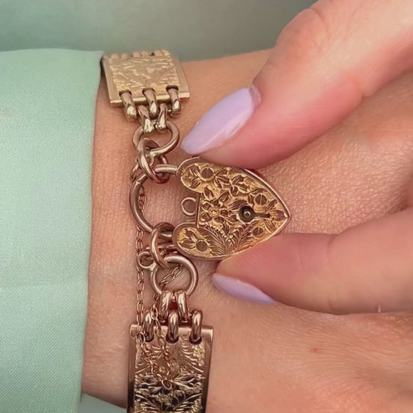Antique 9ct Gold Engraved Gate Bracelet, Heart Padlock