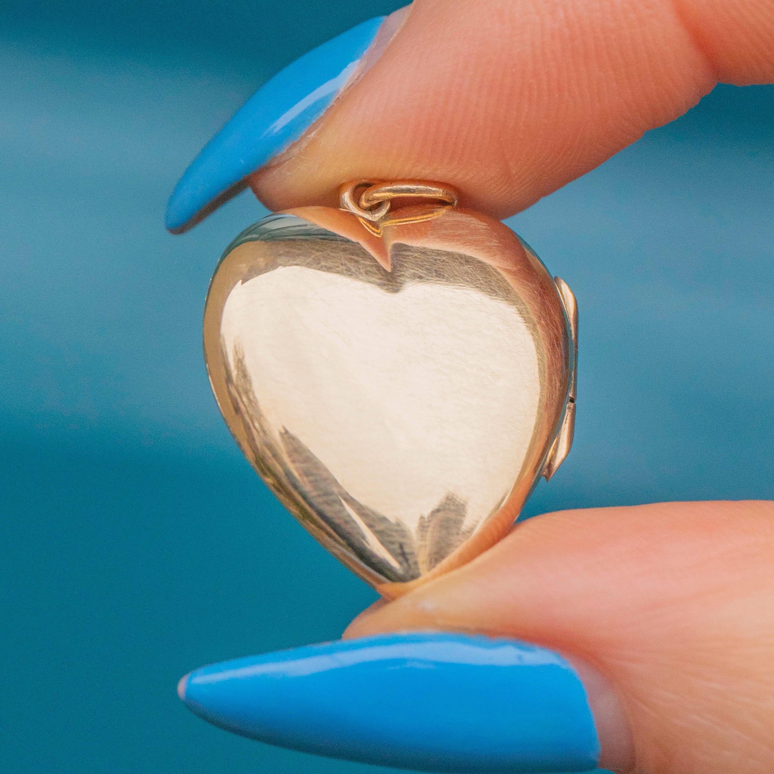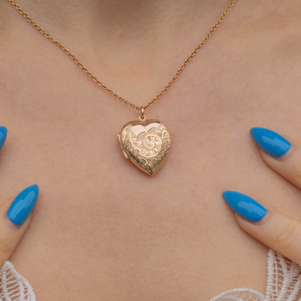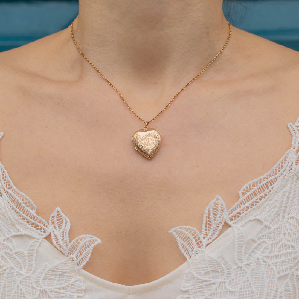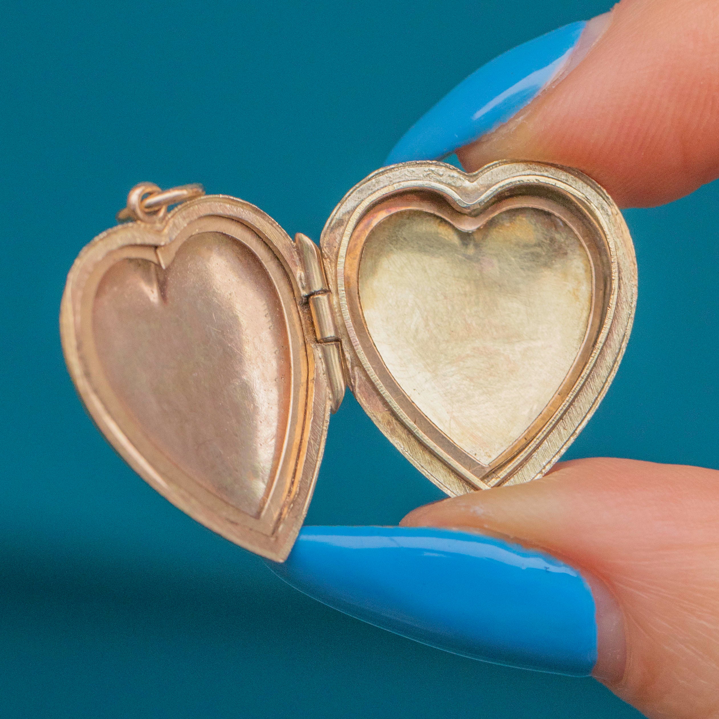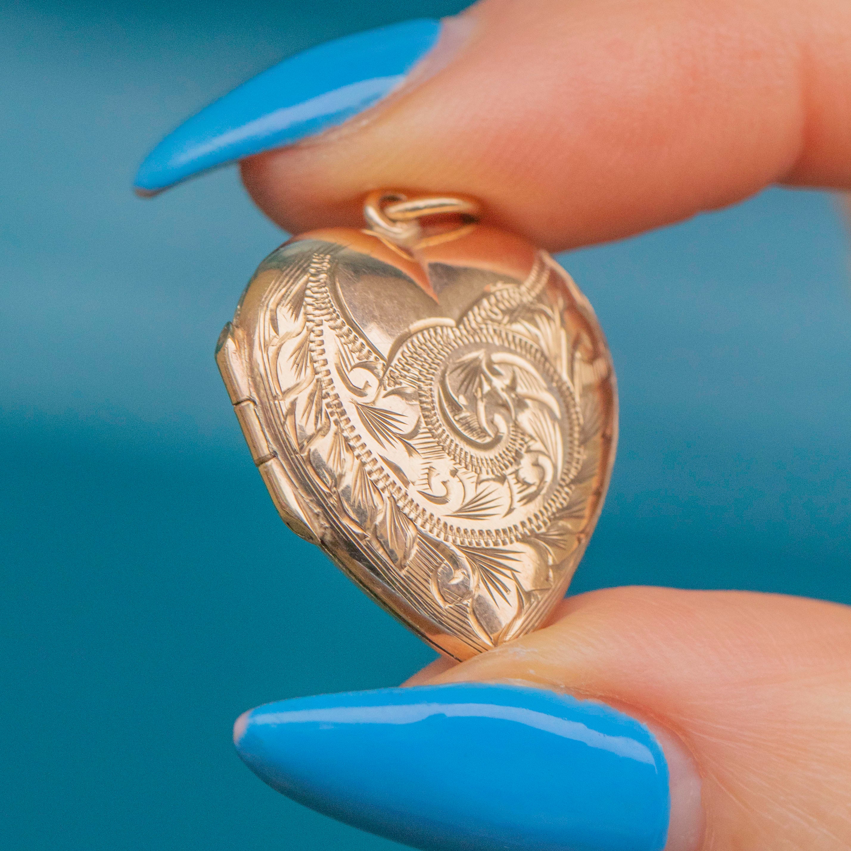 VERY GOOD-EXCELLENT. This 9ct Gold engraved heart locket is in superb condition. The engravings are crisp and the Gold is buttery with only very minor signs of wear on the back of the locket. With both frames still intact and the doors closing securely will a "click", you can be sure that your cherished photographs will be held safely inside.