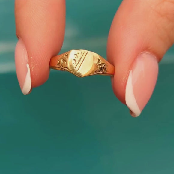 This dainty antique 9ct Gold engraved heart signet ring is just the sweetest piece! Finely crafted from 9ct Gold, this petite signet ring has a heart-shaped centre adorned with delicate embossings and decorative shoulders.