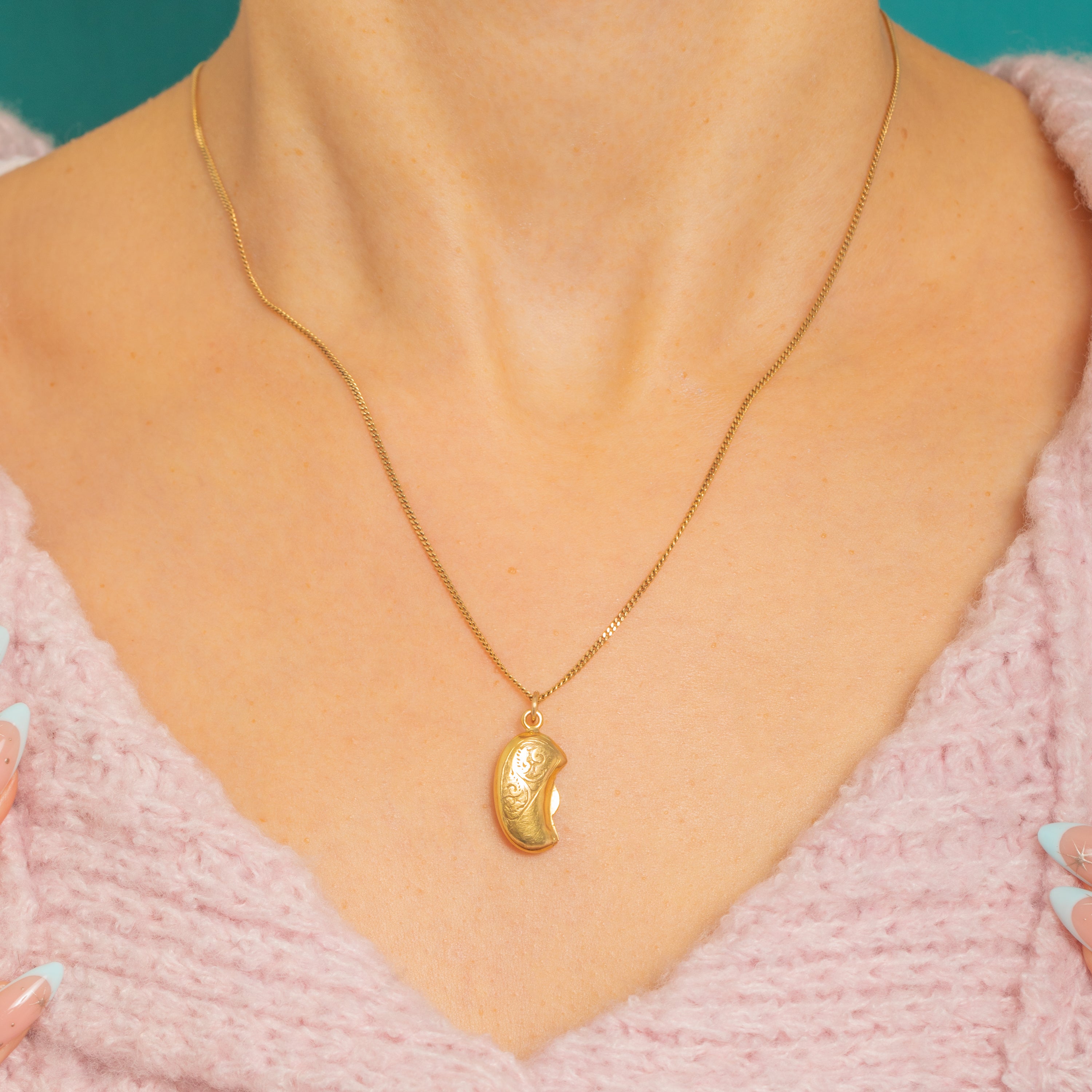 A charming Edwardian lucky bean charm in 9ct Gold, adorned to the front with crisp bright‑cut foliate scrolls. Its buttery yellow hue and lovely high shine bring the engraving to life, creating a delicate, romantic accent with timeless appeal.