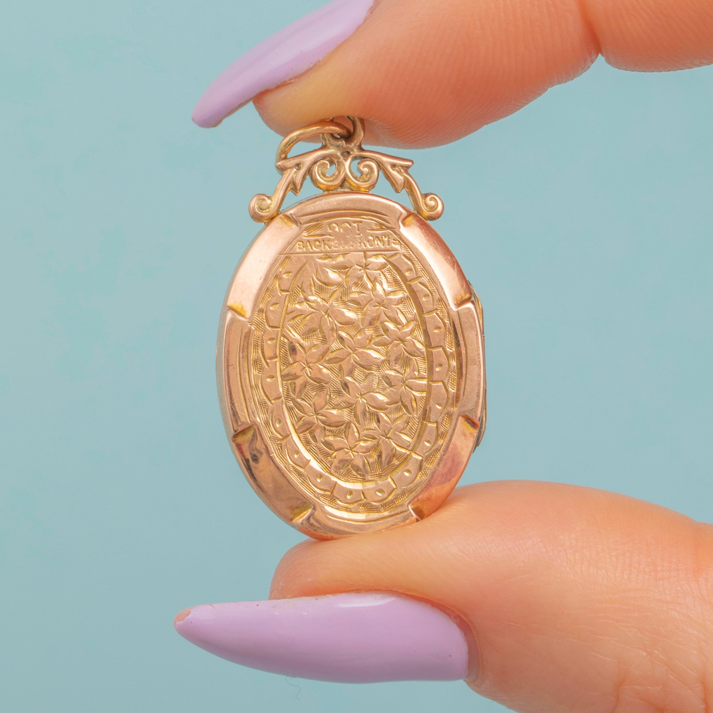 VERY GOOD-EXCELLENT. This antique 9ct Gold engraved oval locket is in wonderful condition. The Gold is buttery and the body of the locket is free from dings, with all the engraved details remaining defined. One of the frames is missing, but the door will keep a photograph securely in place if cut to size. The locket closes with a "click" allowing you to use and wear it confidently!