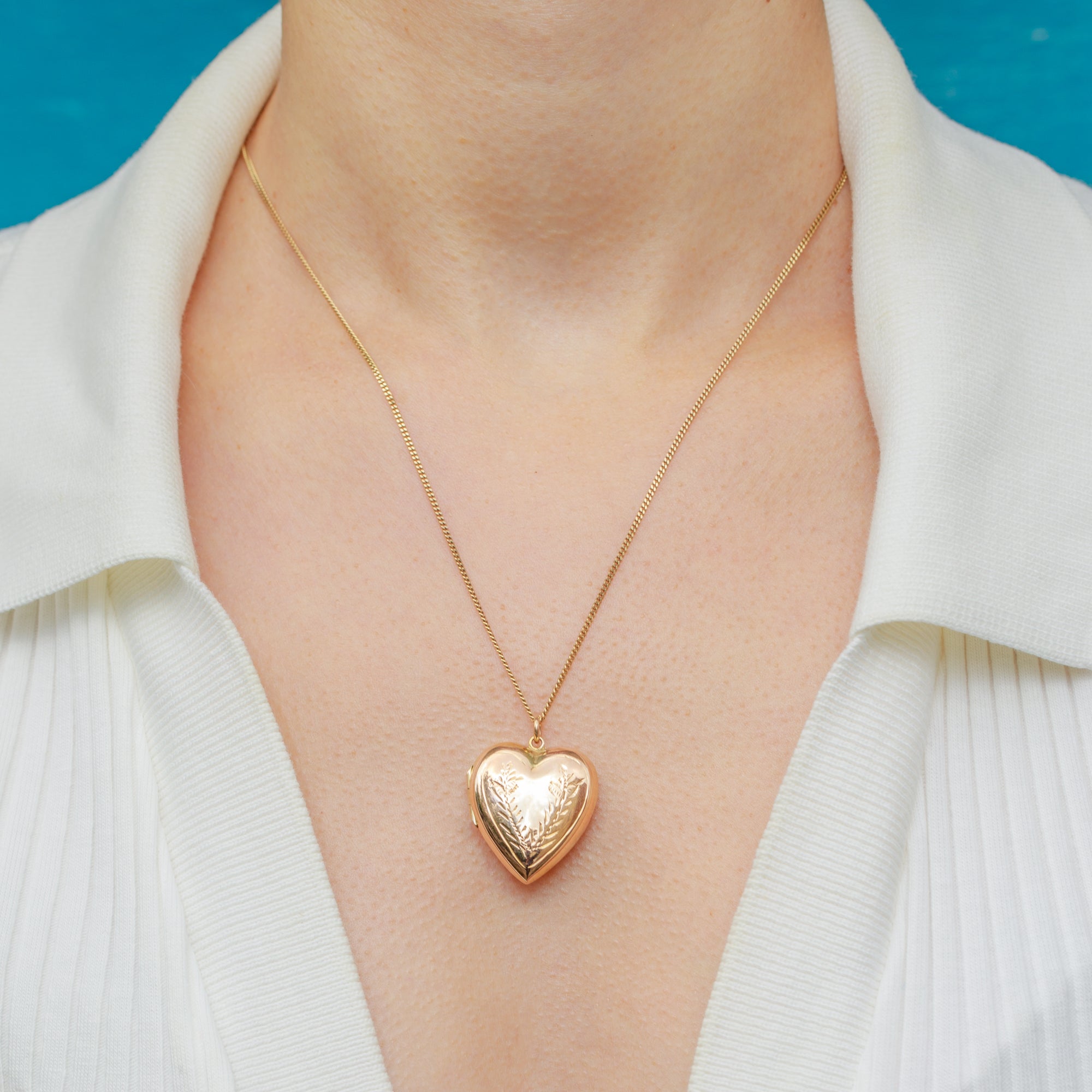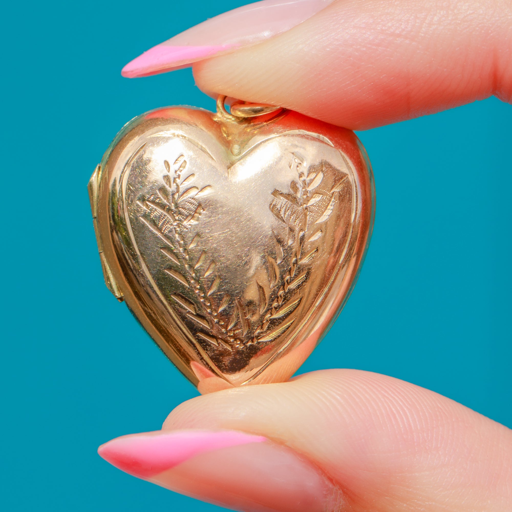 This Edwardian 9ct Gold engraved heart locket exudes romantic charm! Her silky 9ct Gold has been formed into a smooth heart formation, displaying a finely engraved wreath in her centre.