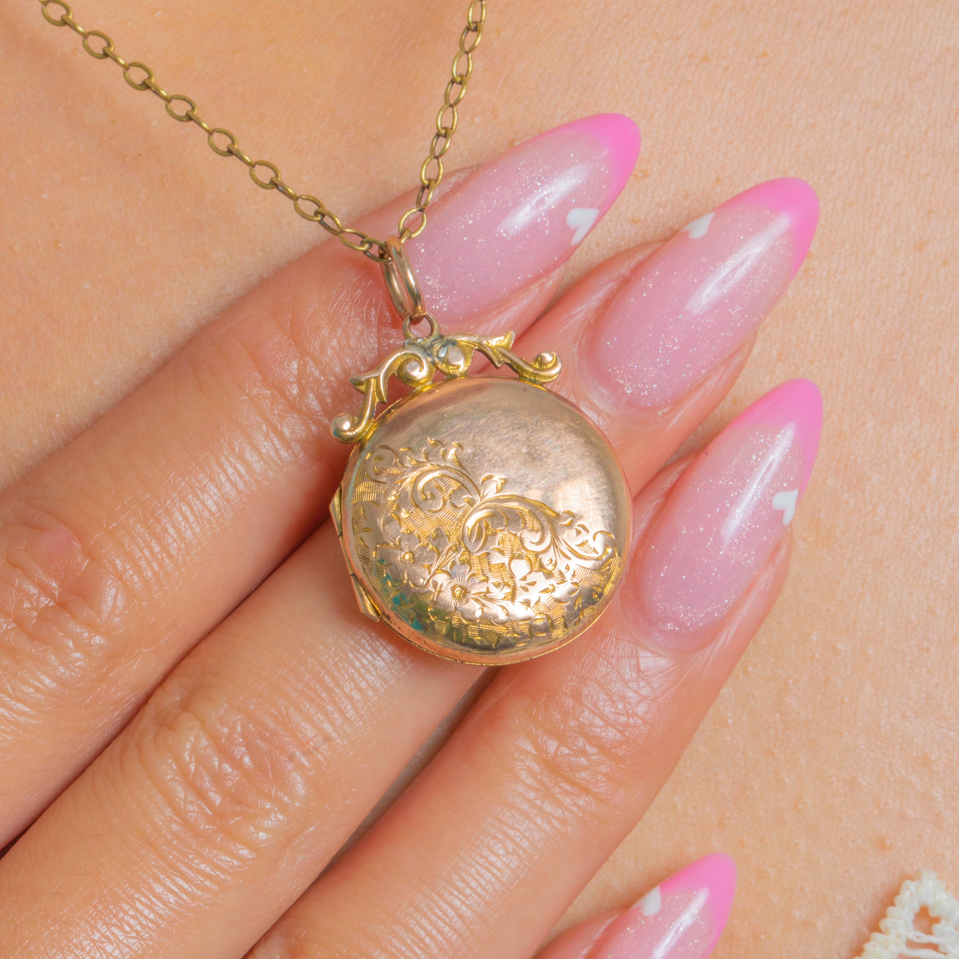 EXCELLENT: The Gold retains a lovely warm hue with crisp floral engraving and a gentle antique patina. The locket closes securely and the interior frames remain intact and in good order.