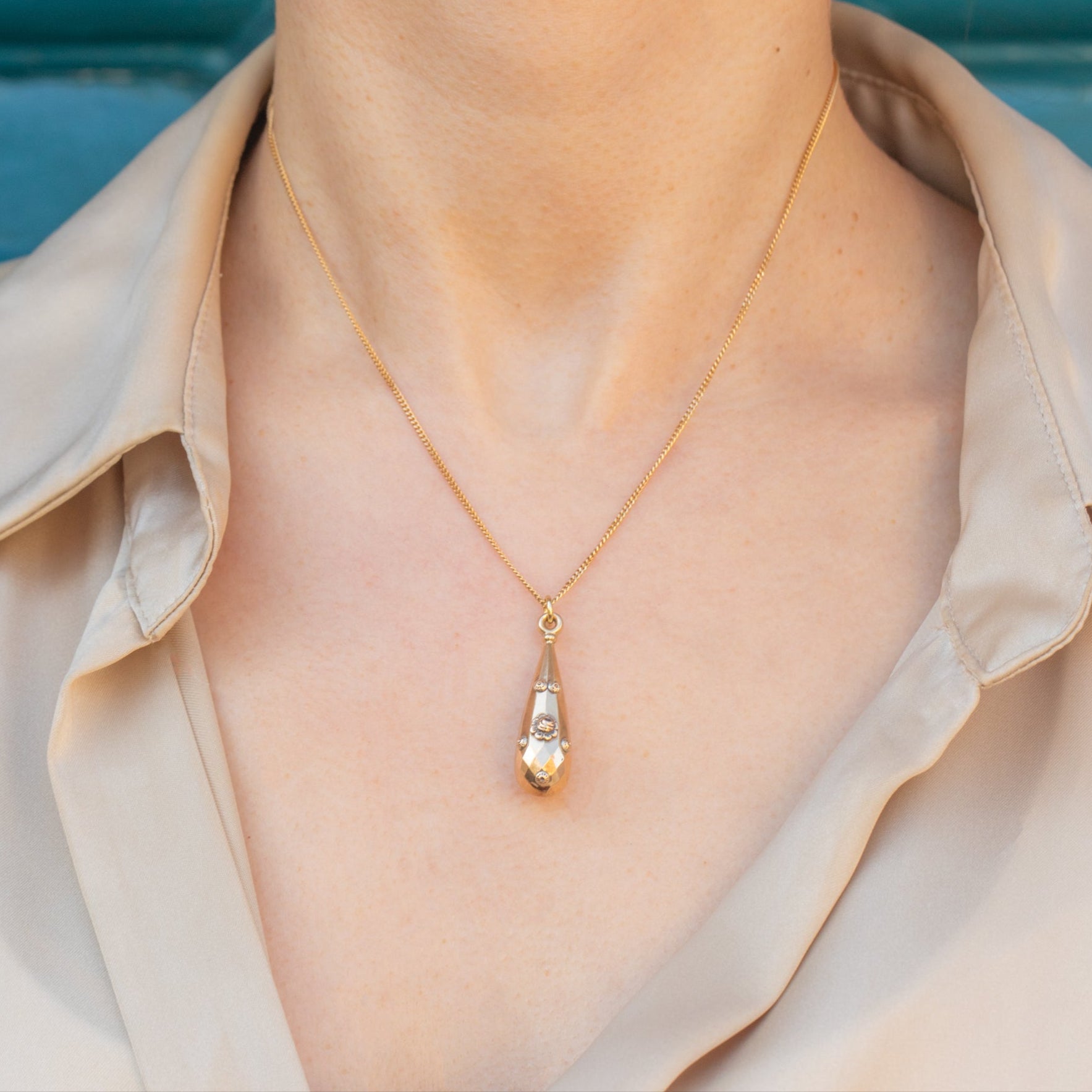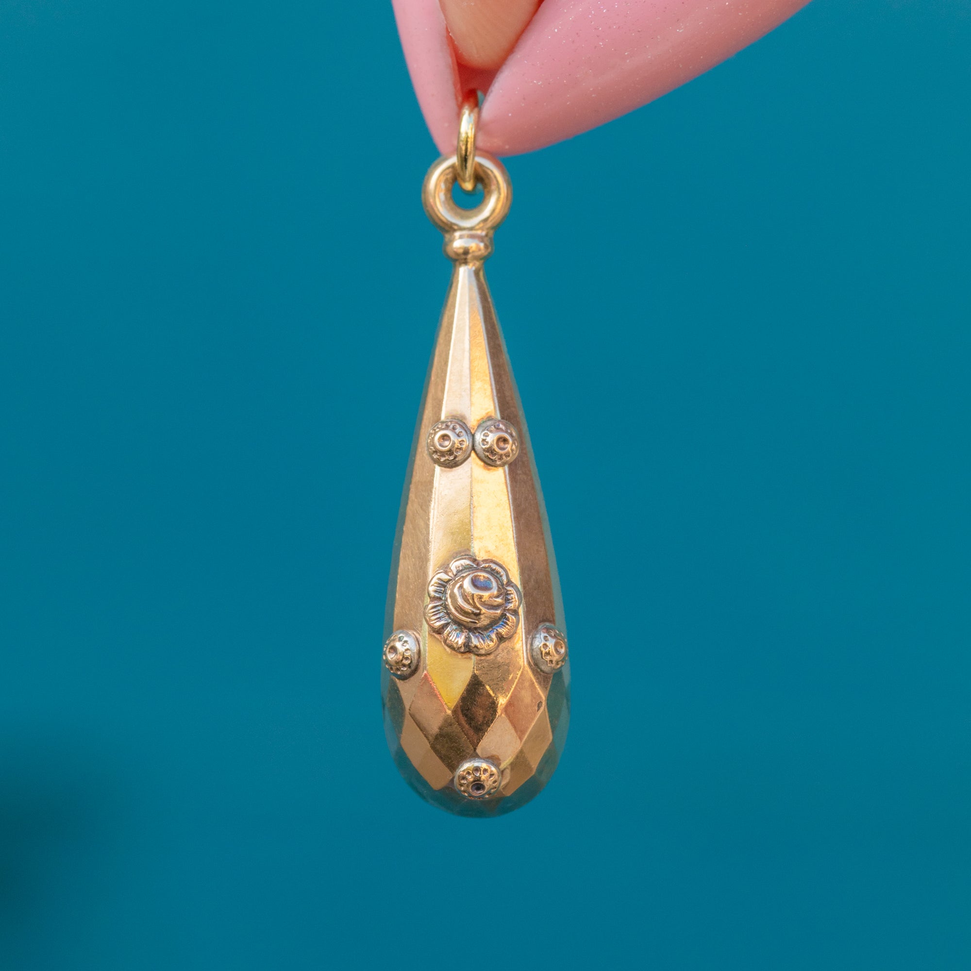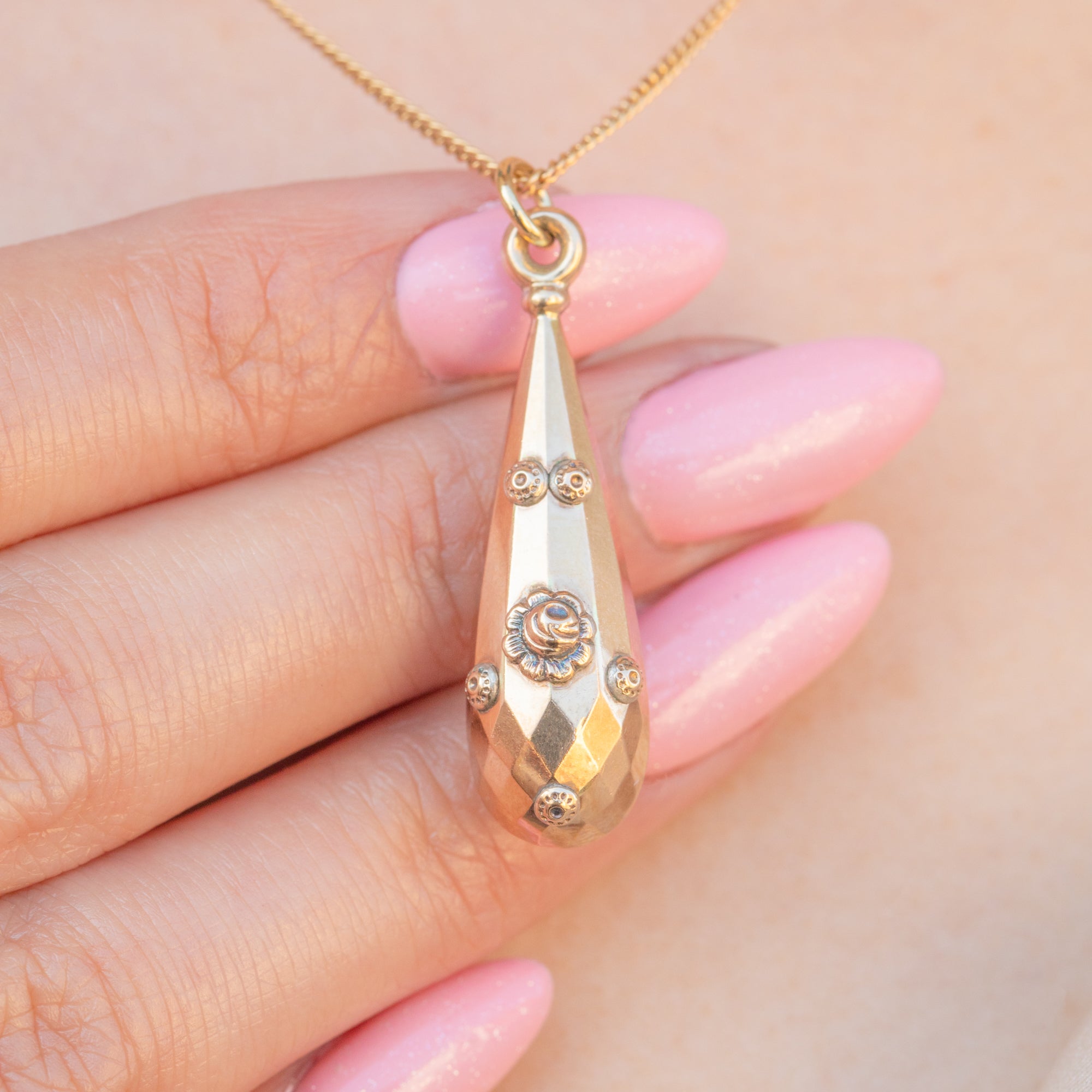 This antique 9ct Gold floral torpedo drop pendant is a stunning piece! Featuring a beautifully faceted torpedo form adorned with delicate floral details, she will bring sophistication to any look. Designed to sway gently when worn on a gold chain, she sits beautifully against the skin, like a golden drop of honey.