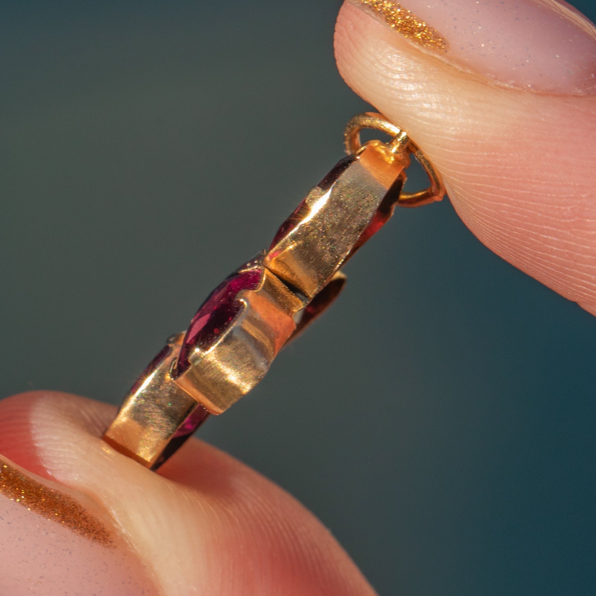 A charming Victorian Garnet pendant glowing with deep, velvety wine-red tones. Four oval Garnets form a sweet, balanced cluster, each held securely in warm 9ct Gold claw settings that give this piece its classic antique character.