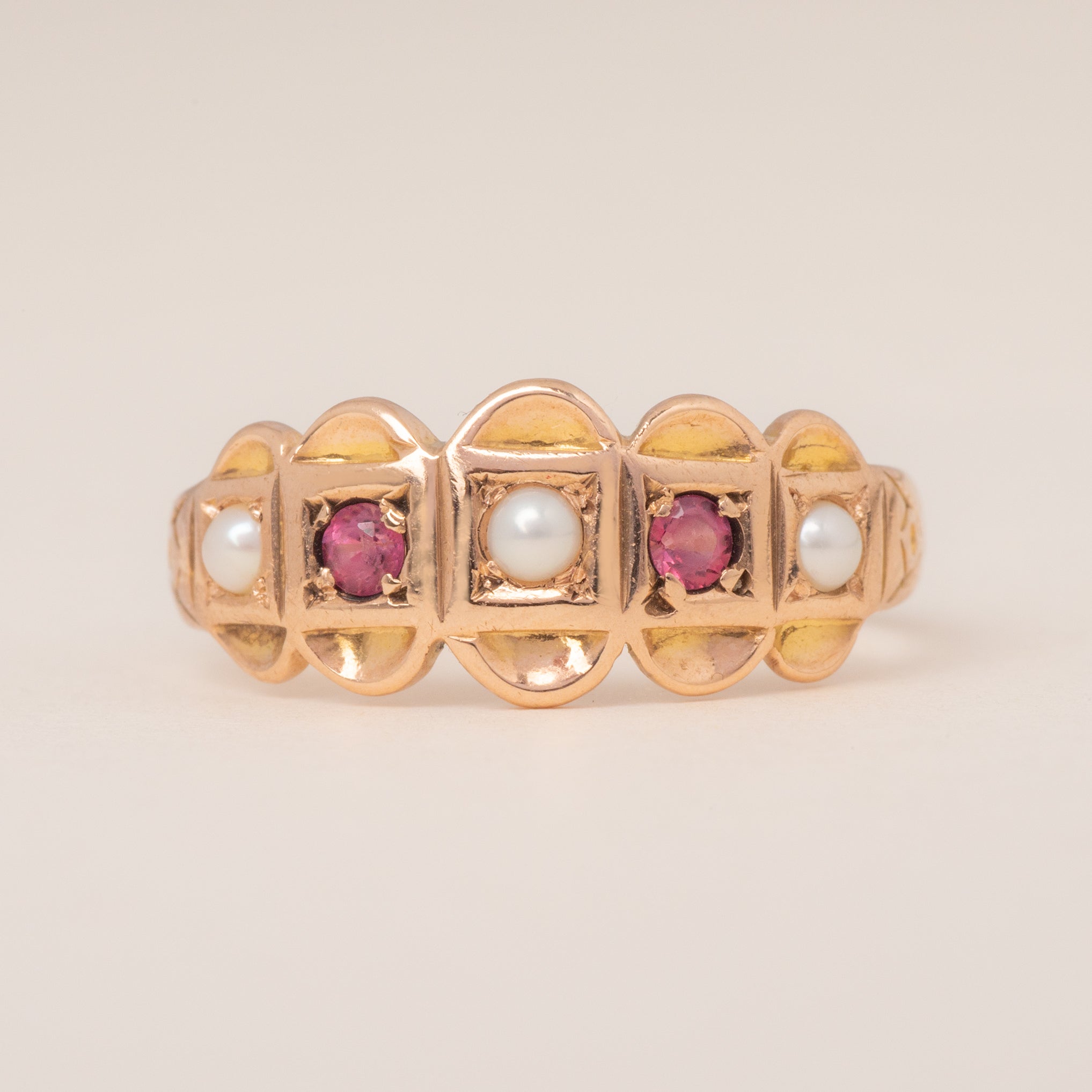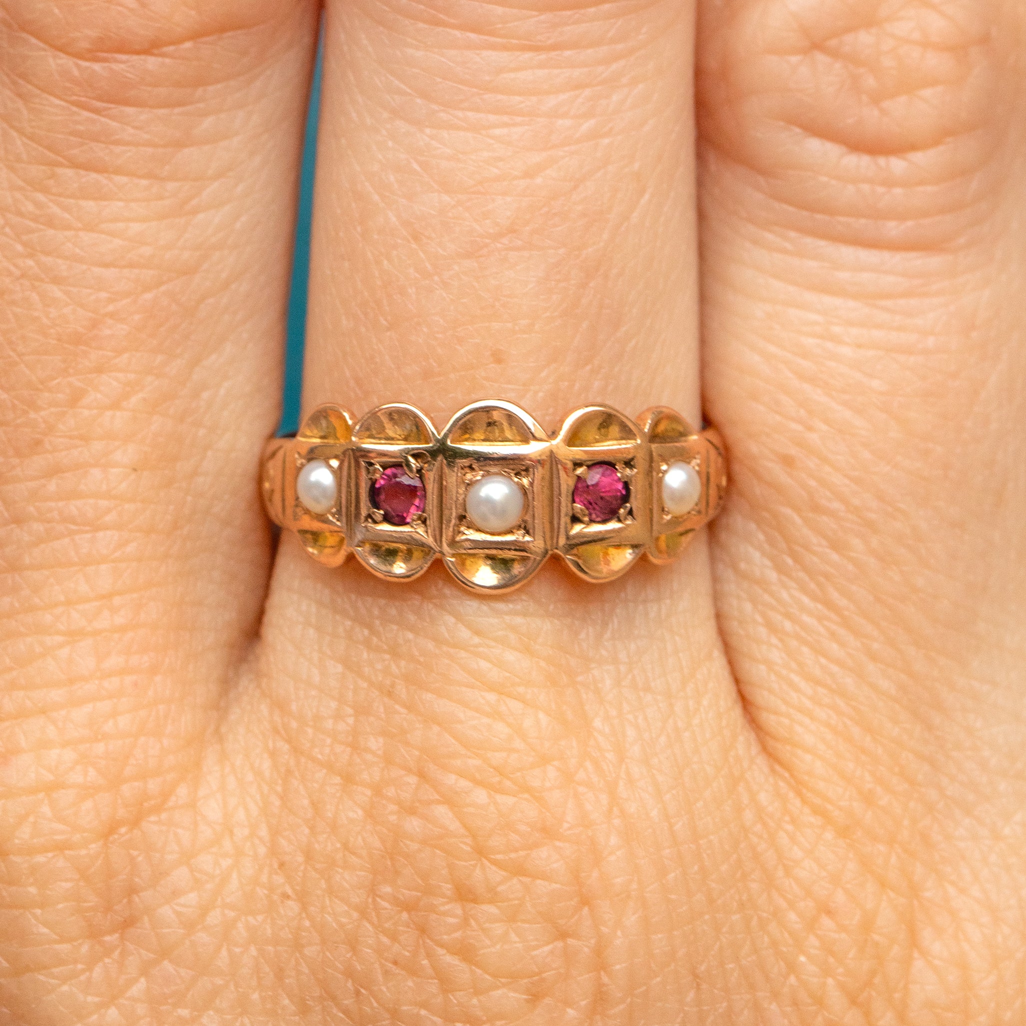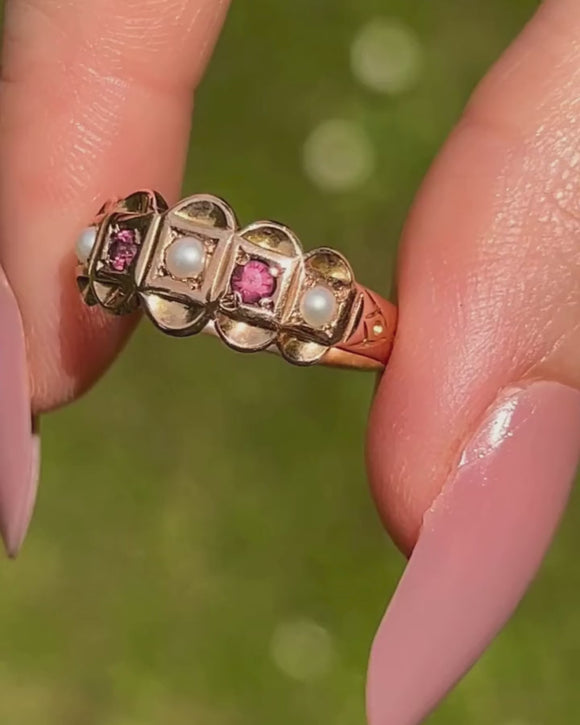 Antique 9ct Gold Garnet Pearl Ring, Scallop Edge