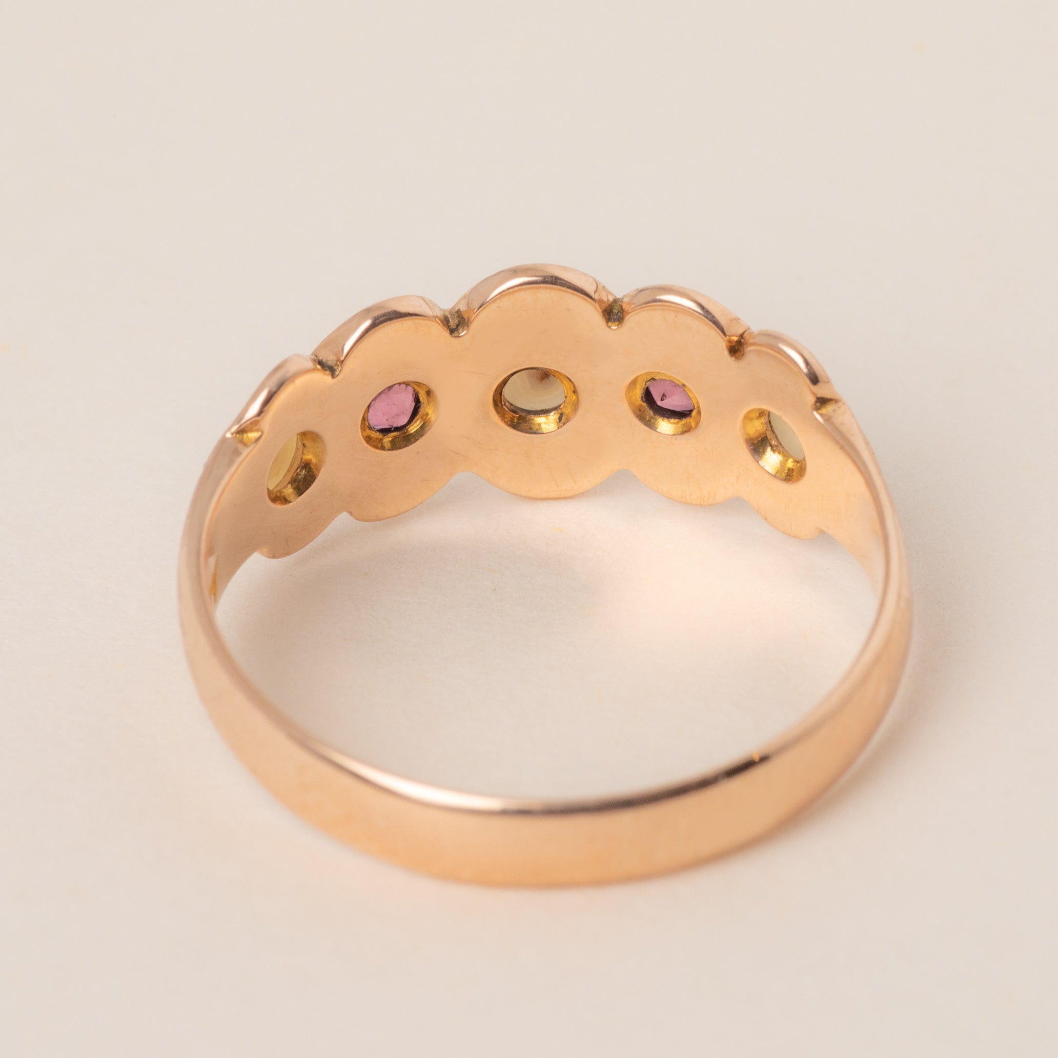 This antique 9ct Gold Garnet Pearl ring is such a delightful find! The ring face displays an alternating pattern of Garnets and Pearls, framed by a scalloped edge border making her a unique addition to your collection.