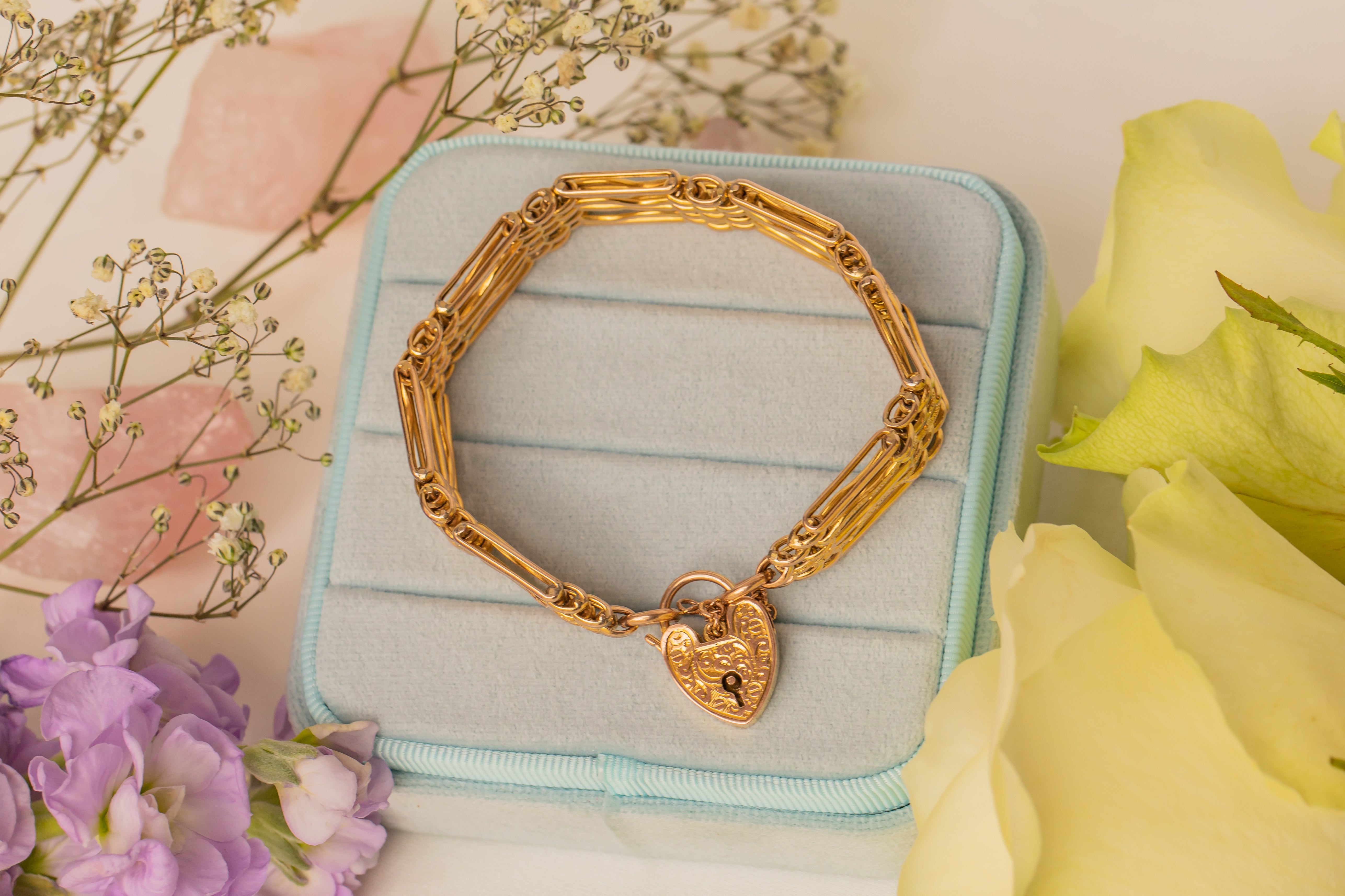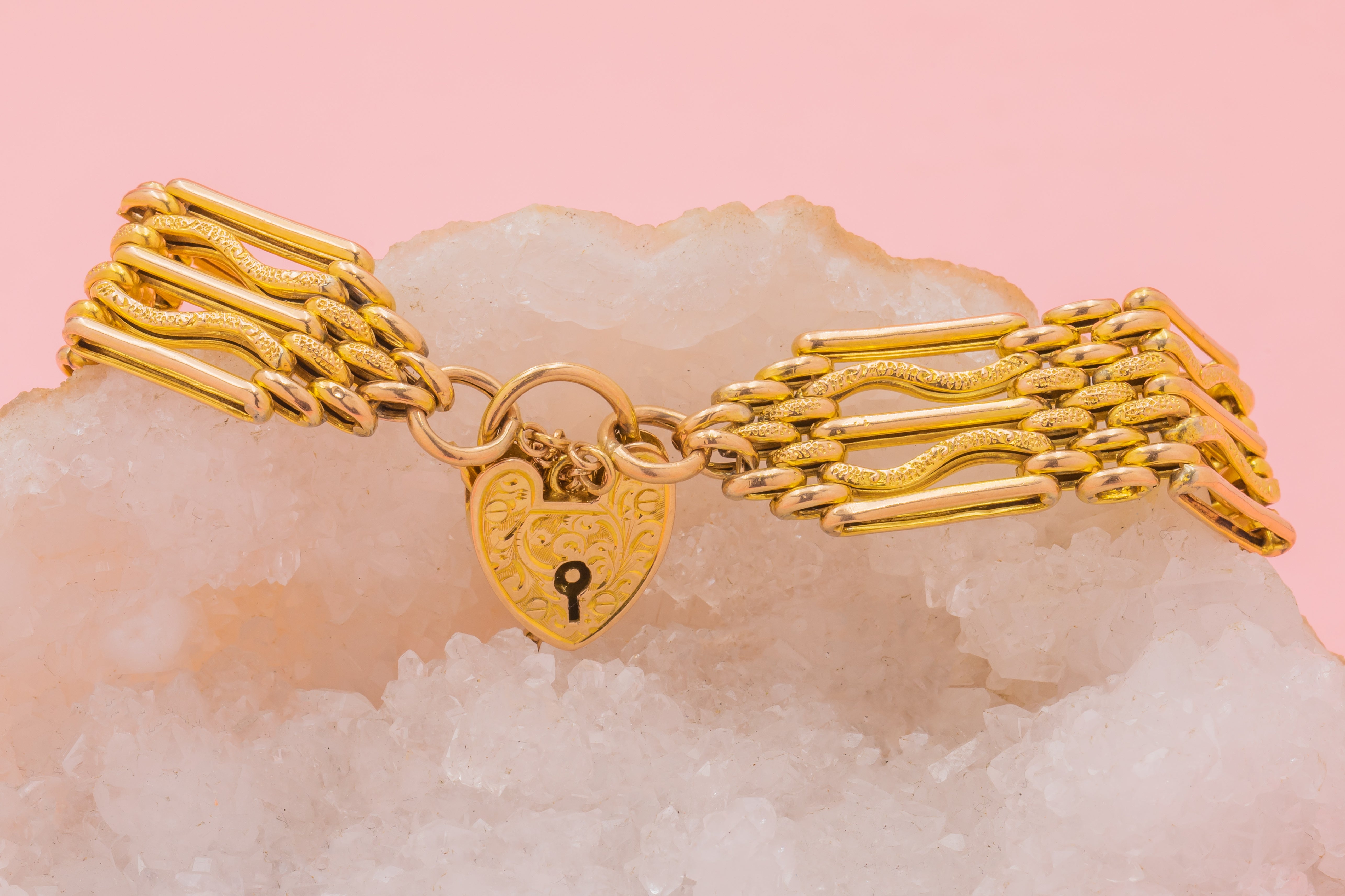 This Victorian bracelet's links alternate between smooth straight links and textured wavy links, all tied together by a perfectly engraved 9ct Gold heart Padlock. Not only is she heavenly to look at and wear, but she is also steeped in romantic sentiment, once used as a way to display faithfulness to a loved one who was away for extended periods. We can't think of a better way to gesture your love to someone than with this Victorian gate bracelet!