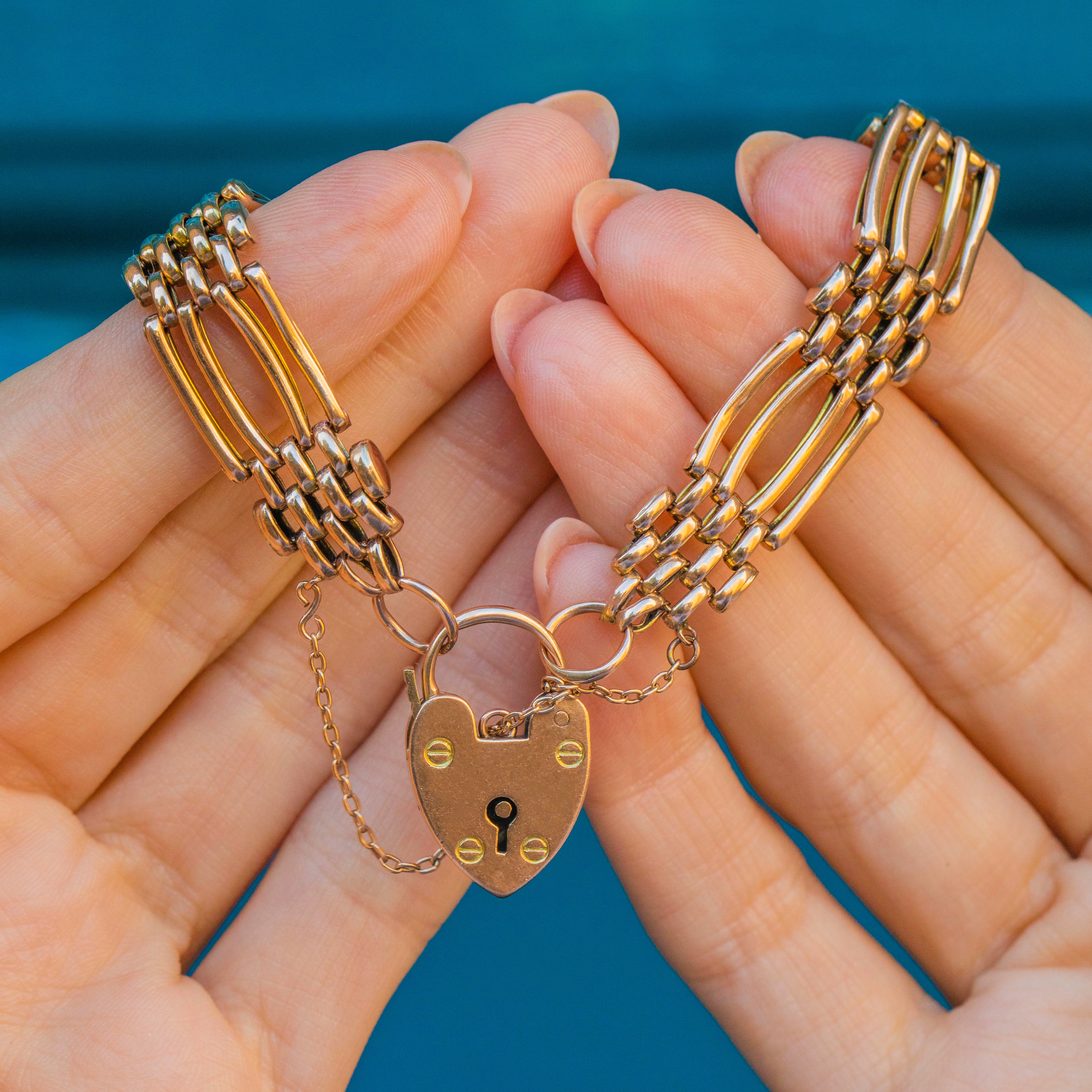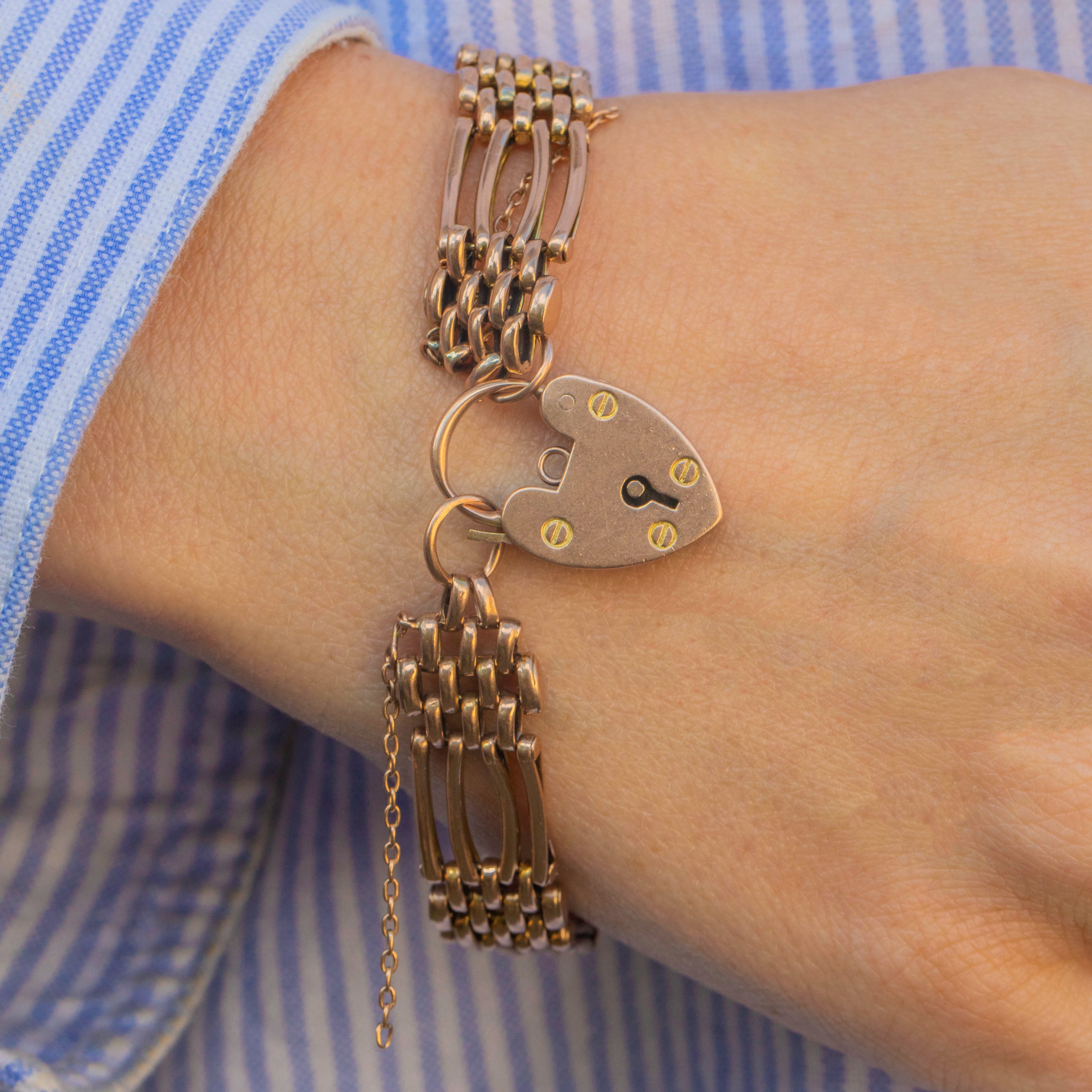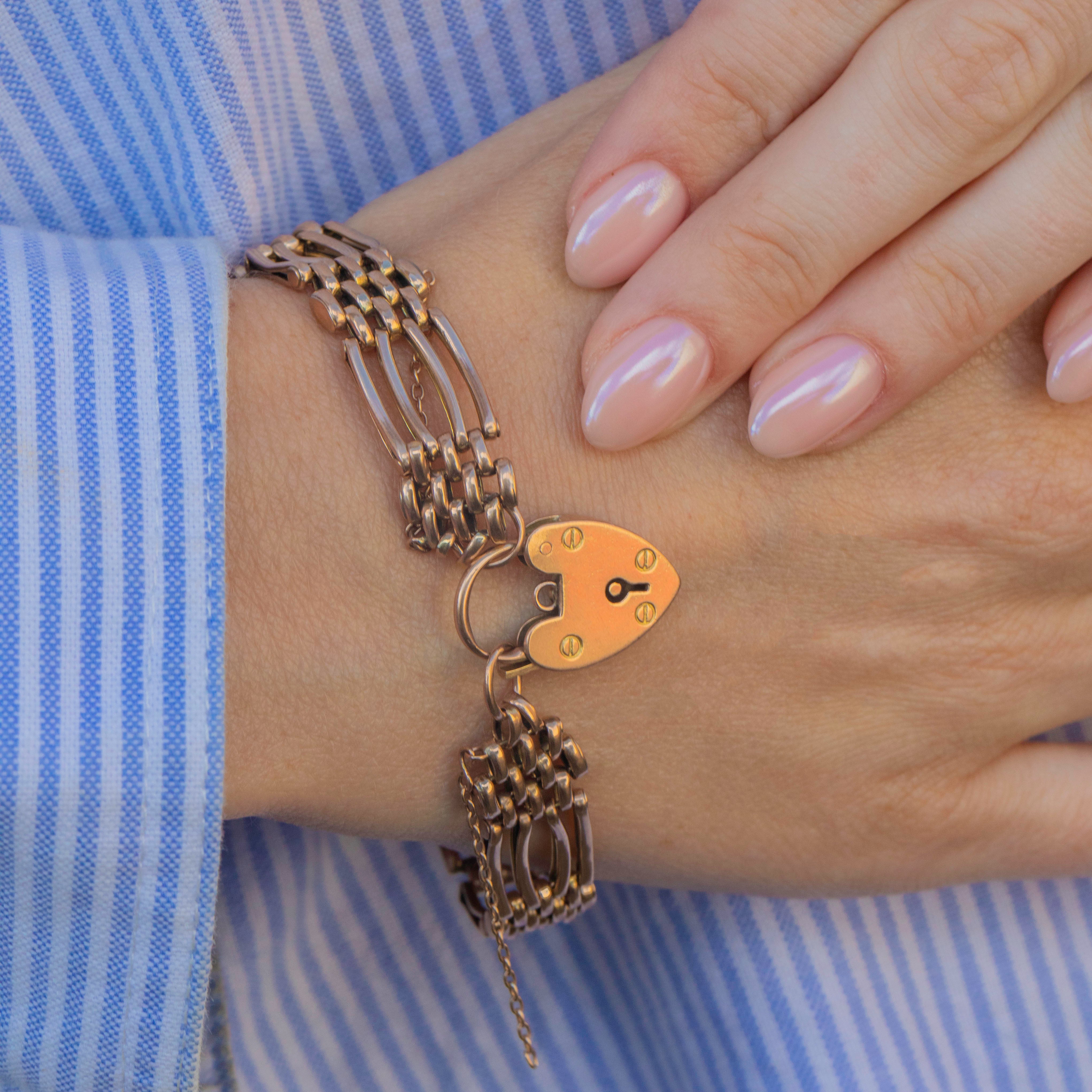 A piece full of romantic sentiment... Gold gate bracelet jewellery like this rose in popularity during the mid-19th century in England and overseas- worn by women as a sign of fidelity and faithfulness to a husband or lover when they went away, with the partner taking the key to the heart with them to be unlocked upon return.