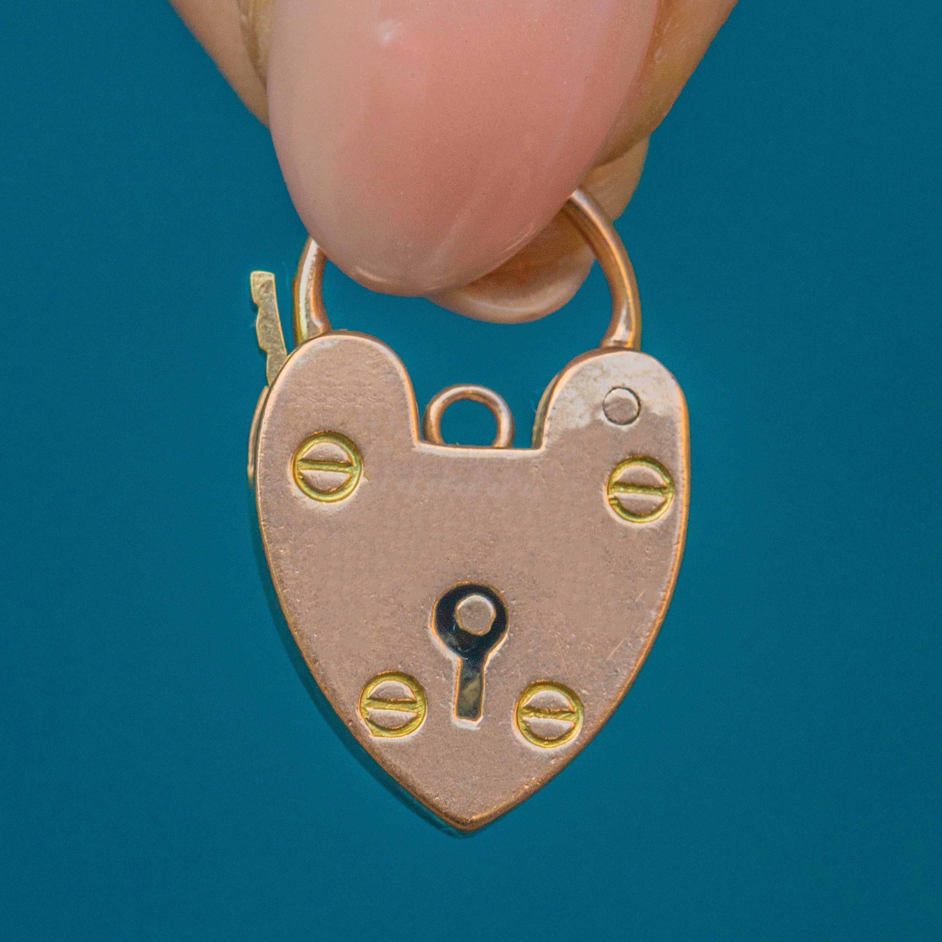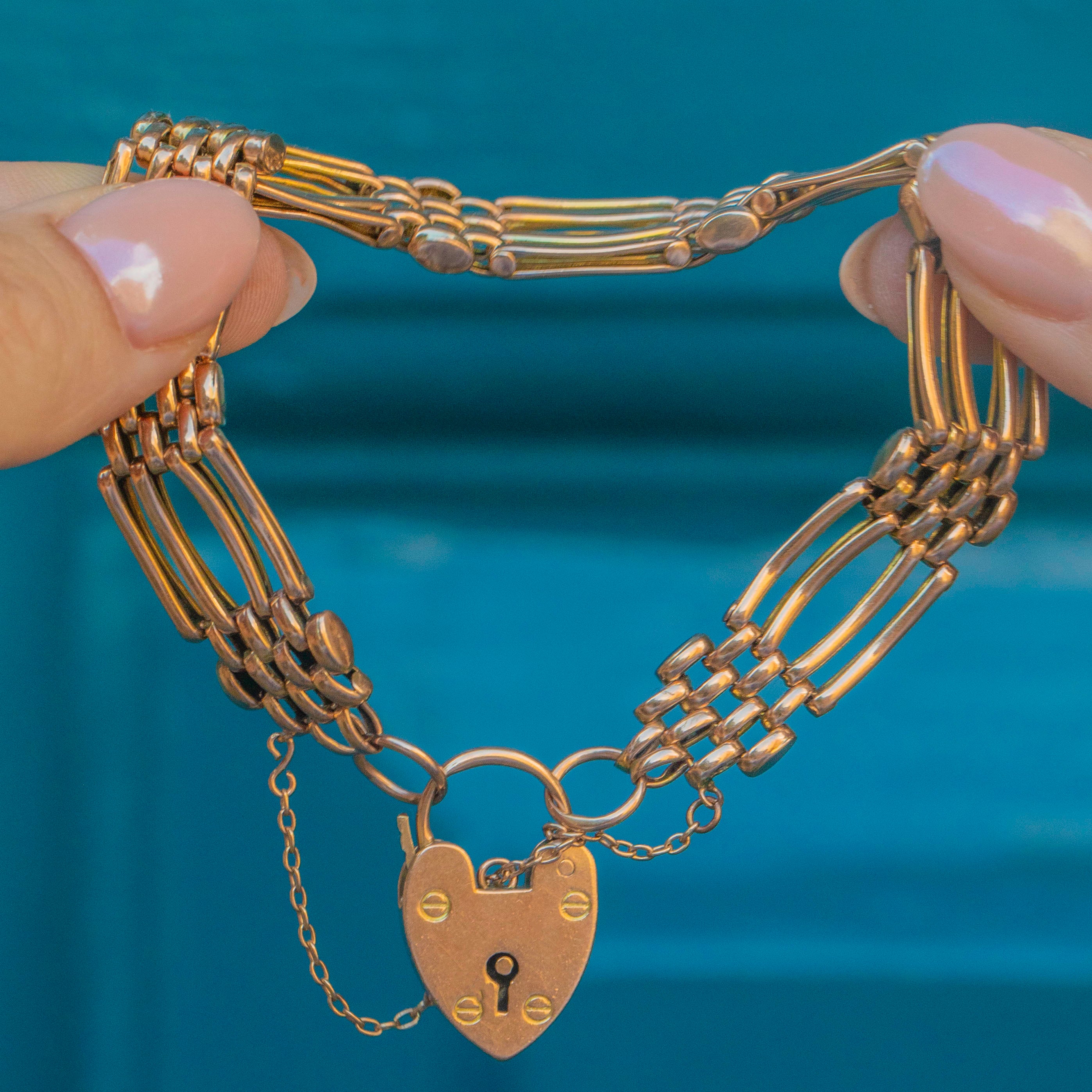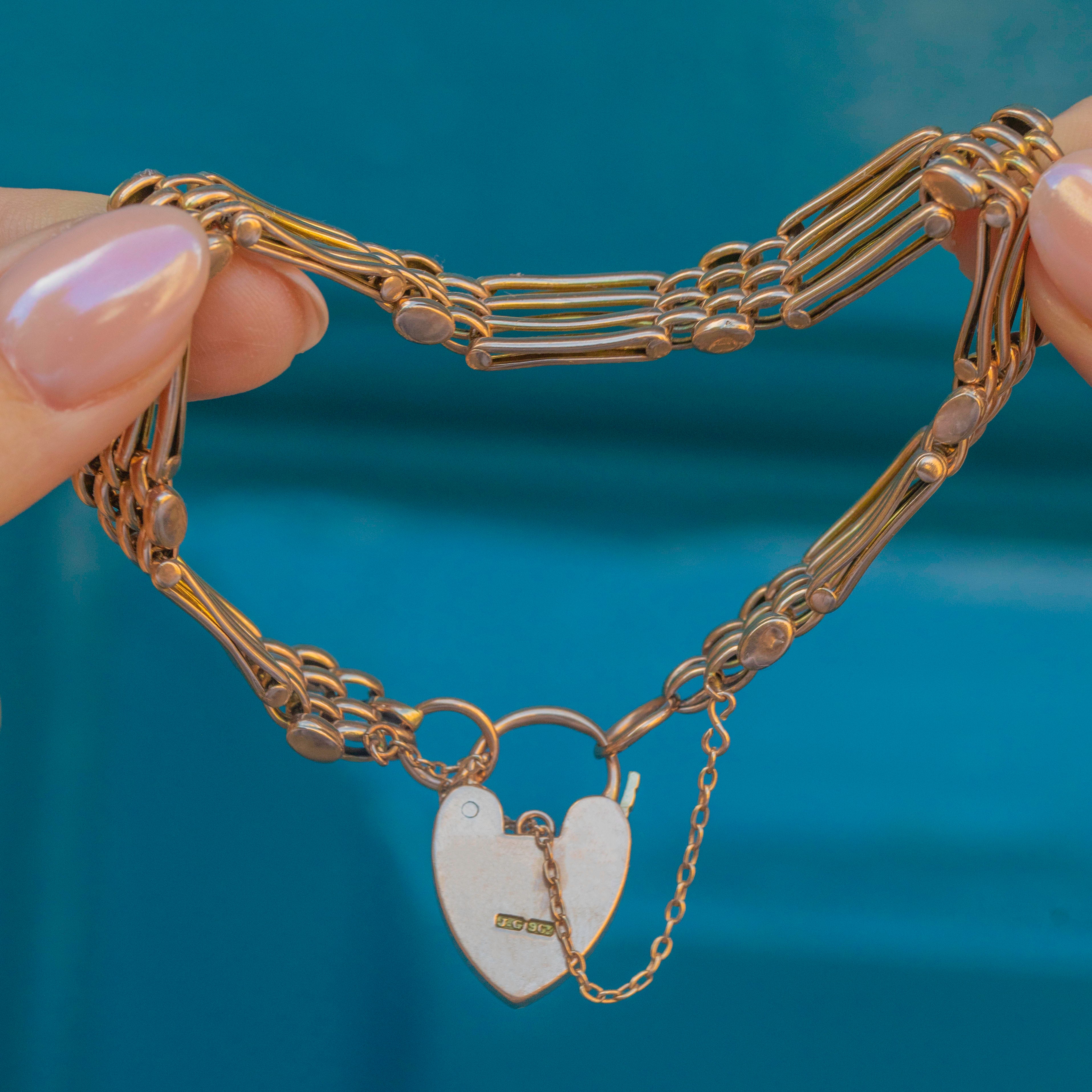 This splendid antique 9ct Gold gate bracelet has a beautiful design and comes, complete with the original antique heart padlock! What a beauty!