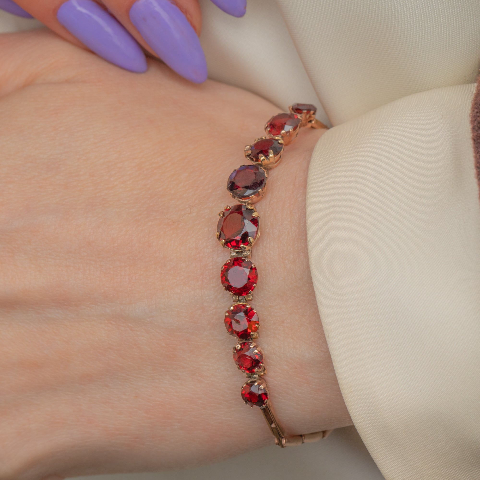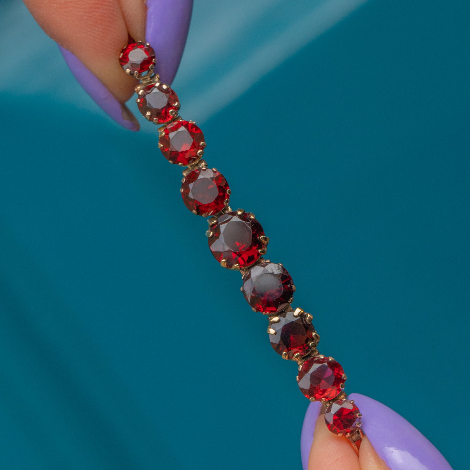 Crafted from rosy-hued 9ct Gold, this Edwardian bracelet flaunts nine rich graduating sanguine Garnets, boasting 8.20 carats combined. Each round Garnet is faceted beautifully, catching the light to reveal vibrant crimson hues.