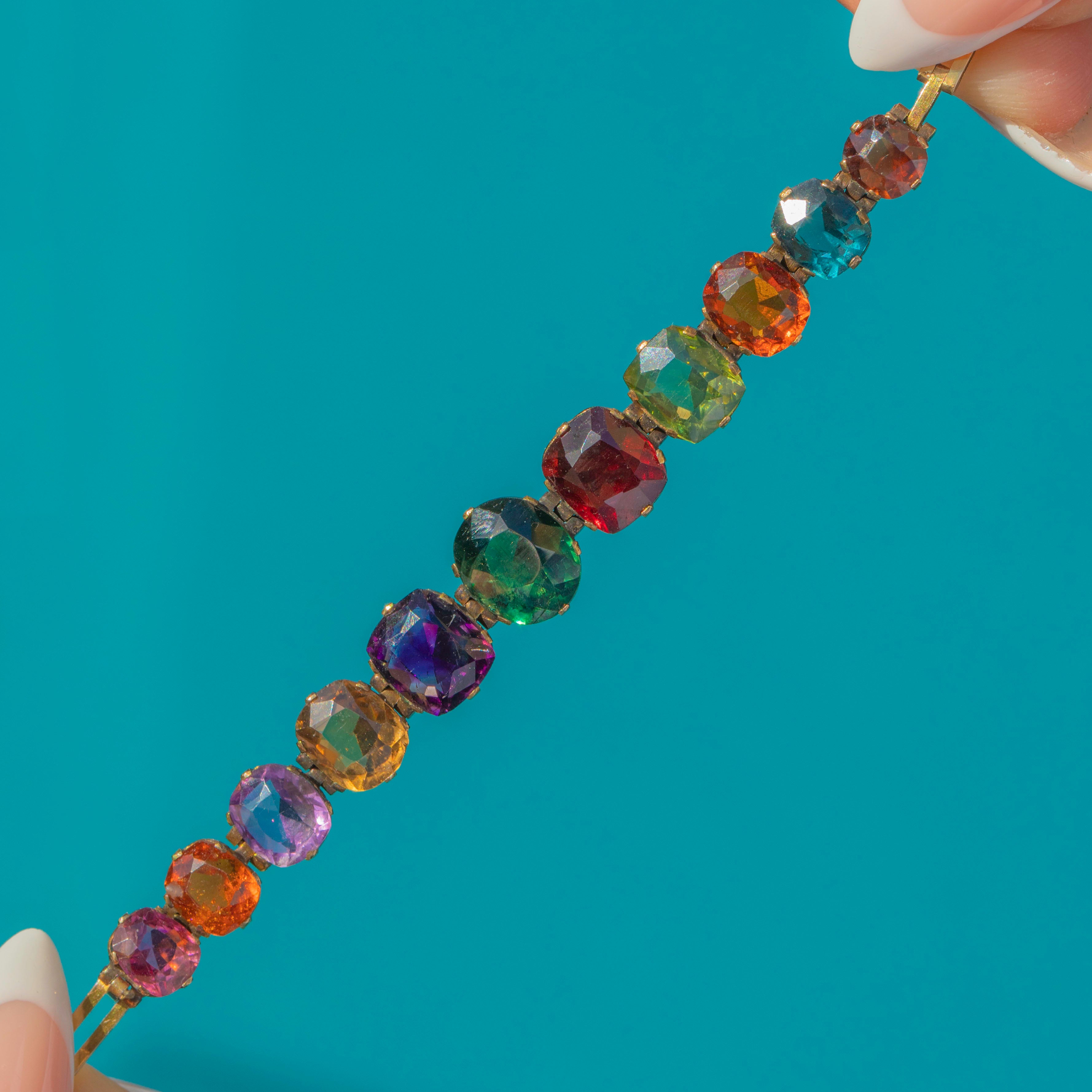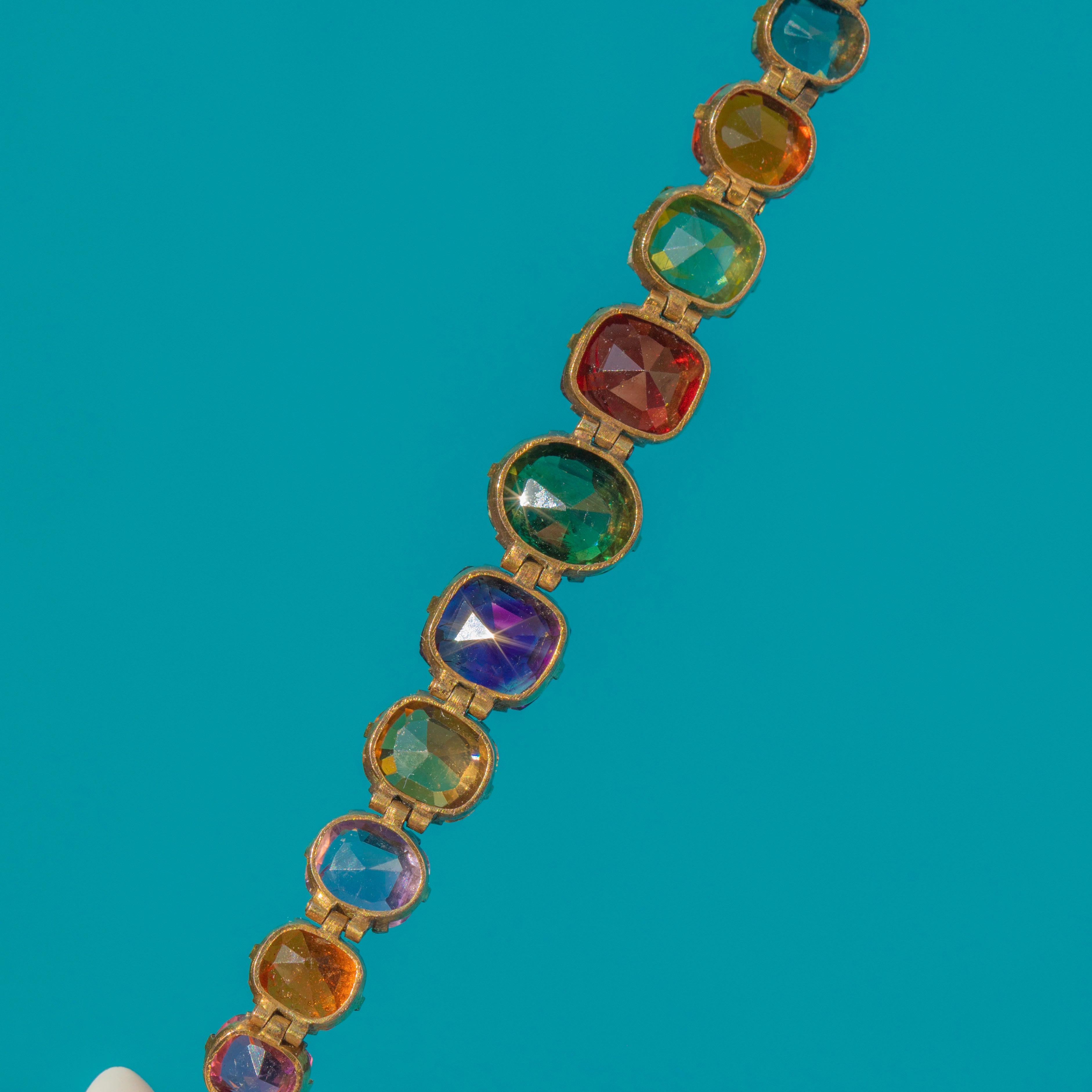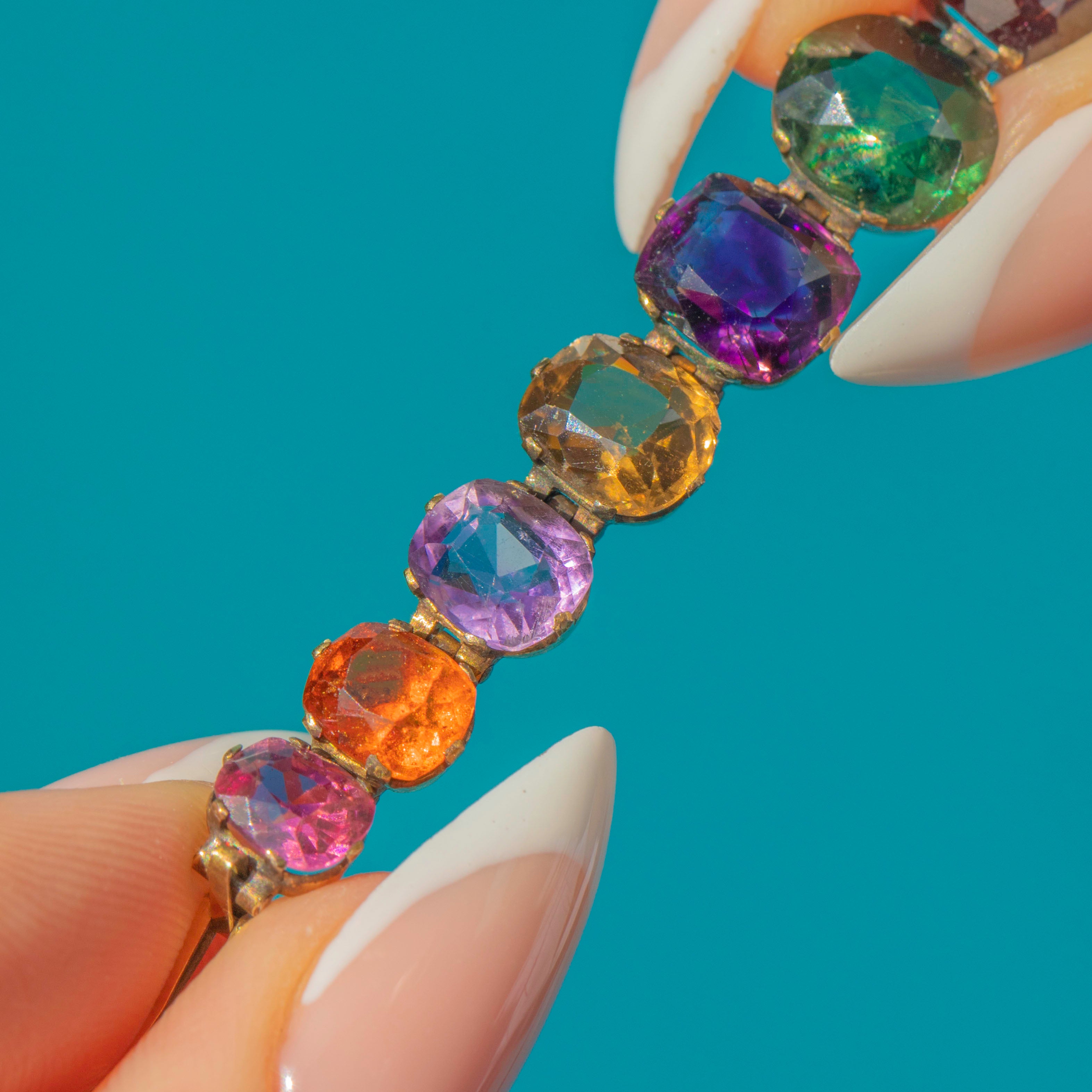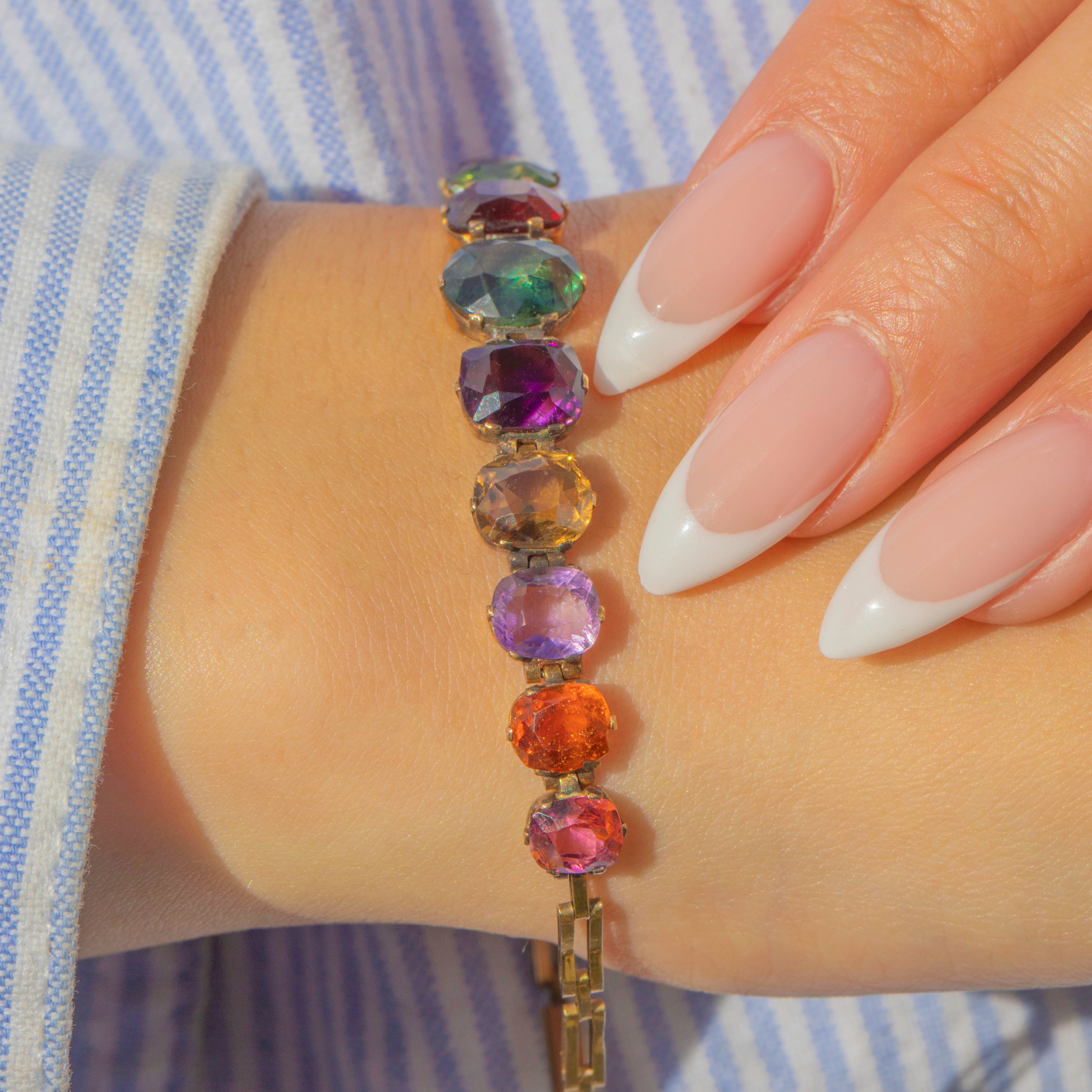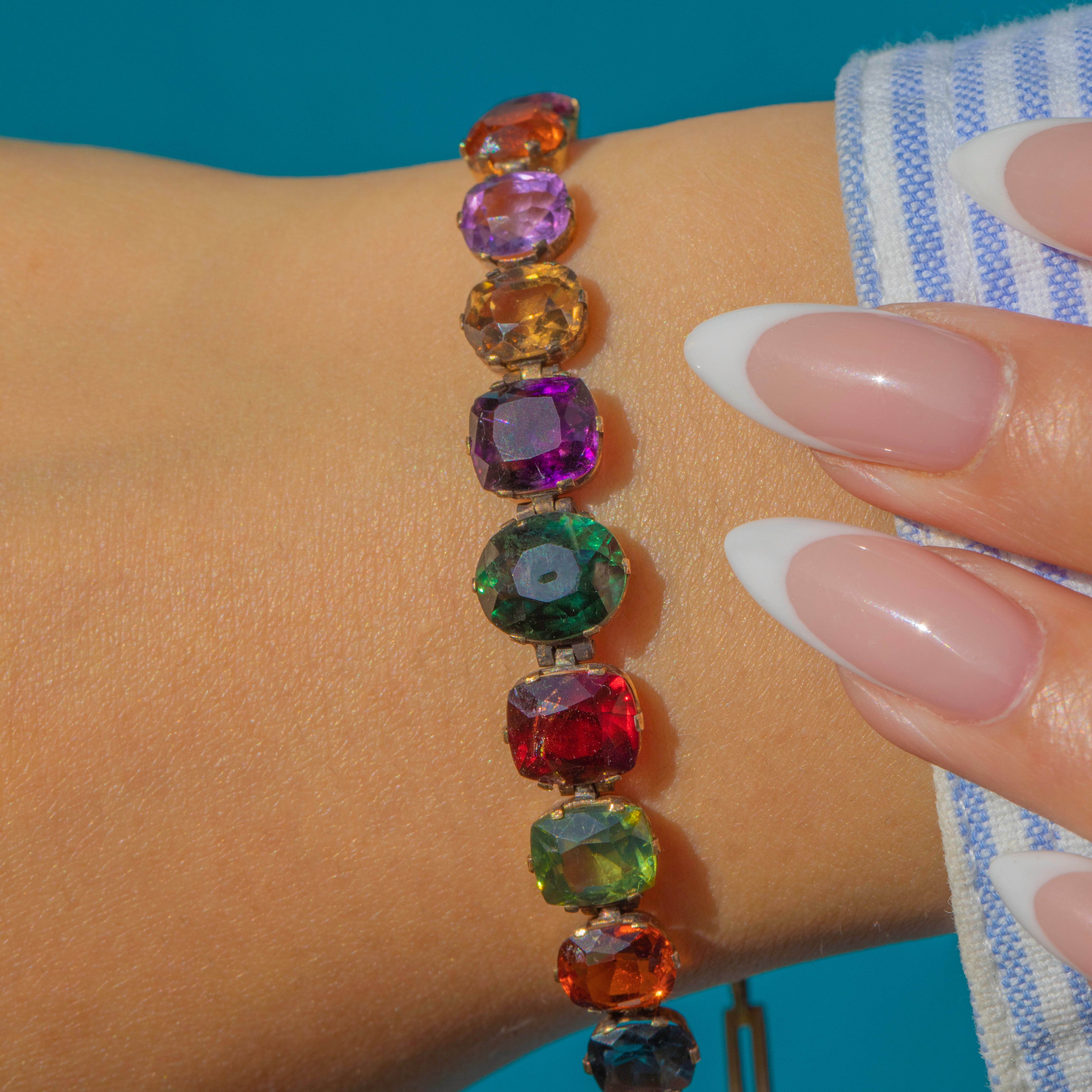 A joyful harlequin line bracelet in warm 9ct Gold, graduating through vivid jewel tones. Cushions and ovals in Sapphire, Ruby, Amethyst and Citrine are interspersed with bright Paste for a full-spectrum look that’s pure vintage fun.